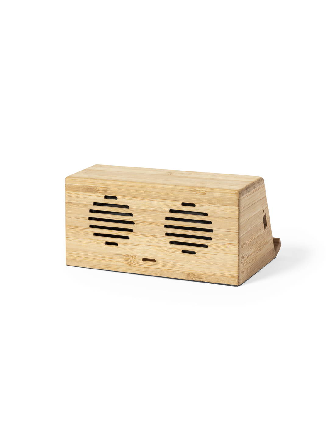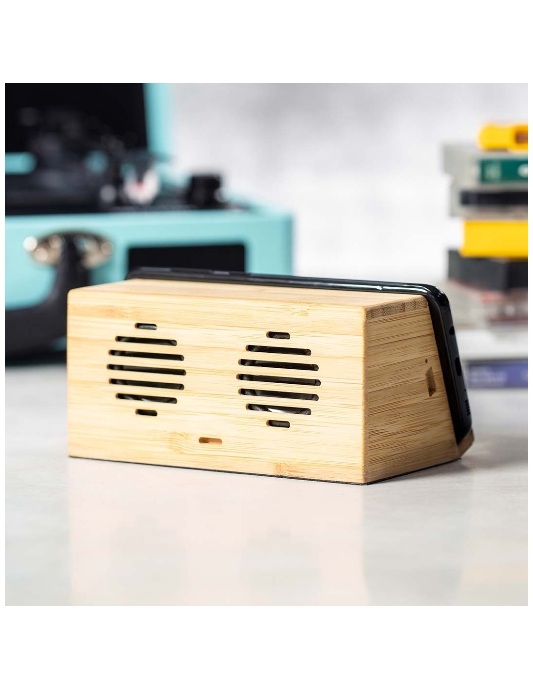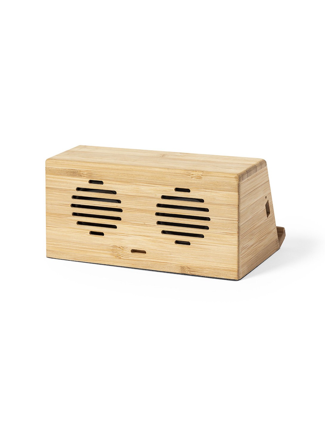 Altavoz cargador inalámbrico de inducción, de línea nature y carga 10W. Con soporte para smartphone integrado y 2 altavoces de 3W cada uno. Fabricado en bambú procedente de cortes naturales, con base antideslizante. Compatible con dispositivos equipados con tecnología de carga inalámbrica y recargable mediante cable USB -incluido-. Amplia superficie de marcaje y presentado en atractiva caja de diseño eco.