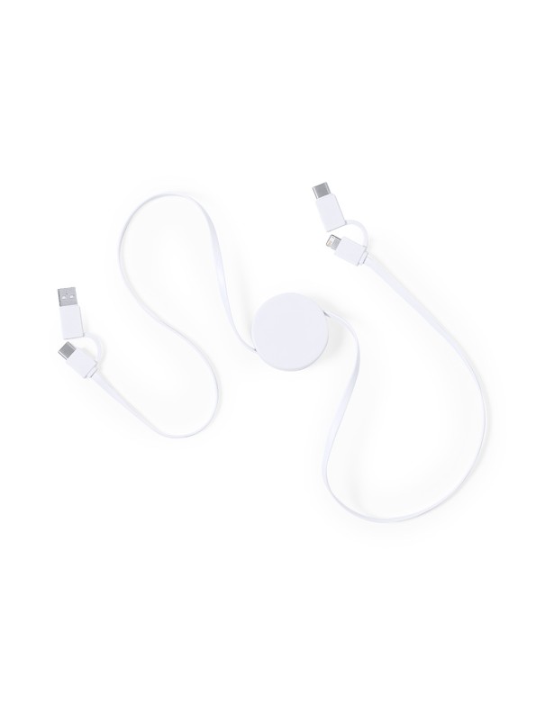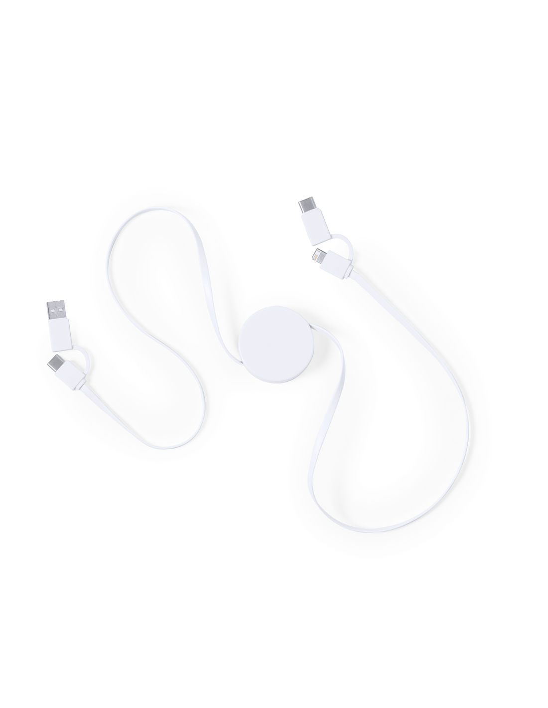 Cargador extensible de diseño ultra compacto. Conexiones Tipo C (entrada y salida), y dual Micro USB/Lightning. Función cargador y transferencia de datos. Amplia superficie de marcaje y presentado en bolsa individual.
