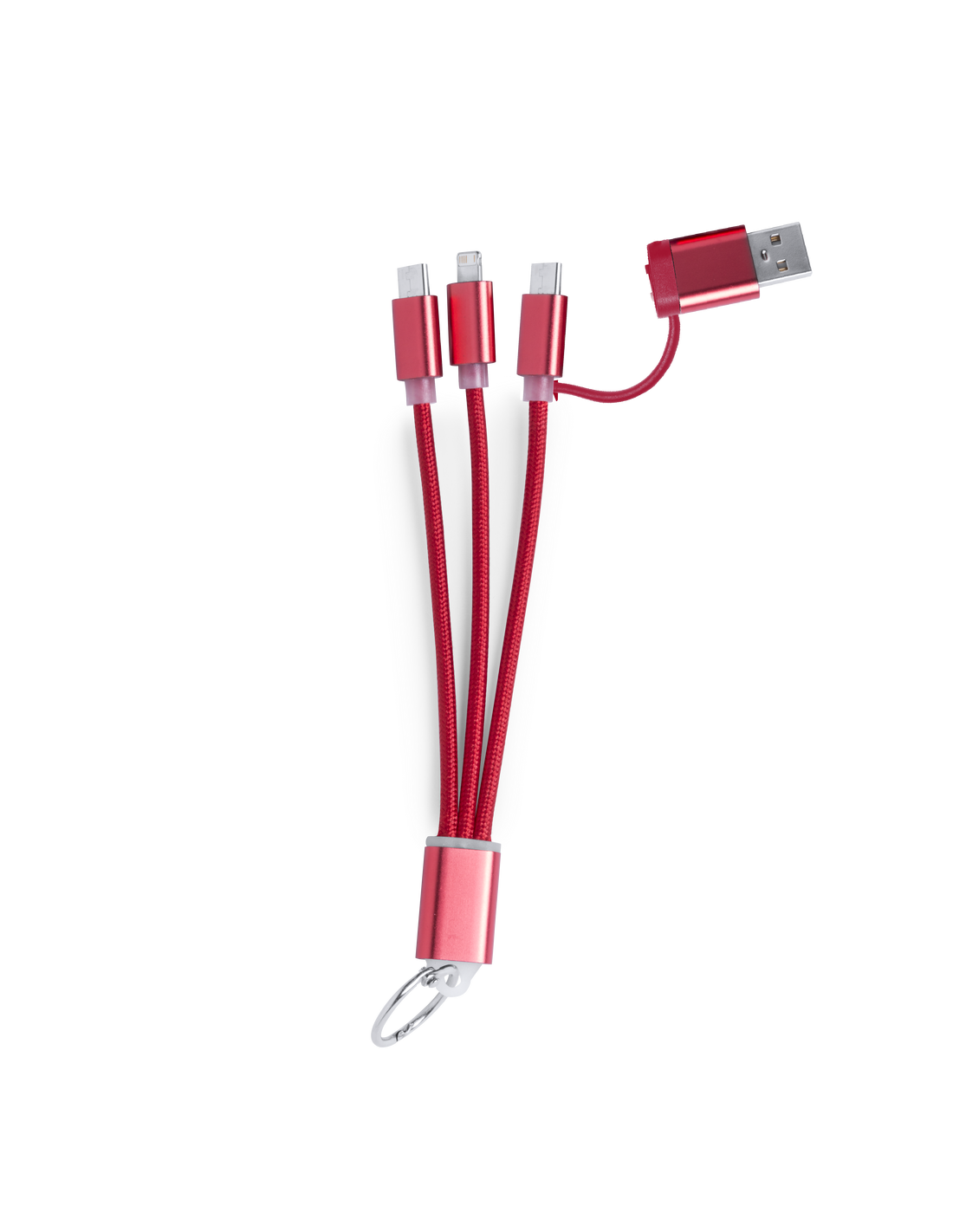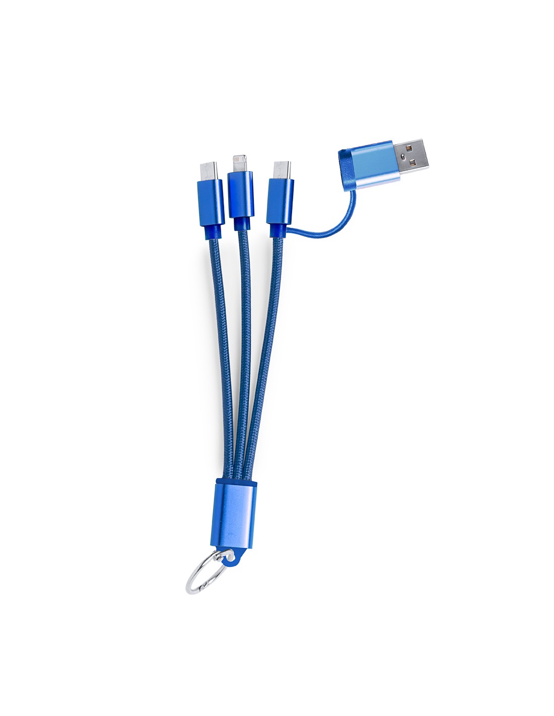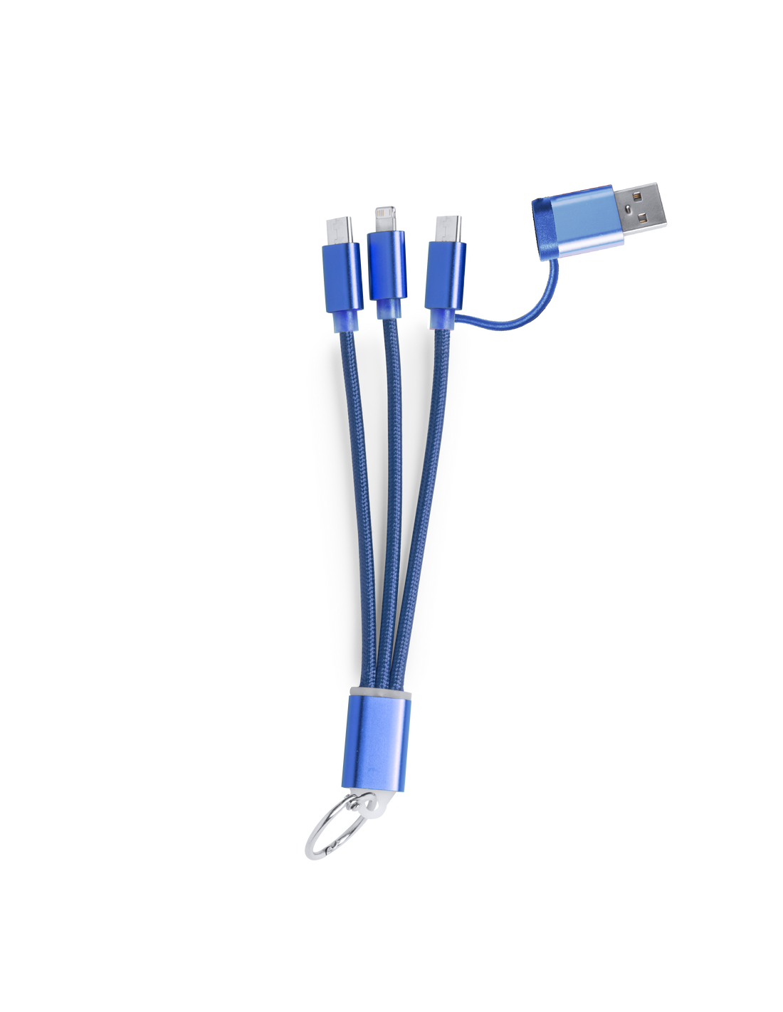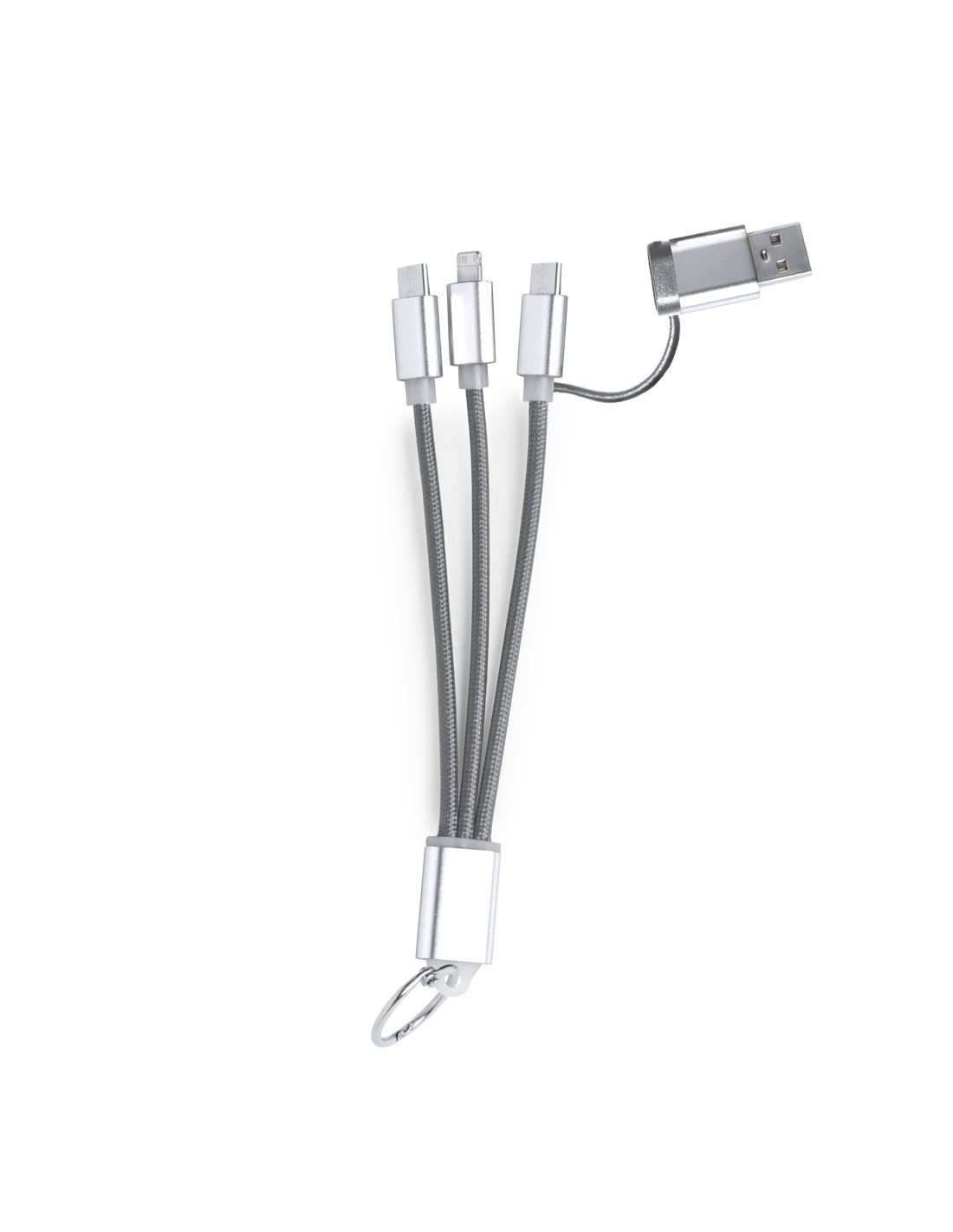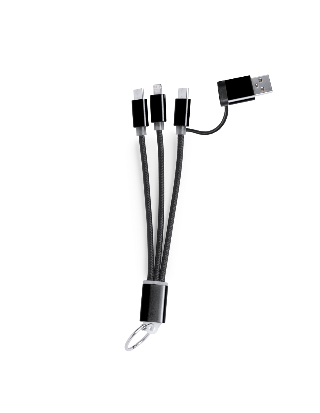 Cable cargador con conexión dual micro USB/Lightning y tipo C (entrada y salida). Conectores de aluminio y chapa especialmente diseñada para marcaje en láser.