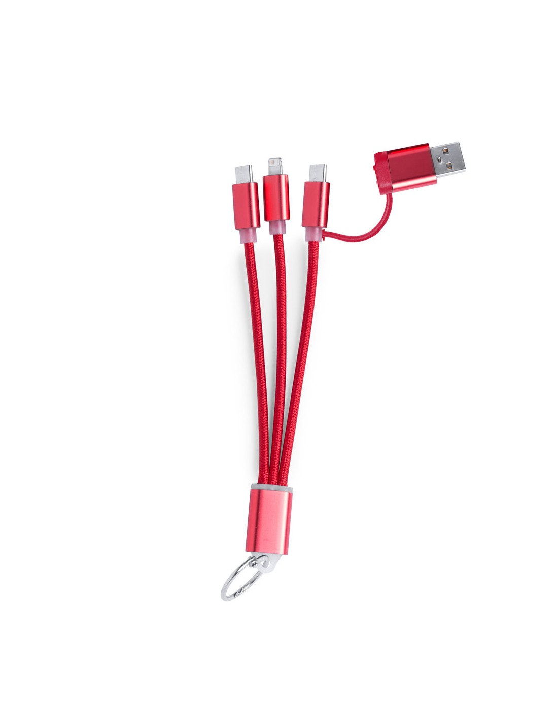 Cable cargador con conexión dual micro USB/Lightning y tipo C (entrada y salida). Conectores de aluminio y chapa especialmente diseñada para marcaje en láser.