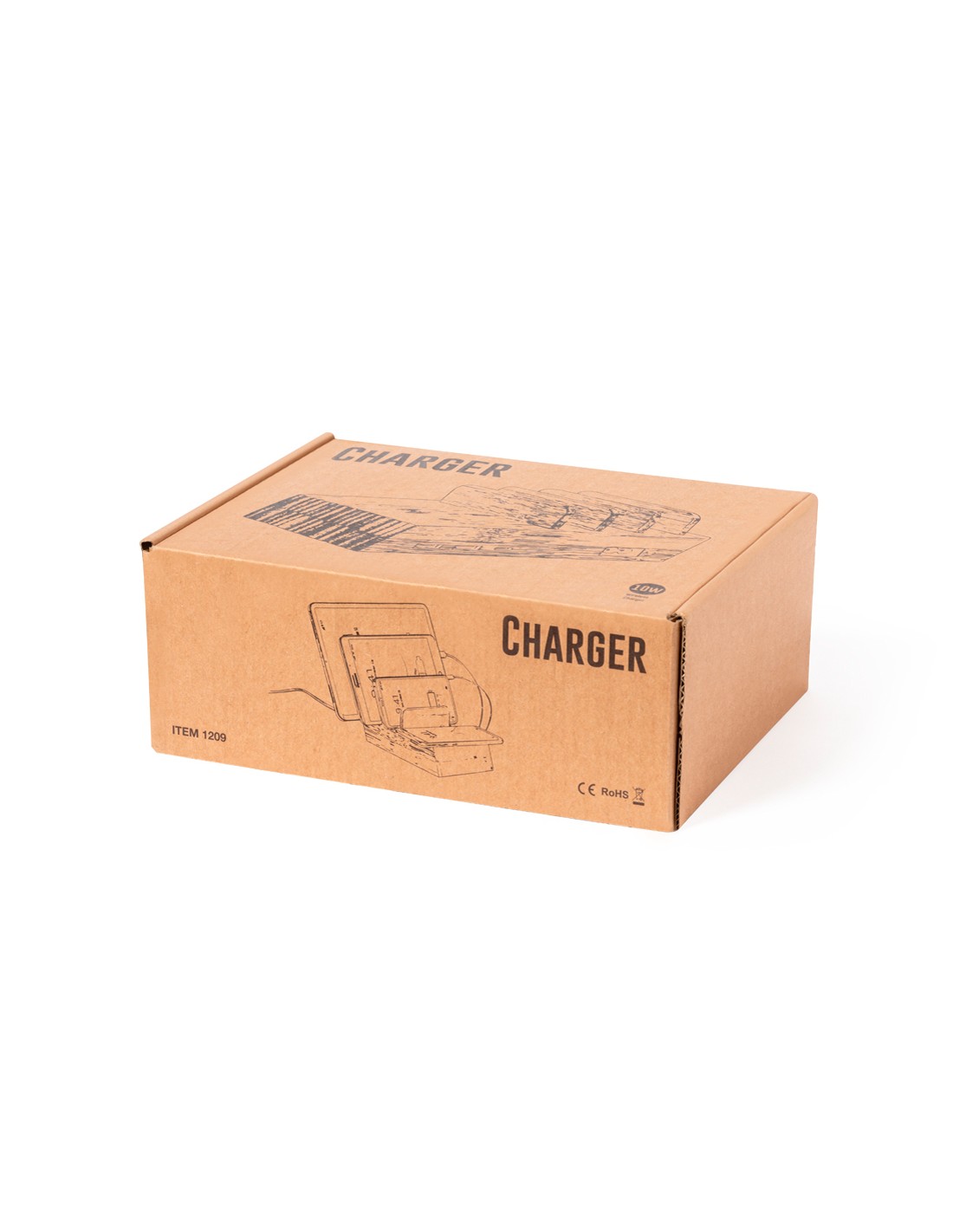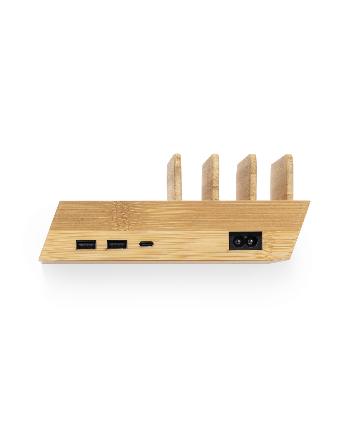 Estación de carga inalámbrica de línea nature, multidispositivo y de carga 10W, capaz de cargar simultáneamente hasta 4 dispositivos. Fabricada en bambú. Incluye 2 salidas USB y 1 salida Tipo C compatible con dispositivos equipados con tecnología de carga inalámbrica. Cable de conexión de 150 cm con clavija europea, con amplia superficie de marcaje y presentado en atractiva caja de diseño eco. Disponible manual de instrucciones en español e inglés. En cumplimiento con los requisitos de seguridad: Sistema de protección contra sobrecalentamiento.Sistema de protección contra sobrecarga.Sistema de bloqueo para evitar cortocircuitos.