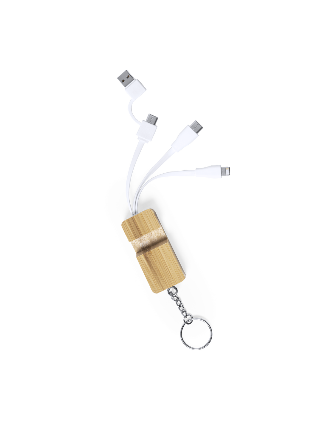 Cargador de línea nature con llavero y soporte para smartphone. Fabricado en resistente bambú de acabado lacado, con conexión tipo C (entrada y salida) y dual micro USB / Lightning. Presentado en atractiva caja individual de diseño eco.