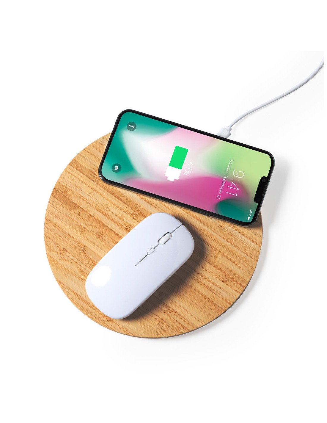 Alfombrilla cargador fabricada en resistente bambú natural, para ayudar a la sostenibilidad del planeta. Con cargador inalámbrico integrado de 10W -cable micro USB incluido-. Compatible con dispositivos equipados con tecnología de carga inalámbrica. Con base antideslizante y presentada en atractiva caja de diseño eco. Disponible manual de instrucciones en español e inglés.
