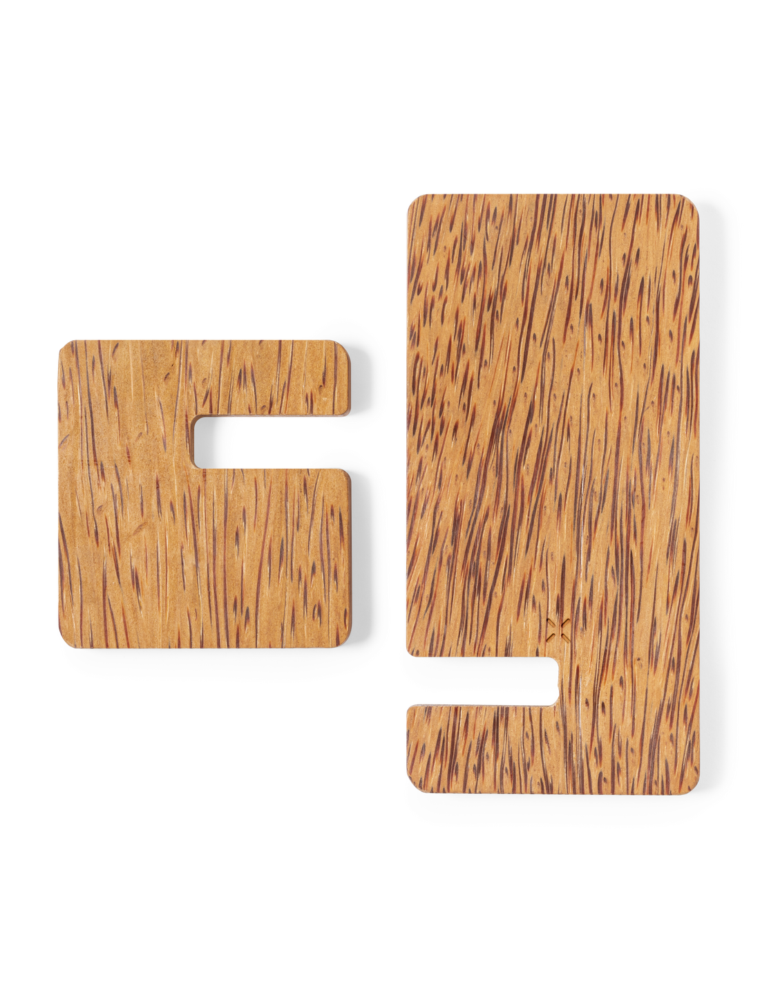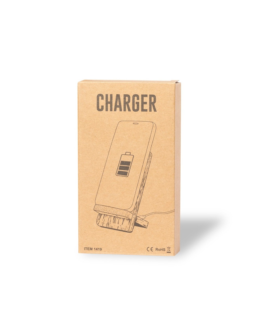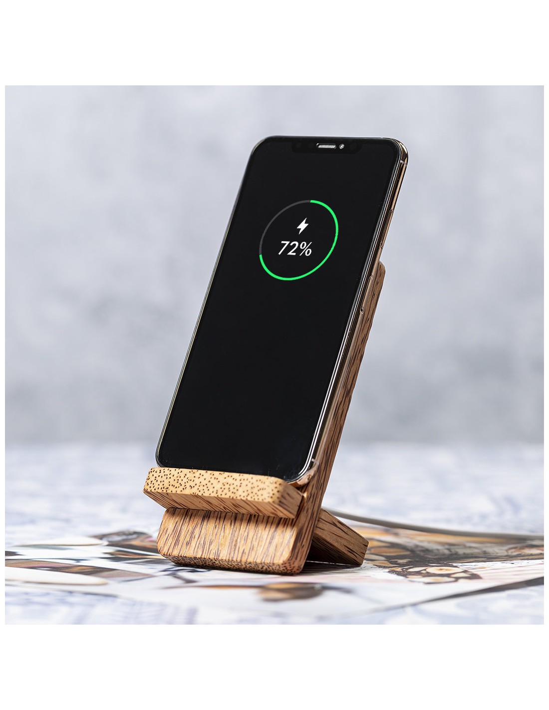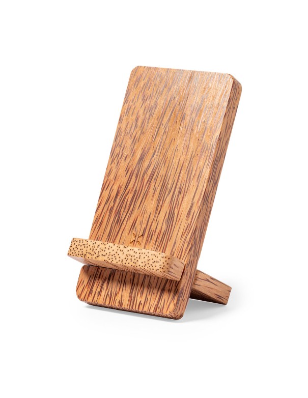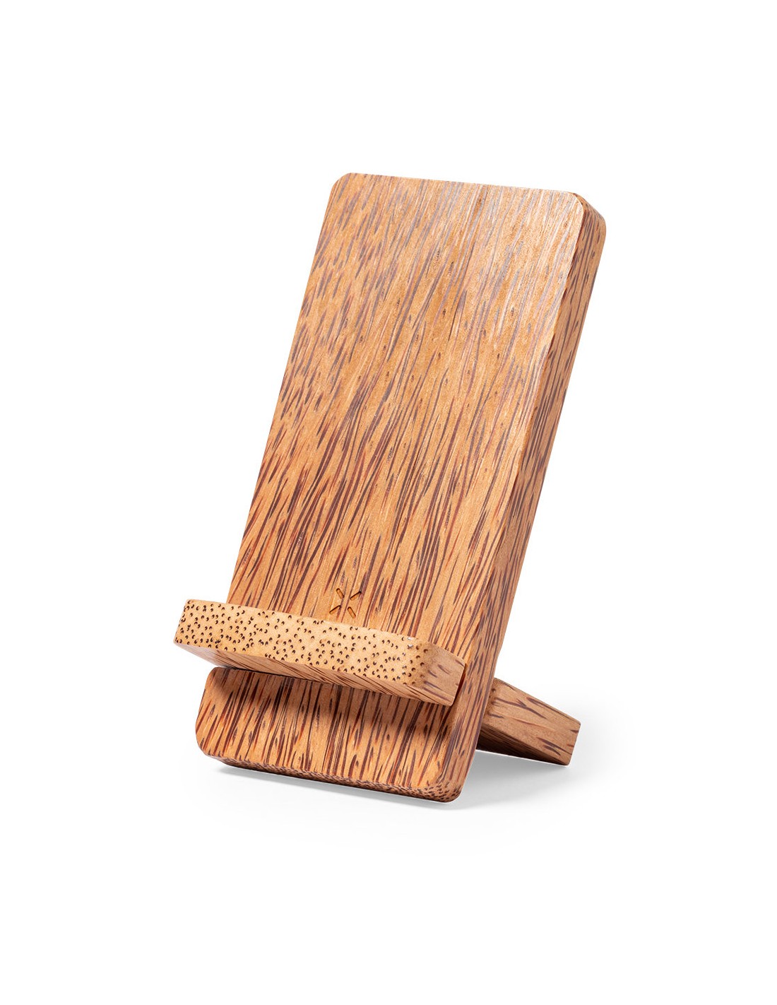 Cargador inalámbrico 15W de línea nature con función soporte para smartphone y fabricado en coco. Tras el consumo de su fruto, del coco y su planta se pueden obtener multitud de productos, contribuyendo a la sostenibilidad del planeta y fomentando el uso de materias primas naturales. Compatible con dispositivos equipados con tecnología de carga inalámbrica. Amplia superficie de marcaje y presentado en caja individual de diseño eco en cartón kraft.