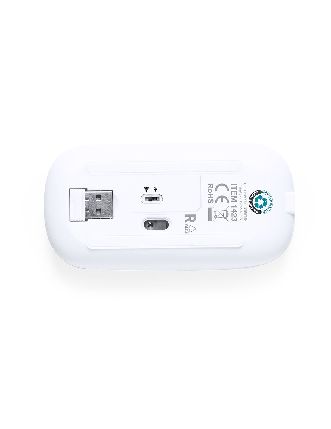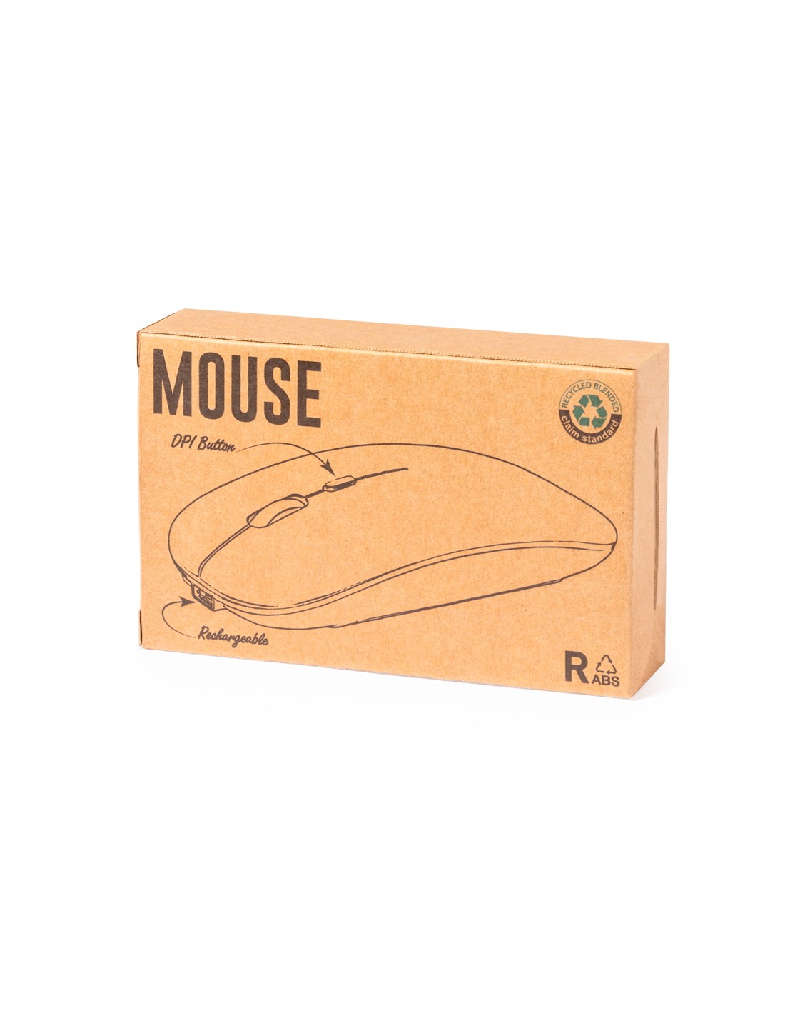 Ratón óptico inalámbrico con diseño ergonómico. Carcasa fabricada en ABS reciclado (RABS) y con certificación RCS, que garantiza el origen reciclado del mismo. Recargable USB (cable incluido) y presentado en caja individual de diseño eco en cartón kraft.