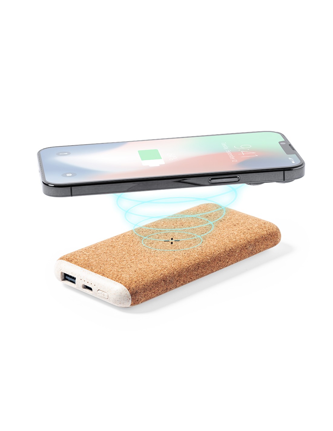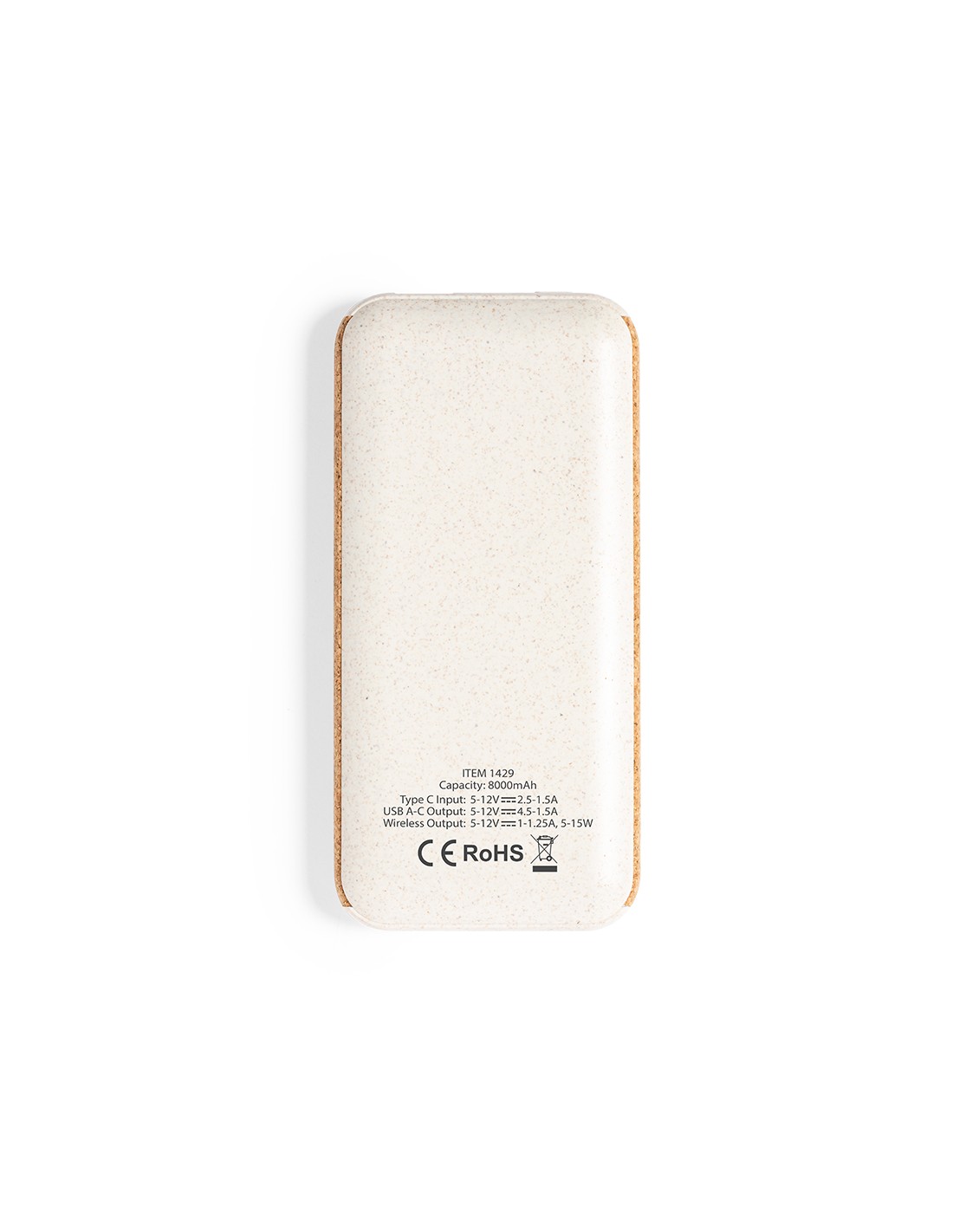 Batería auxiliar externa de línea nature, fabricada en combinación de corcho natural y caña de trigo. De 8.000 mAh de capacidad de carga-. Con cargador inalámbrico integrado 15W, con conector de entrada/salida Tipo C + salida USB. Presentada en caja individual de diseño eco en cartón kraft. Las capacidades mostradas en todas nuestras baterías auxiliares externas son reales, incorporando todas ellas baterías de grado A y no recicladas, con una vida útil de al menos 500 ciclos de carga y según normativa CE. Además, están fabricadas conforme a los estándares RoHS y en cumplimiento con los siguientes requisitos de seguridad: Sistema de protección contra sobrecarga del power bank. Sistema de protección contra descarga completa que proporciona una mayor durabilidad del power bank. Sistema de bloqueo para evitar cortocircuitos. Sistema de transferencia de carga constante, acorde con la capacidad del dispositivo de destino.