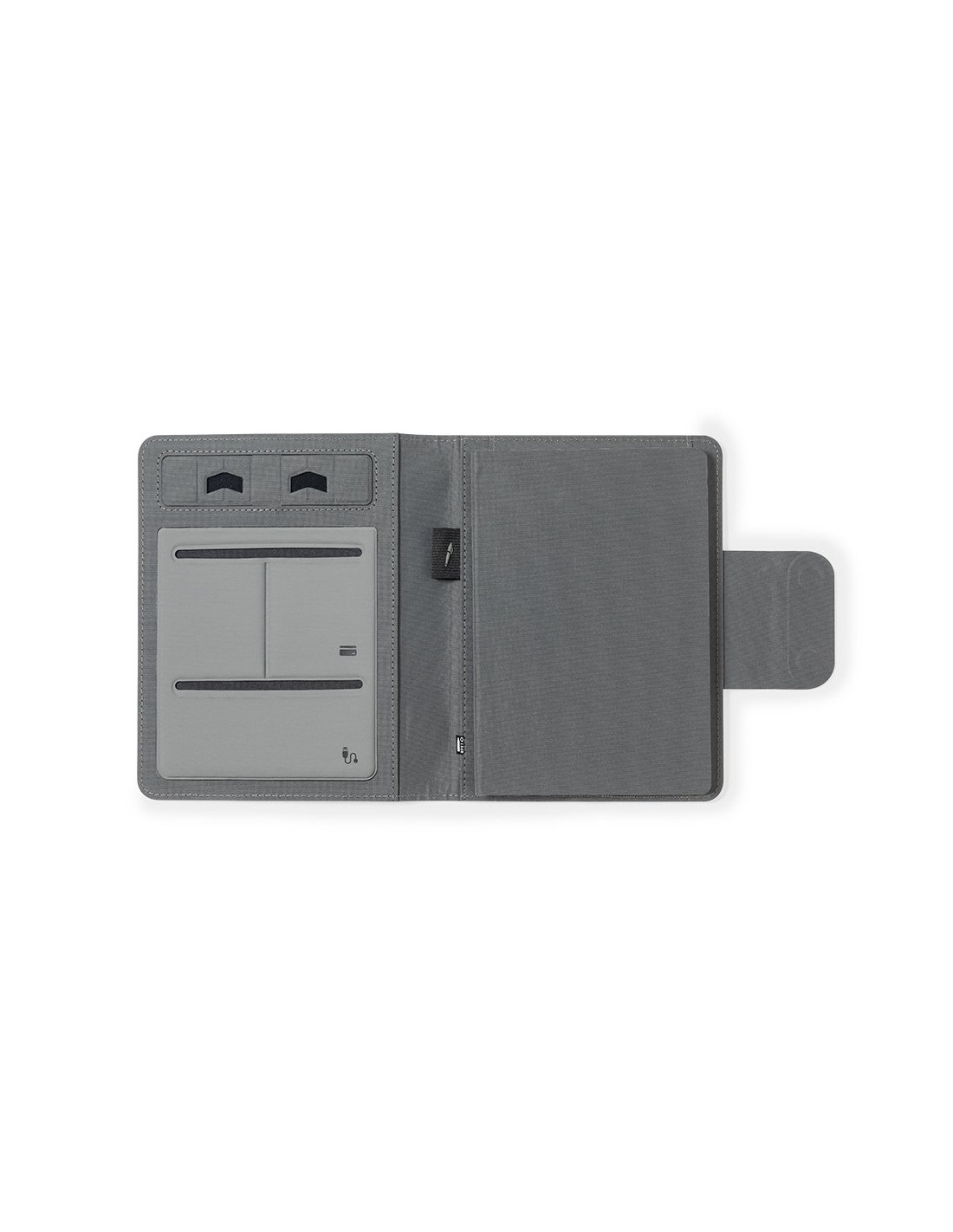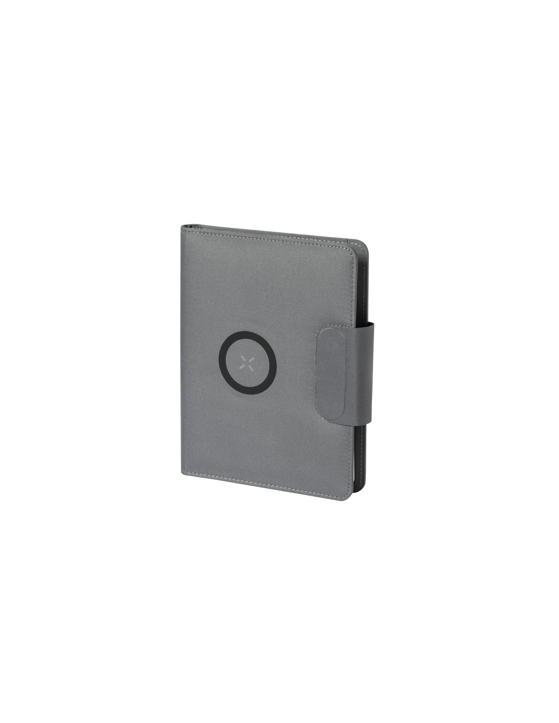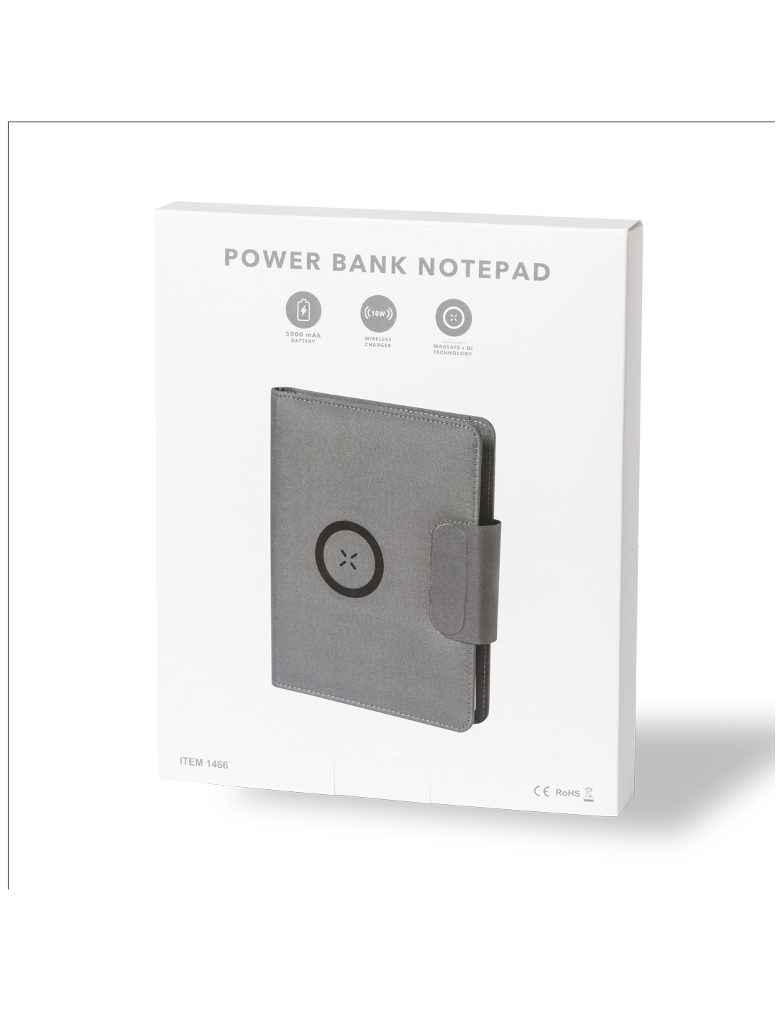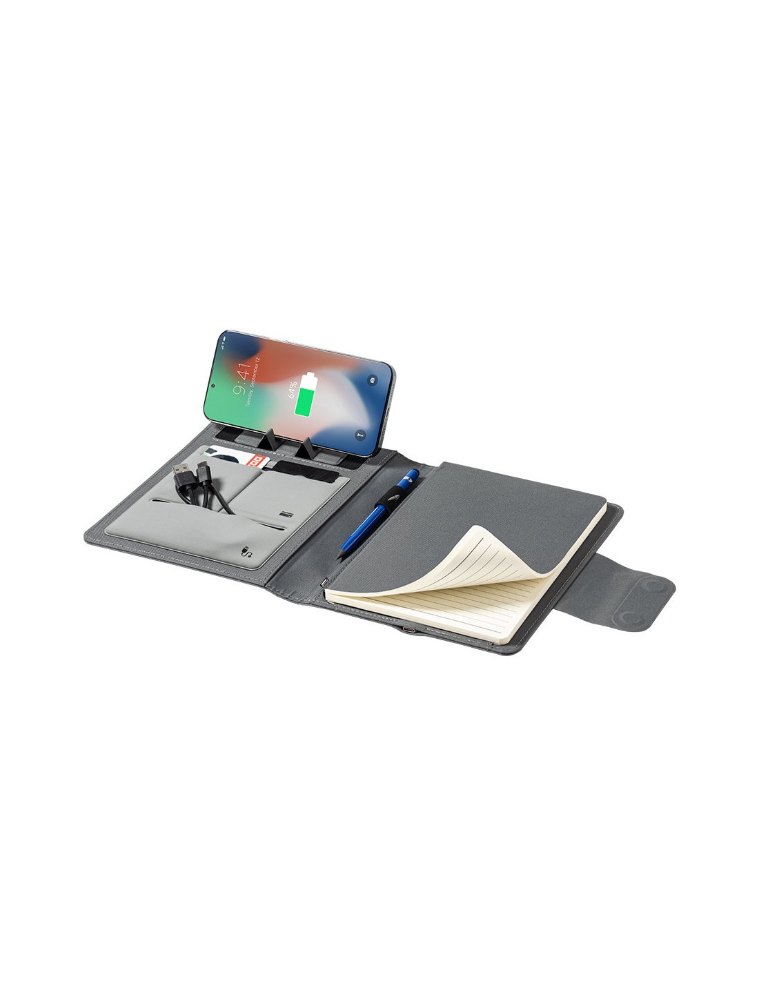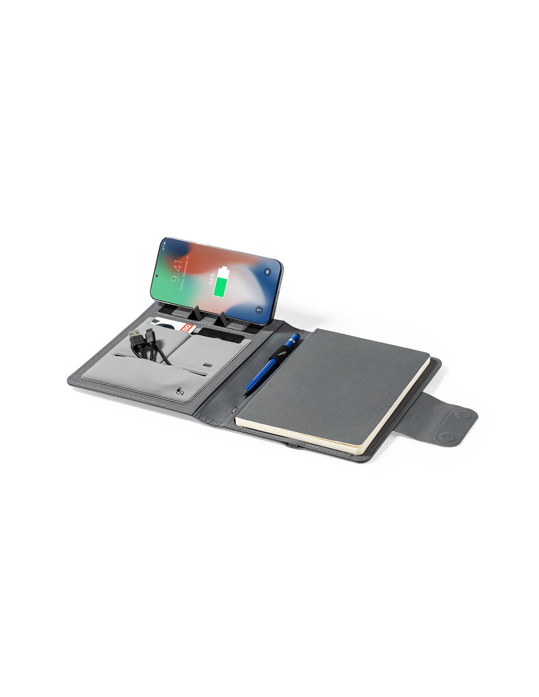 Carpeta/bloc multifunción fabricada en poliéster 300D RPET, elaborado a partir de plástico reciclado, para así fomentar la reutilización de residuos plásticos y ayudar a la sostenibilidad del planeta. Con cierre magnético y etiqueta interior con distintivo RPET. Incluye cargador inalámbrico 10W integrado en portada, con fijación magnética para poder usar el dispositivo mientras se produce la carga del mismo e incluyendo anillo adhesivo, válido para todos los dispositivos con tecnología Magsafe y Qi. Batería integrada de 5.000 mAh de capacidad de carga, con puerto Tipo C de entrada/salida y LEDs indicadores de estado de carga, con cable incluido. Interior con soporte para smartphone y multitud de compartimentos para tarjetas, incluidos soporte para bolígrafo y bloc A5 con 65 hojas de disposición a una raya. Presentada en atractiva caja individual de diseño. Las capacidades mostradas en todas nuestras baterías auxiliares externas son reales, incorporando todas ellas baterías de grado A y no recicladas, con una vida útil de al menos 500 ciclos de carga y según normativa CE. Además, están fabricadas conforme a los estándares RoHS y en cumplimiento con los siguientes requisitos de seguridad: Sistema de protección contra sobrecarga del power bank. Sistema de protección contra descarga completa que proporciona una mayor durabilidad del power bank. Sistema de bloqueo para evitar cortocircuitos. Sistema de transferencia de carga constante, acorde con la capacidad del dispositivo de destino.