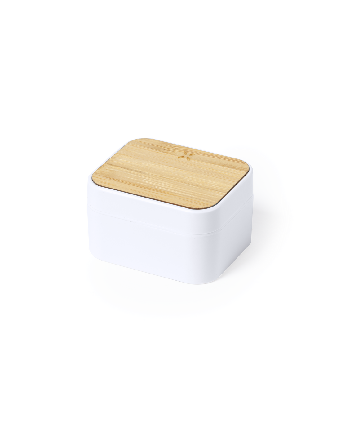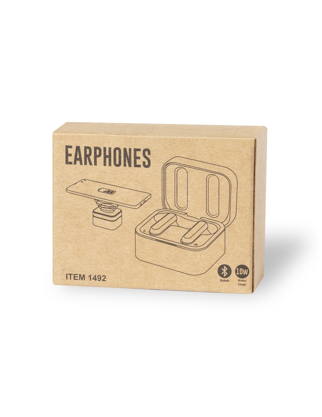 Auriculares intraurales de línea nature. Fabricados en resistente ABS con detalles en bambú en auriculares y base. Conexión Bluetooth 5.0 y función manos libres, con botón de control táctil en el auricular. Incluye cargador inalámbrico 10W integrado en la tapa de bambú de la base de caga. Recargables por USB, con cable Tipo C incluido. Presentados en caja individual de diseño eco en cartón kraft.