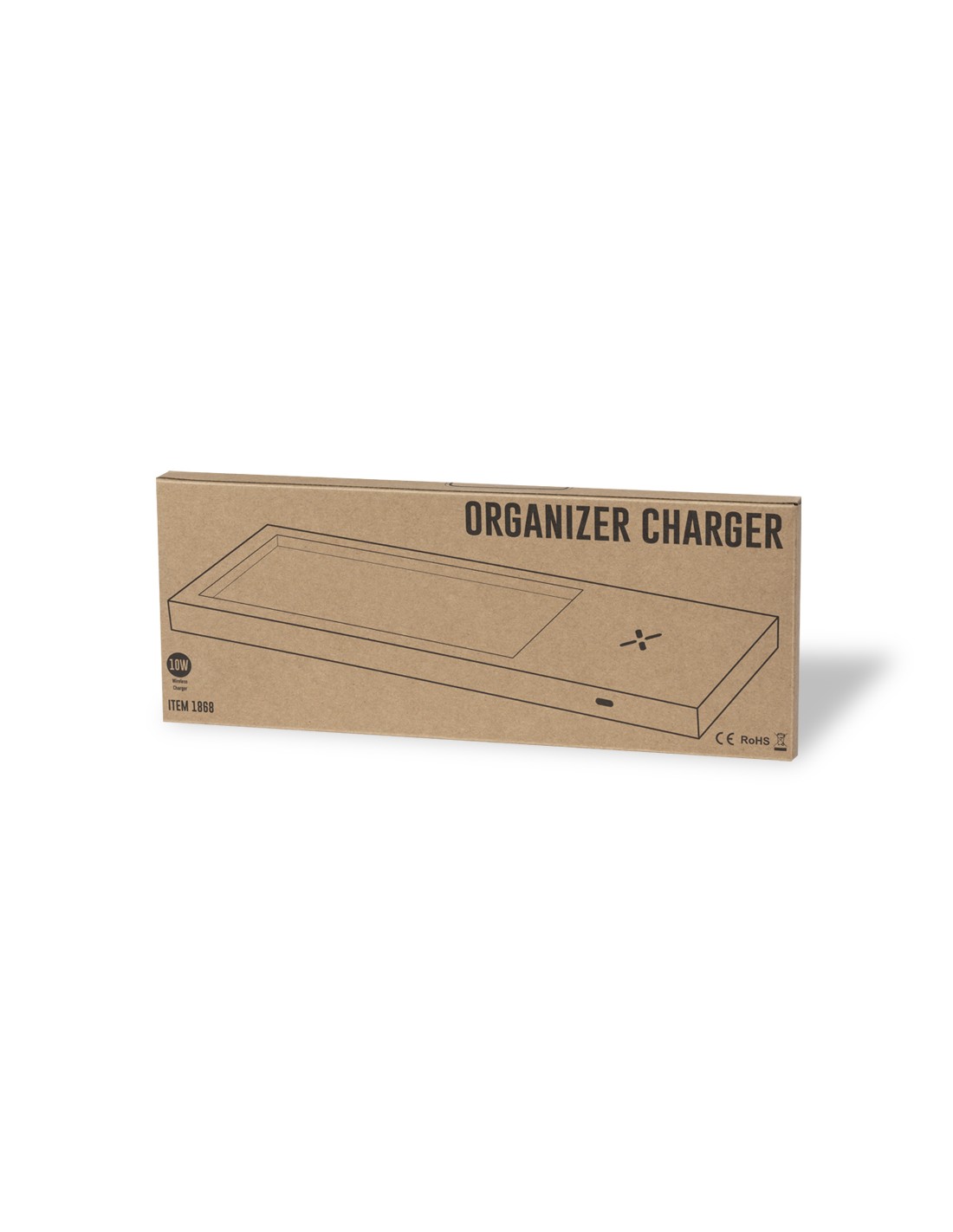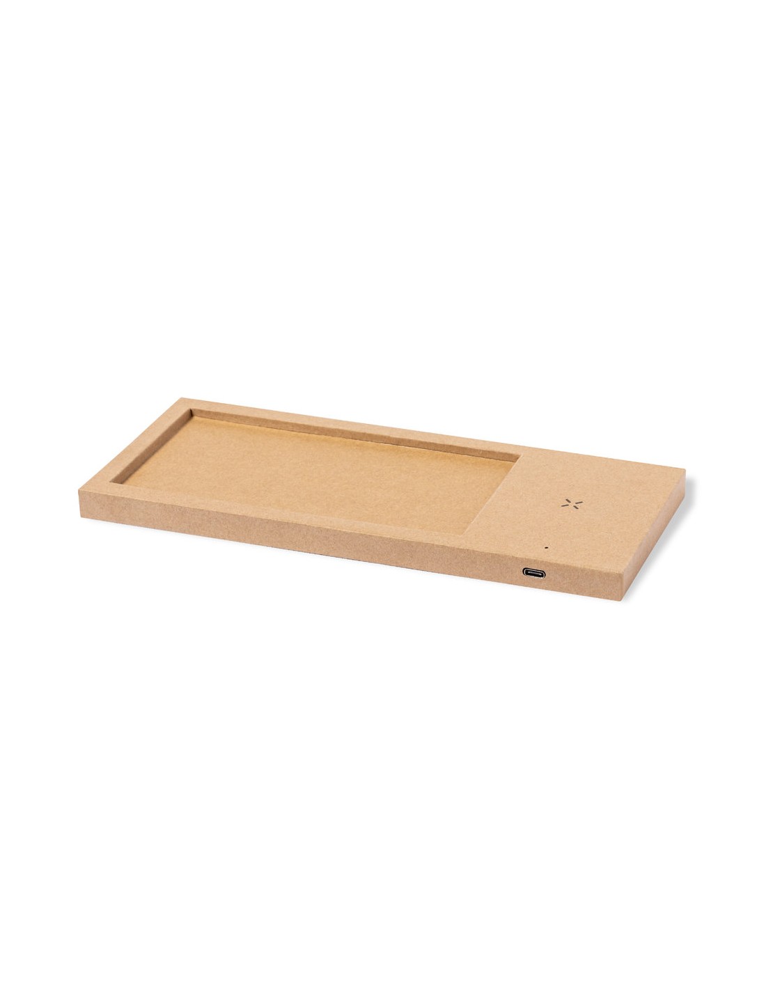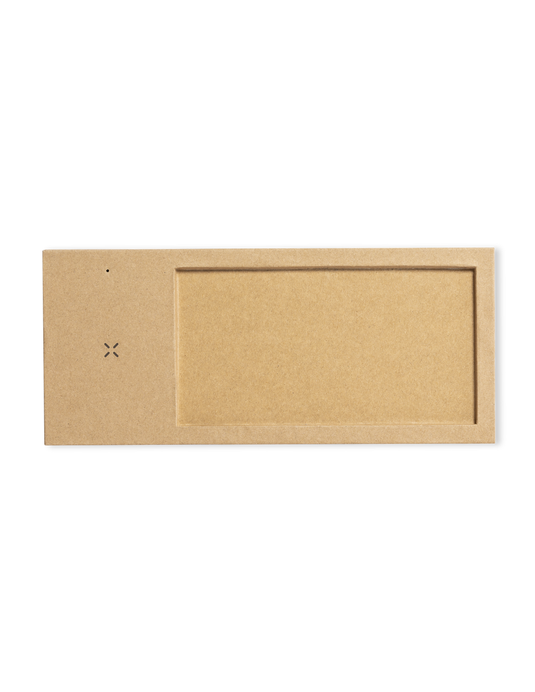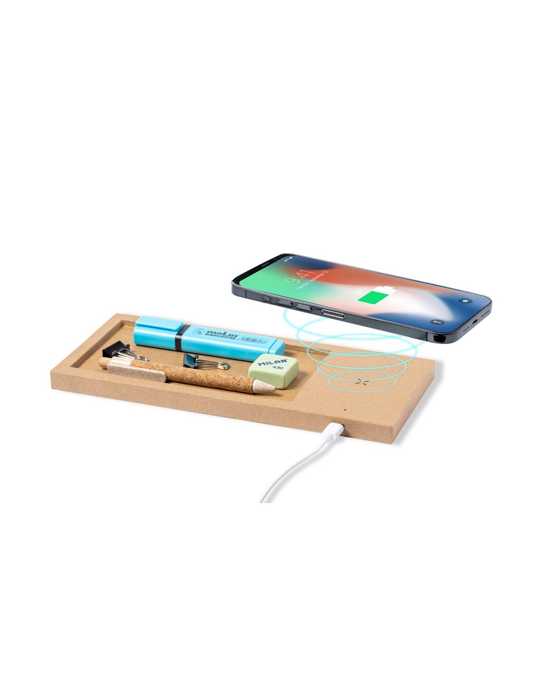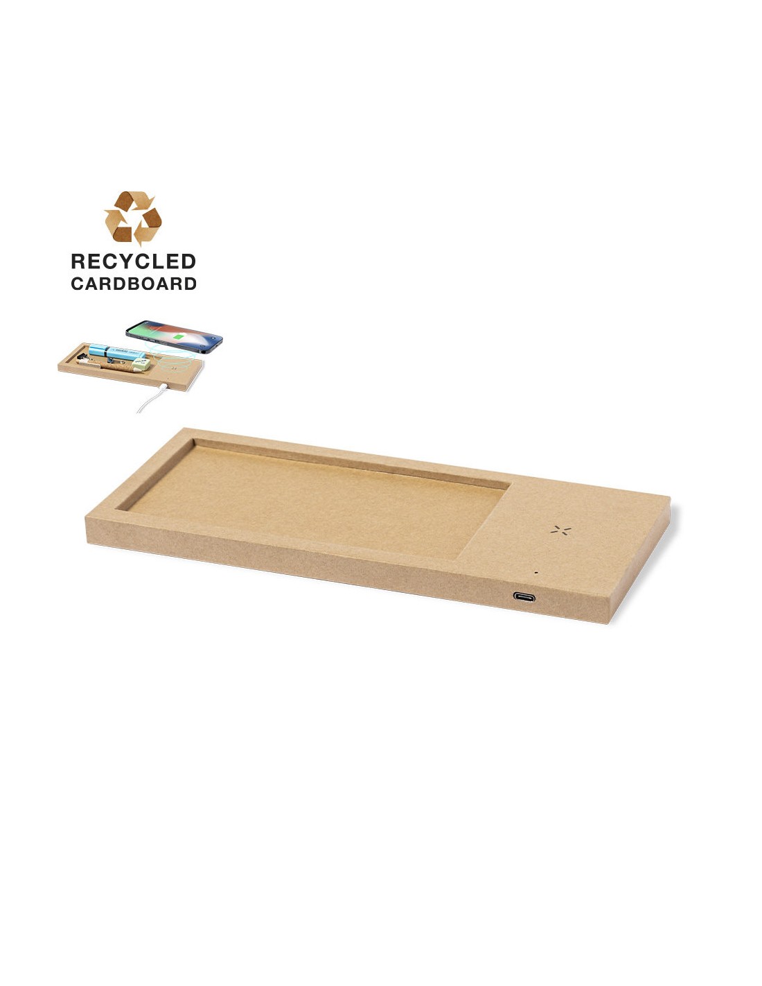 Cargador organizador inalámbrico 10W, fabricado en cartón reciclado y con espacio de almacenaje para artículos de escritorio. Compatible con dispositivos equipados con tecnología de carga inalámbrica Qi, con indicador LED de estado de carga y cable de carga Tipo C incluido. Presentado en caja individual de diseño kraft, con manual de instrucciones en español e inglés.Fabricado conforme a los estándares RoHS y en cumplimiento con los siguientes requisitos de seguridad:Sistema de protección contra sobrecalentamiento.Sistema de protección contra sobrecarga.Sistema de bloqueo para evitar cortocircuitos.