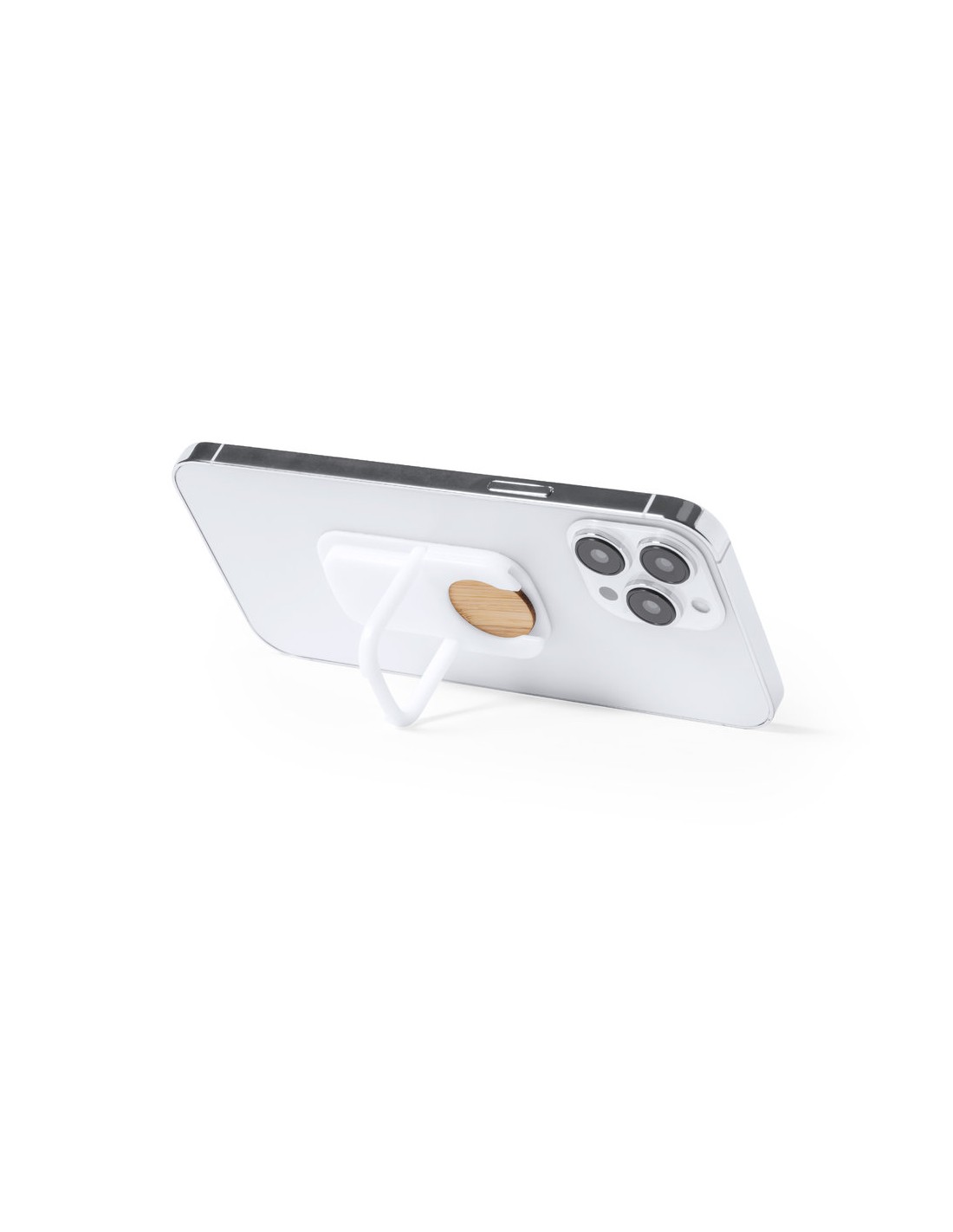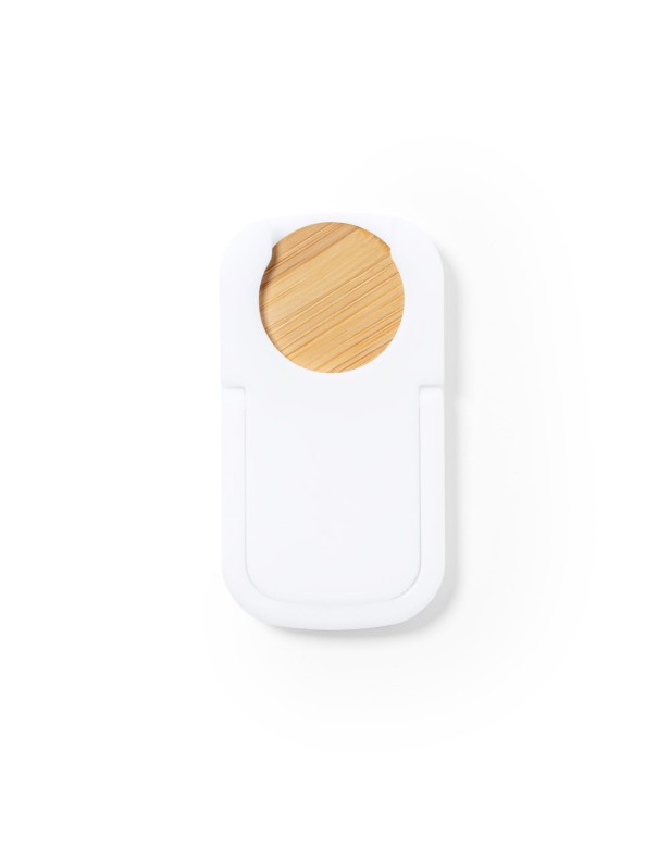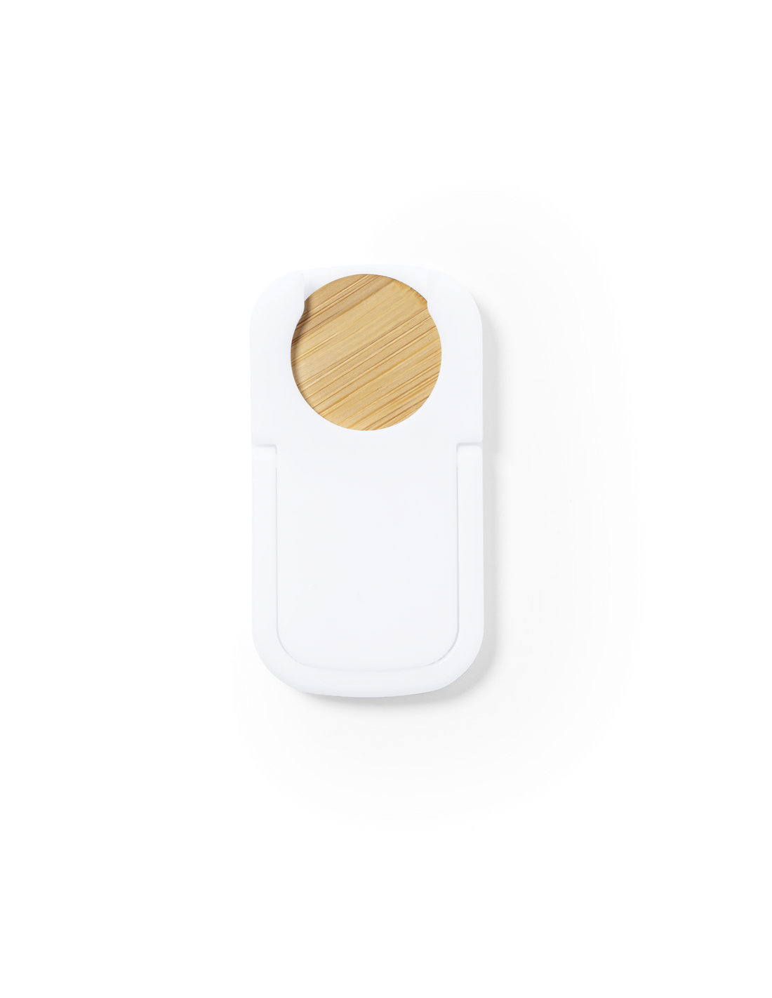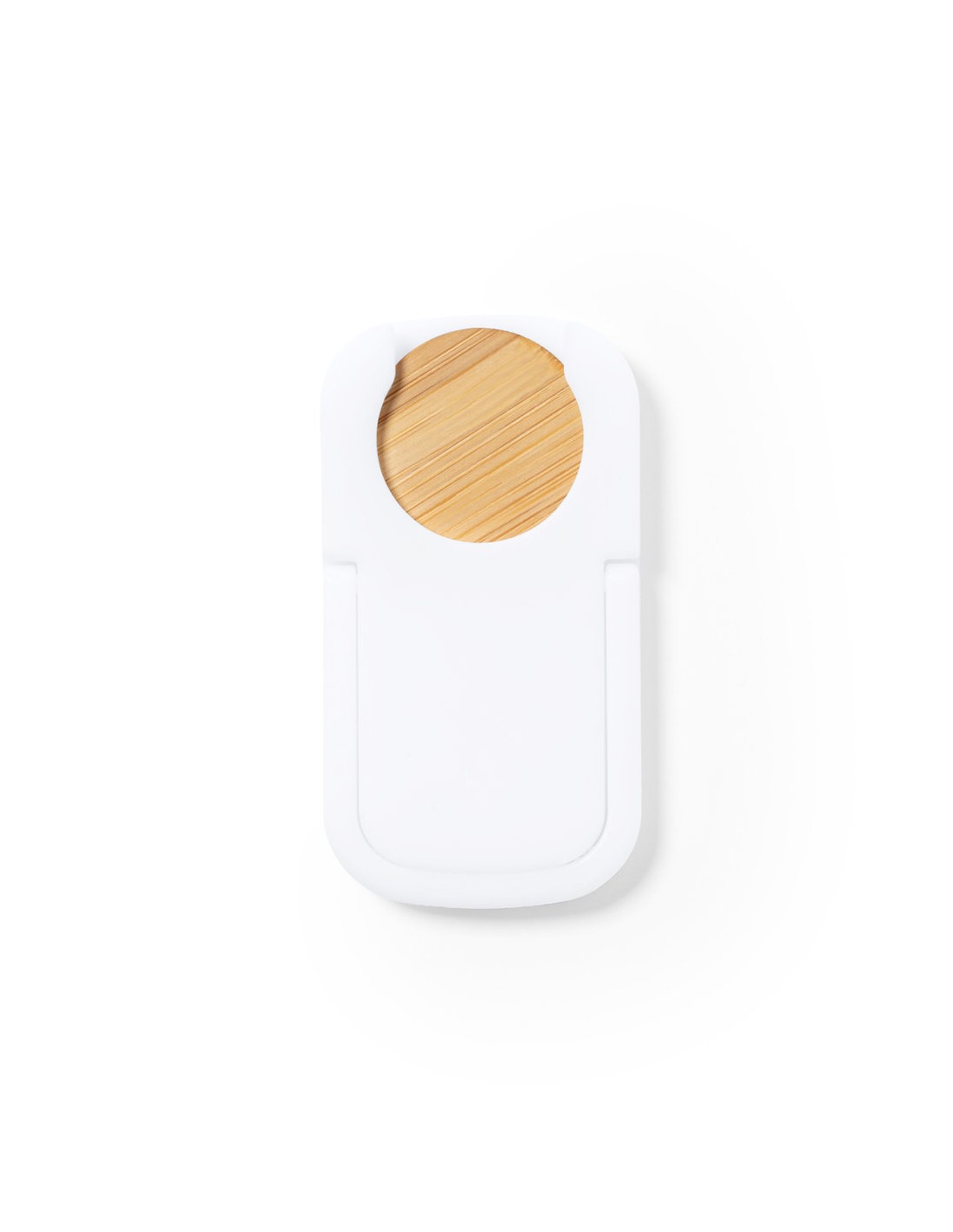 Soporte multifunción para smartphone, con moneda para carro de la compra integrada y anilla/soporte plegable. Cuerpo fabricado en resistente ABS de acabado blanco, con moneda en bambú. Con adhesivo de fijación extra fuerte y libre de residuos al despegarlo del dispositivo.
