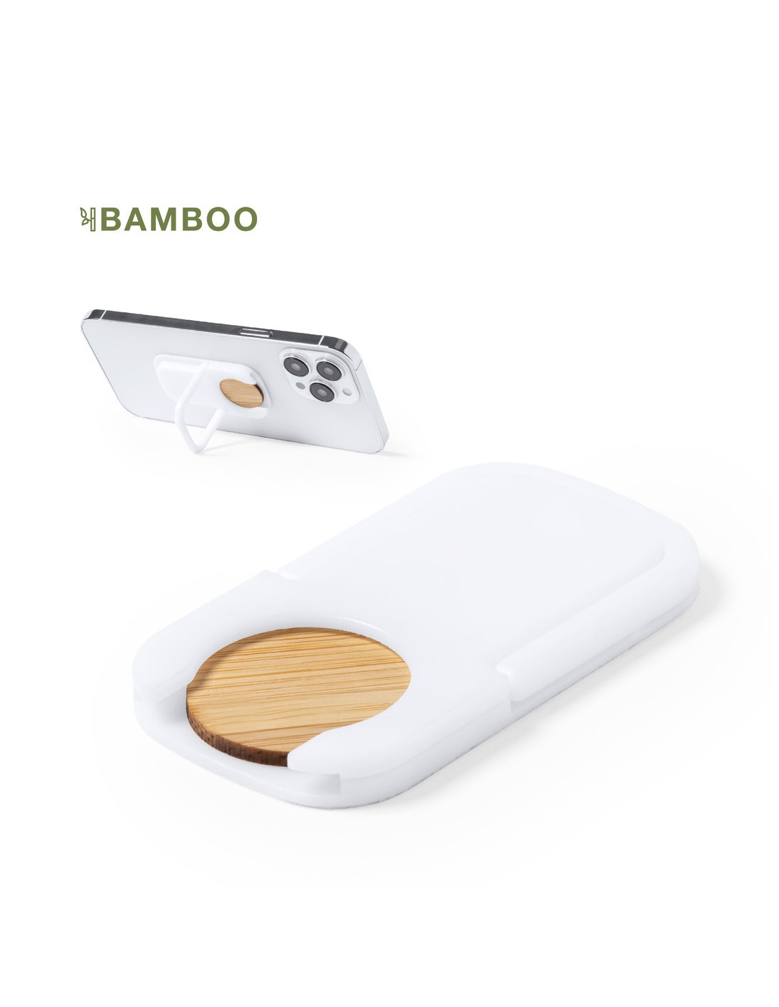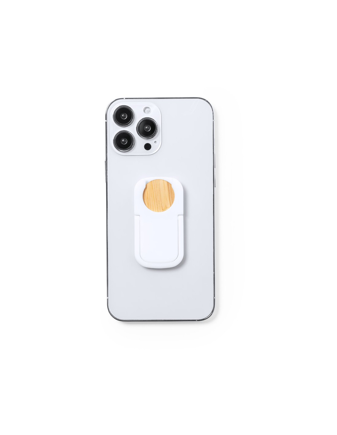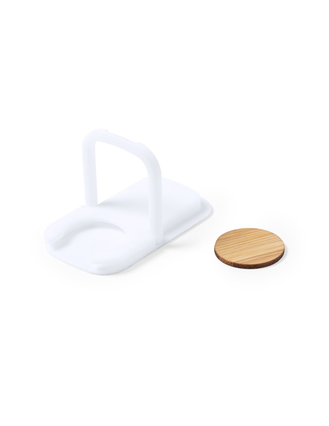 Soporte multifunción para smartphone, con moneda para carro de la compra integrada y anilla/soporte plegable. Cuerpo fabricado en resistente ABS de acabado blanco, con moneda en bambú. Con adhesivo de fijación extra fuerte y libre de residuos al despegarlo del dispositivo.