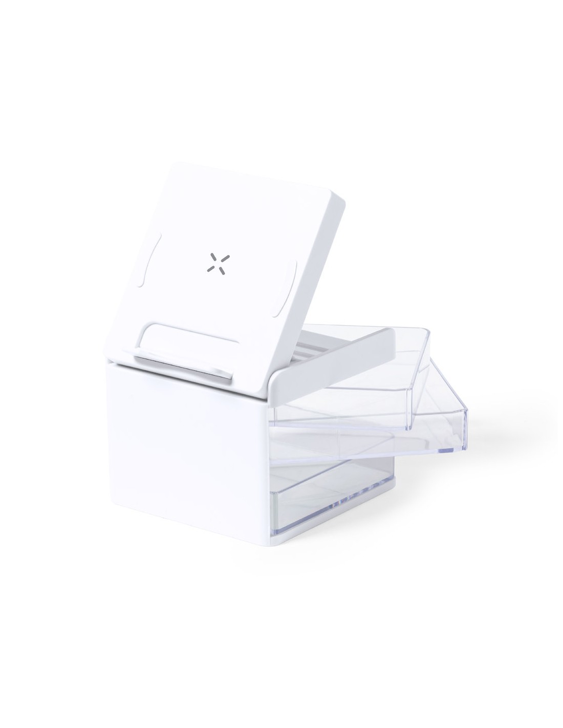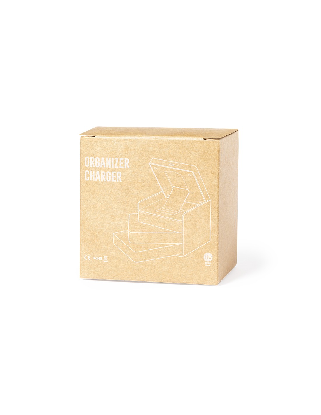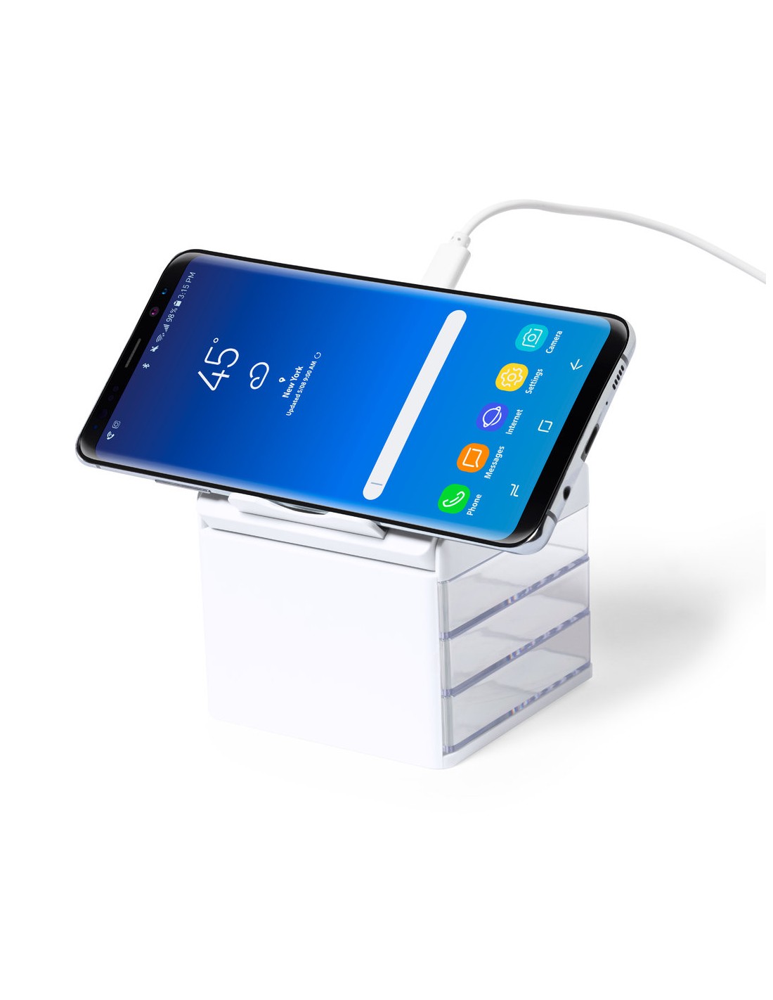 Cargador organizador con soporte para smartphone y cargador inalámbrico 10W integrado, compatible con dispositivos equipados con tecnología de carga inalámbrica Qi. Con 3 compartimentos de almacenaje transparentes y extraíbles. Indicador de estado de carga, con cable de carga Tipo C de 1 m incluido. Base antideslizante y presentado en caja individual de diseño kraft, con manual de instrucciones en español e inglés.Fabricado conforme a los estándares RoHS y en cumplimiento con los siguientes requisitos de seguridad:Sistema de protección contra sobrecalentamiento.Sistema de protección contra sobrecarga.Sistema de bloqueo para evitar cortocircuitos.