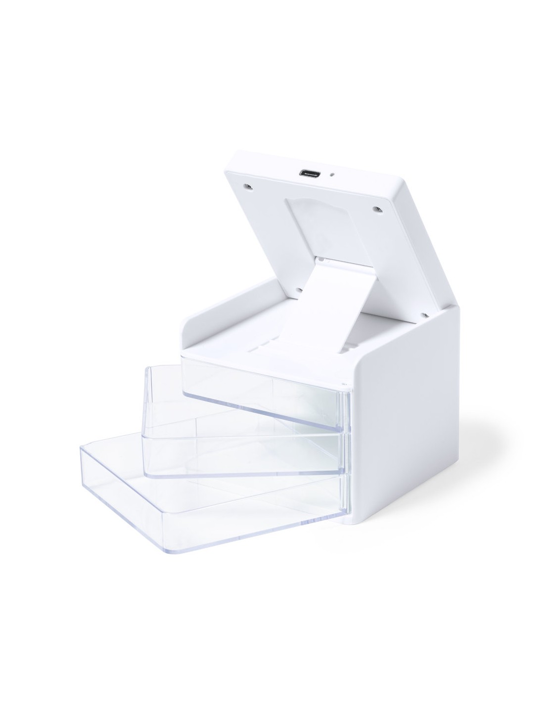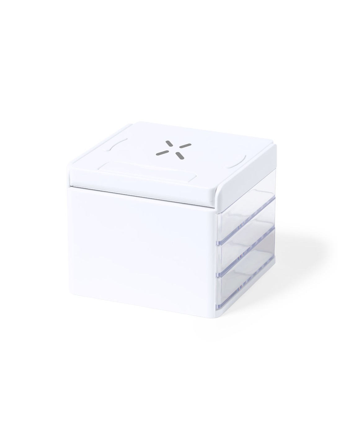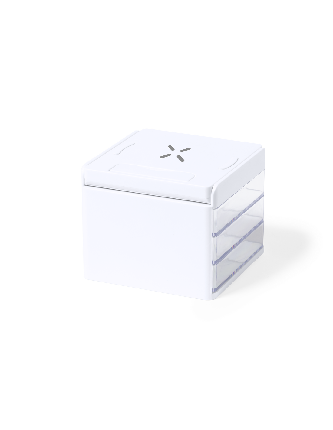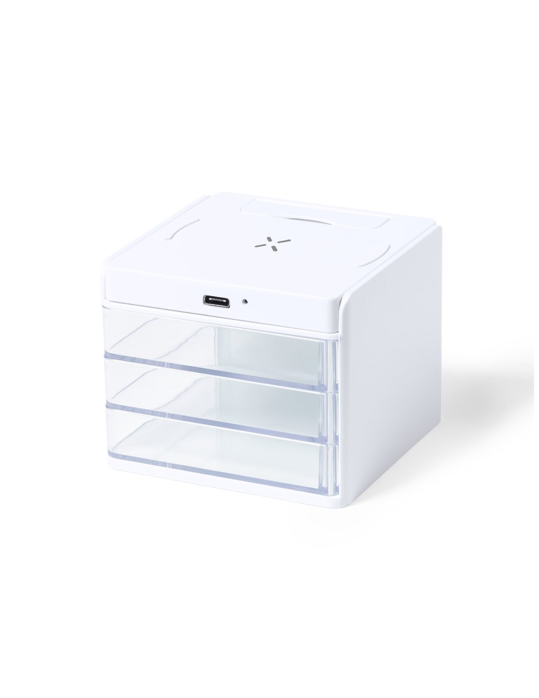 Cargador organizador con soporte para smartphone y cargador inalámbrico 10W integrado, compatible con dispositivos equipados con tecnología de carga inalámbrica Qi. Con 3 compartimentos de almacenaje transparentes y extraíbles. Indicador de estado de carga, con cable de carga Tipo C de 1 m incluido. Base antideslizante y presentado en caja individual de diseño kraft, con manual de instrucciones en español e inglés.Fabricado conforme a los estándares RoHS y en cumplimiento con los siguientes requisitos de seguridad:Sistema de protección contra sobrecalentamiento.Sistema de protección contra sobrecarga.Sistema de bloqueo para evitar cortocircuitos.