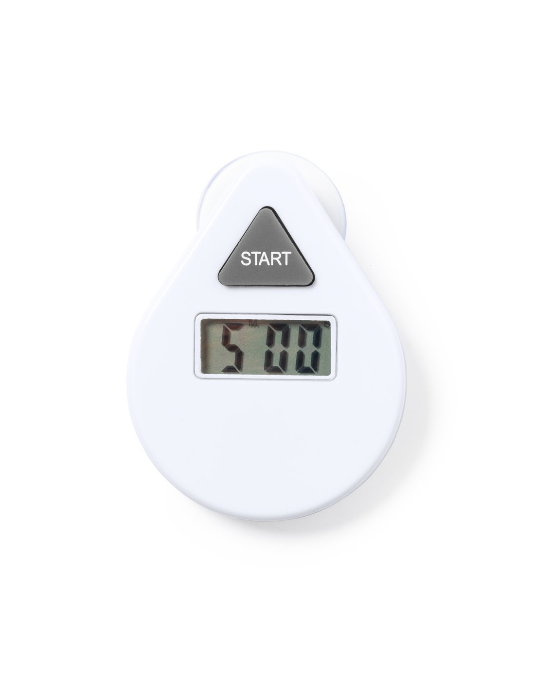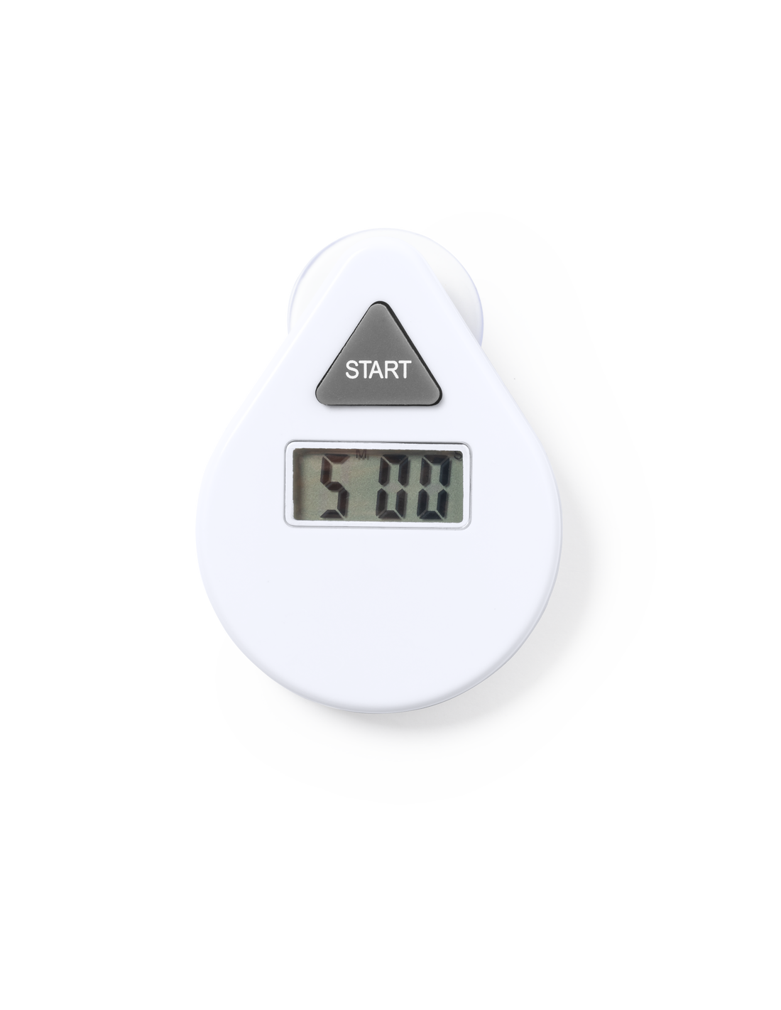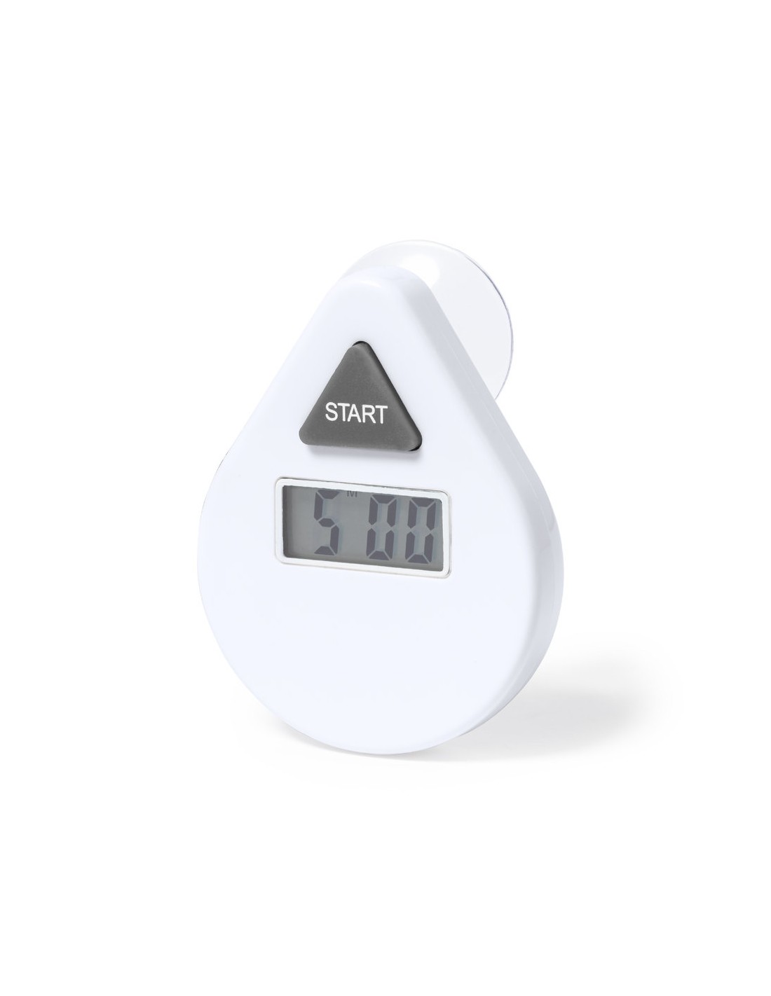 Temporizador fabricado en resistente ABS de acabado blanco y con fijación por ventosa. Pantalla LCD de fácil lectura, con botón de control de cuenta atrás (5 minutos). Alimentación con pila (de botón incluida). Presentada en caja individual de diseño kraft, con manual de instrucciones en español e inglés.