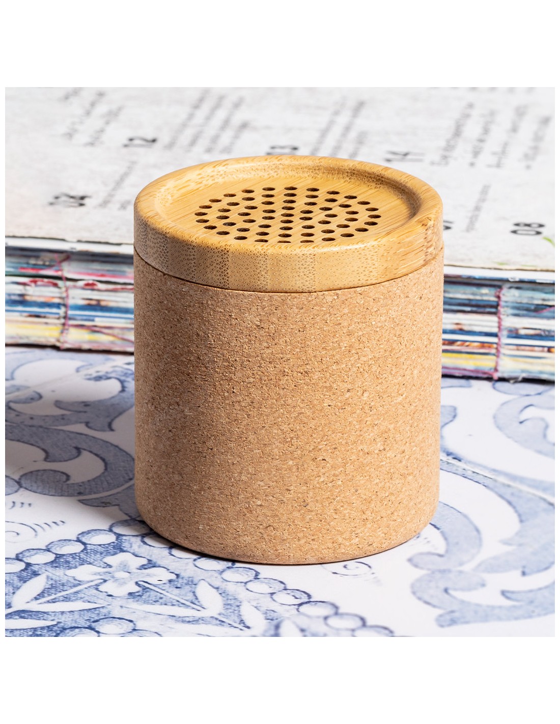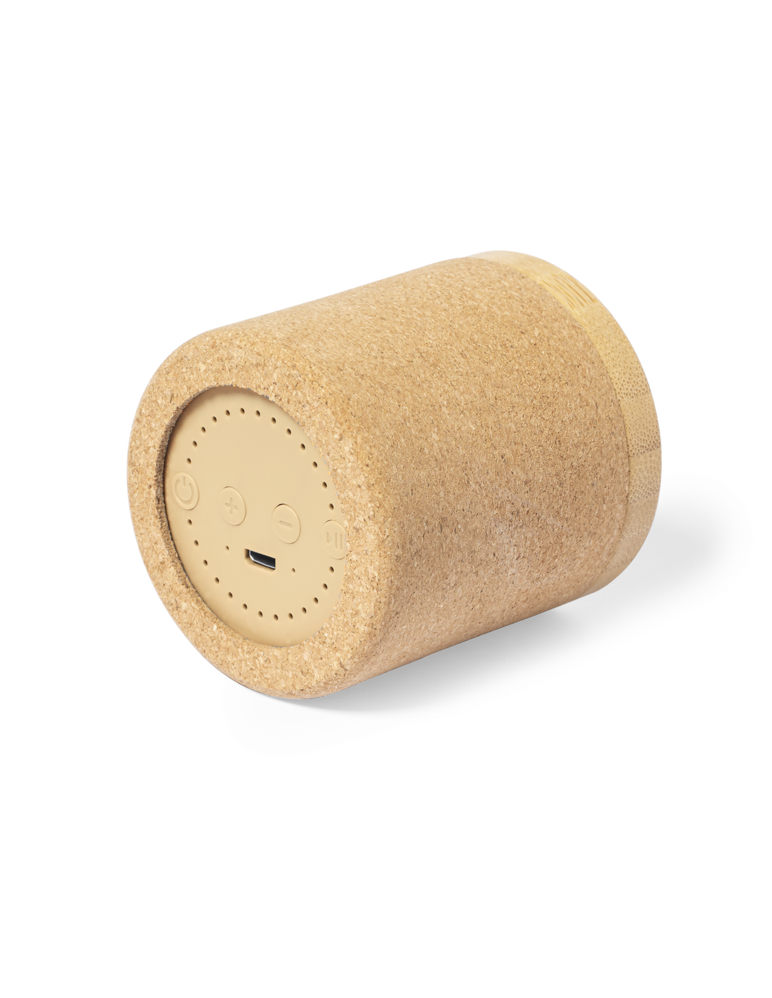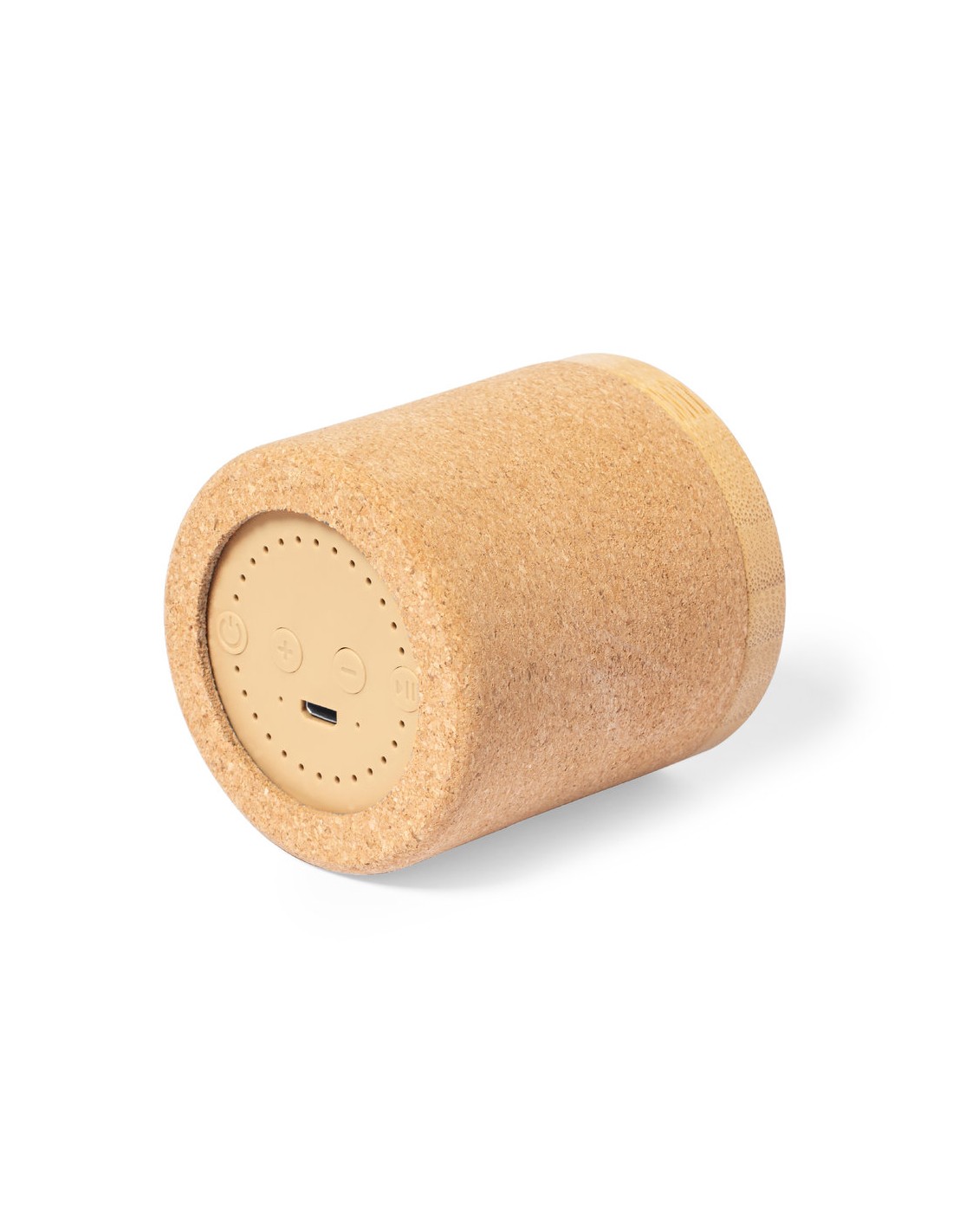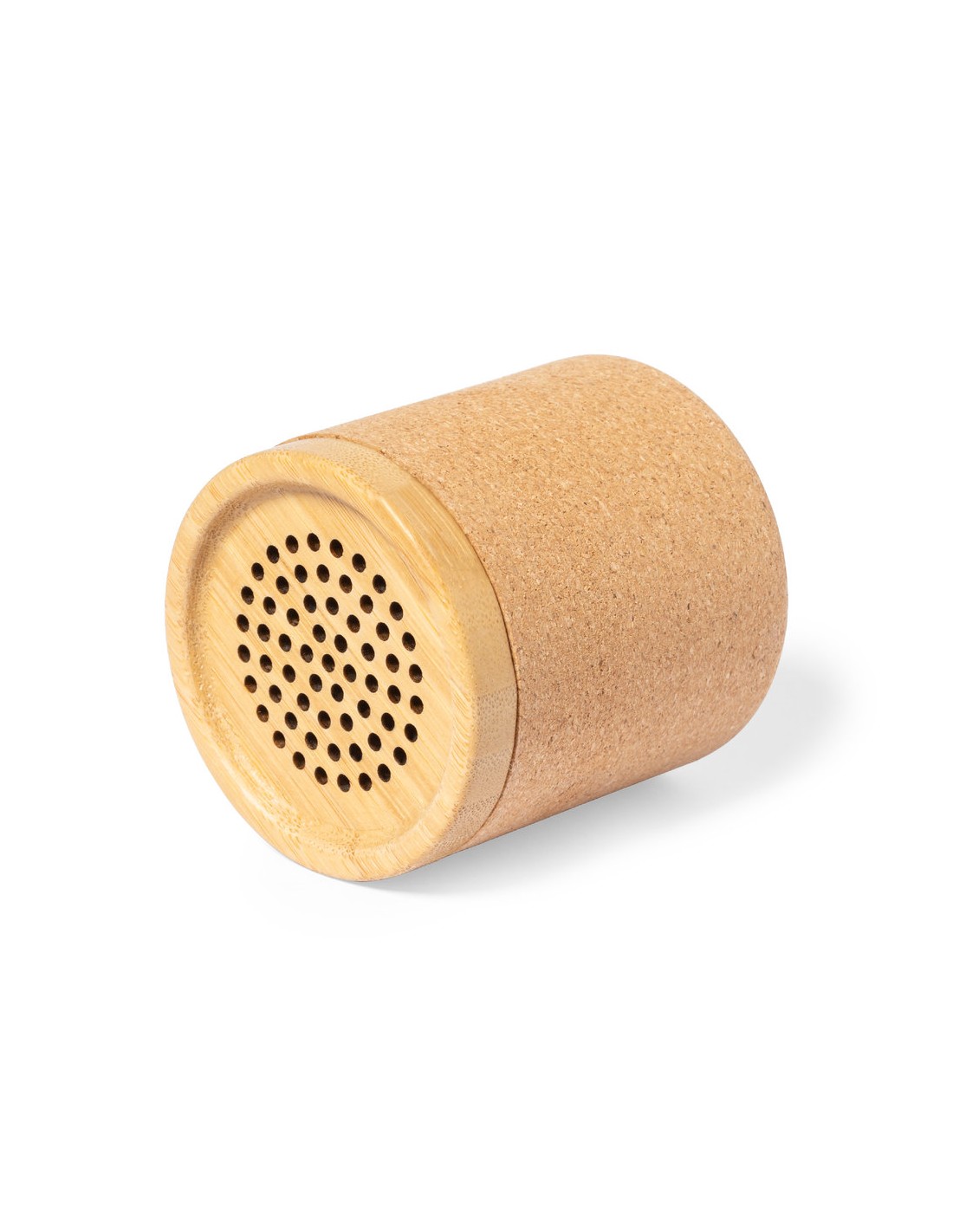 Altavoz Bluetooth de tamaño compacto y 3W de potencia. Combinación eco de cuerpo en corcho natural con rejilla de bambú. Batería de litio de 300mAh, con cable de carga Tipo C incluido. Presentado en caja individual de diseño kraft, con manual de instrucciones en español e inglés.
