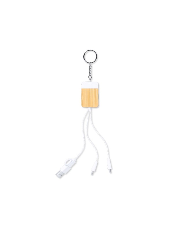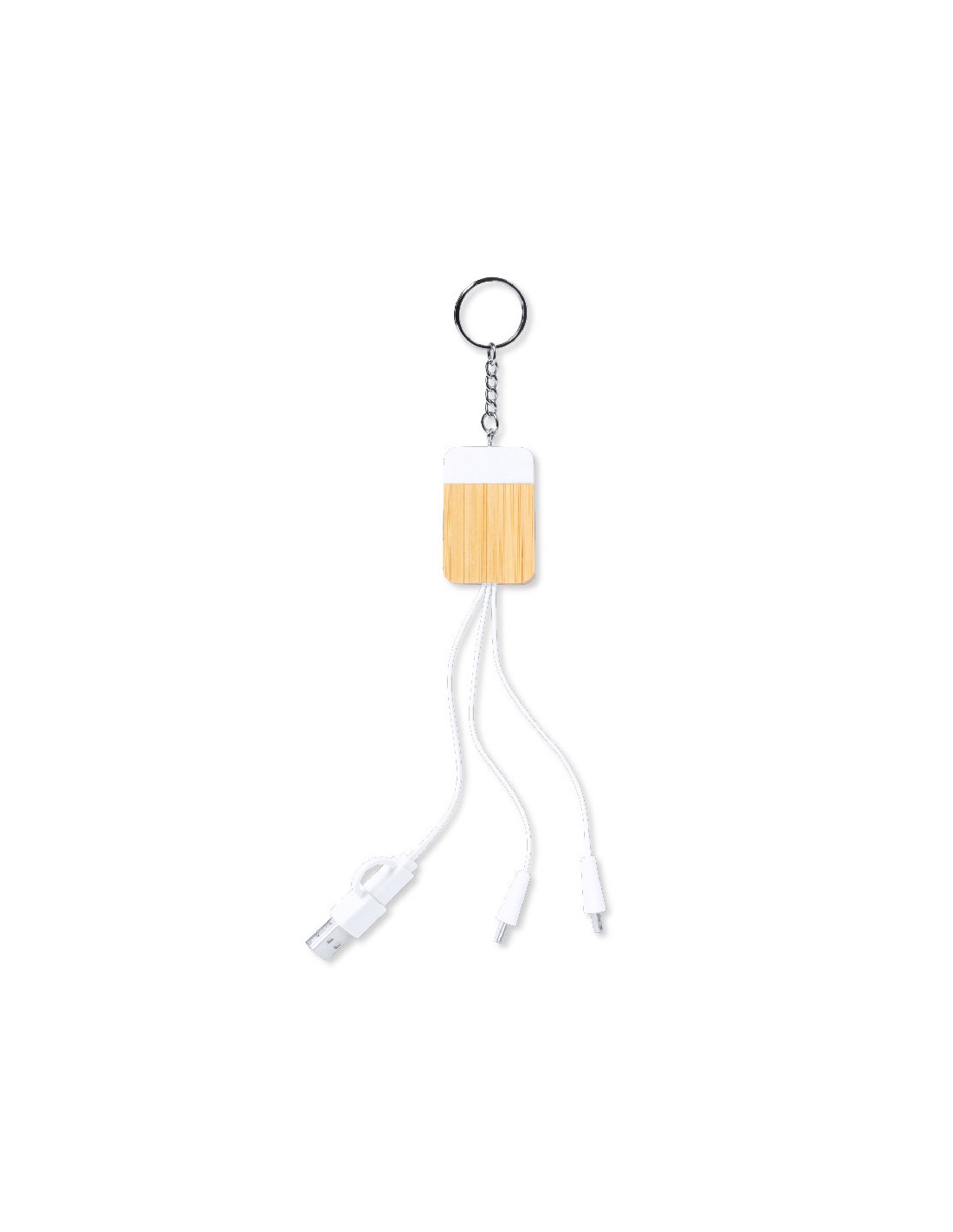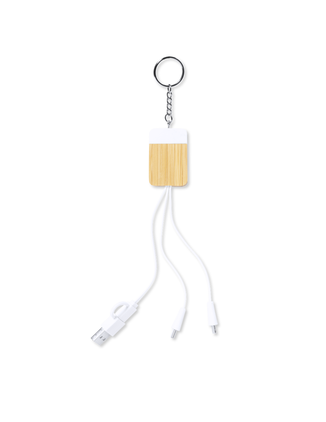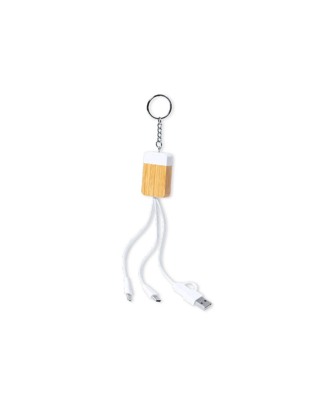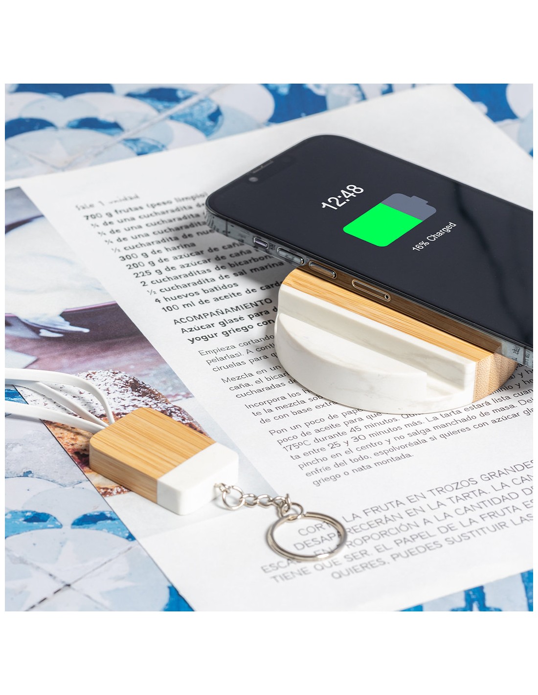 Cable cargador con llavero, fabricado en bambú y con detalle en extracto de mármol. Incluye conexiones de entrada USB y Tipo C, con salidas Lightning, Micro USB y Tipo C 5VDC 2.4A. Presentado en bolsa individual de diseño kraft.