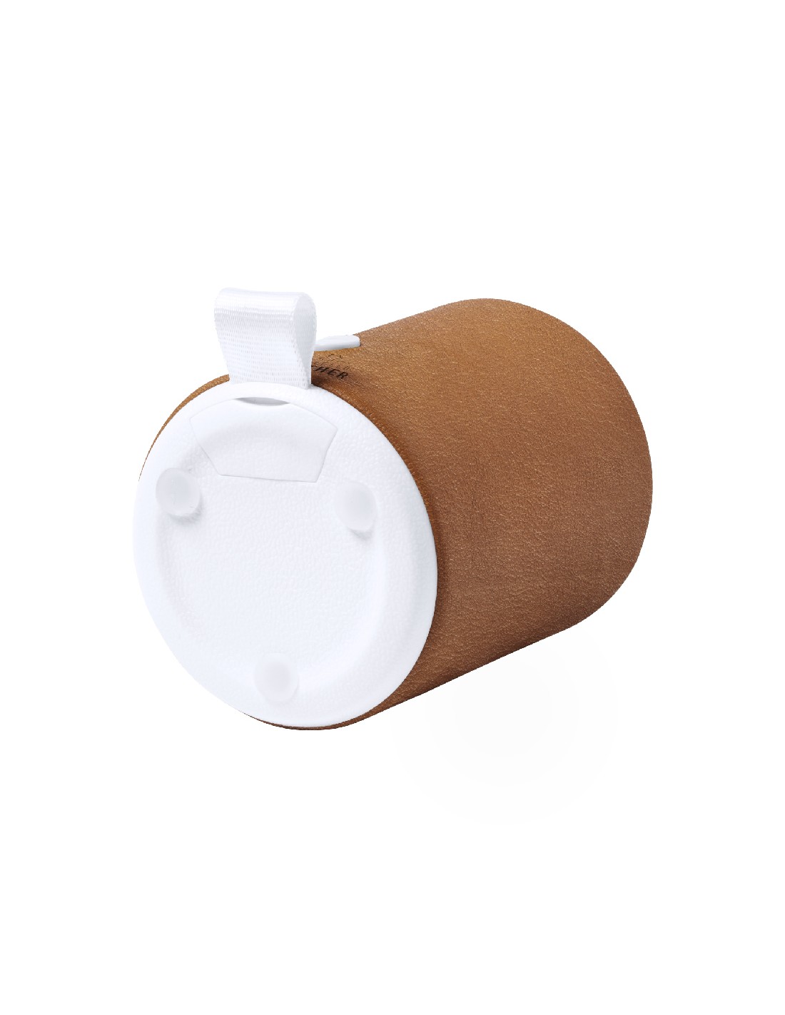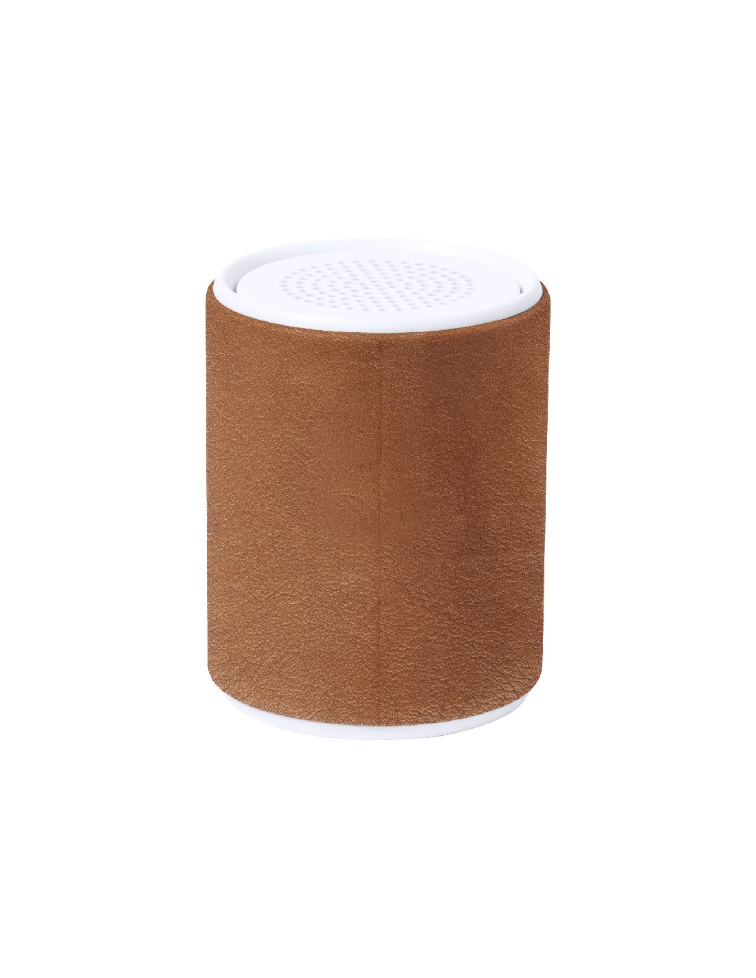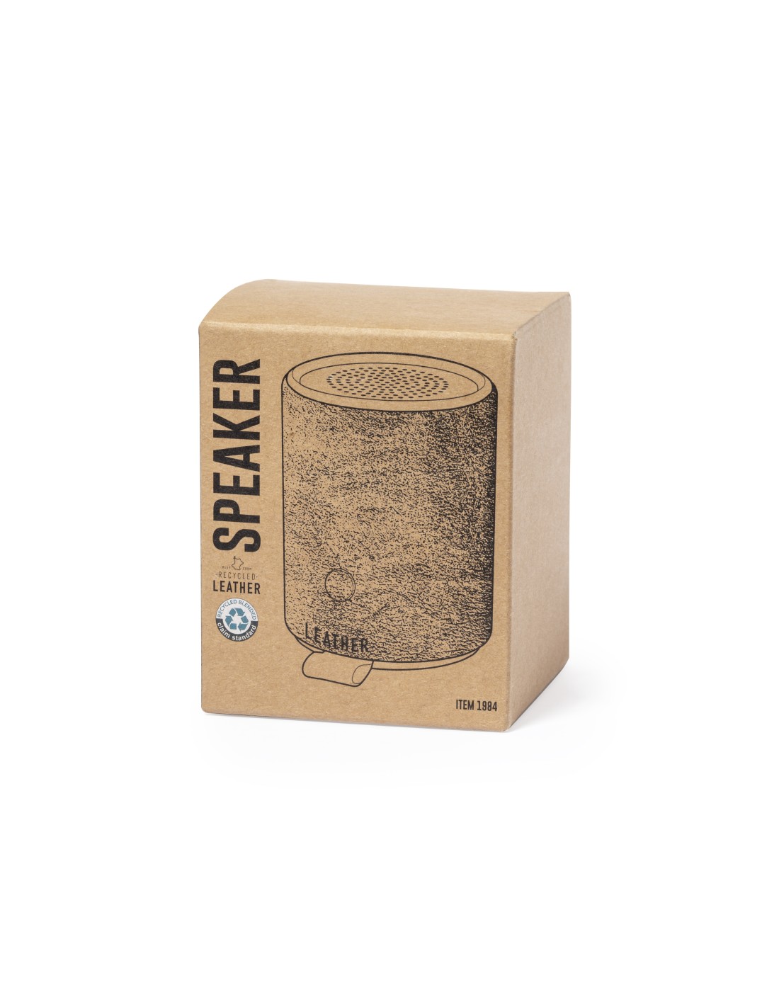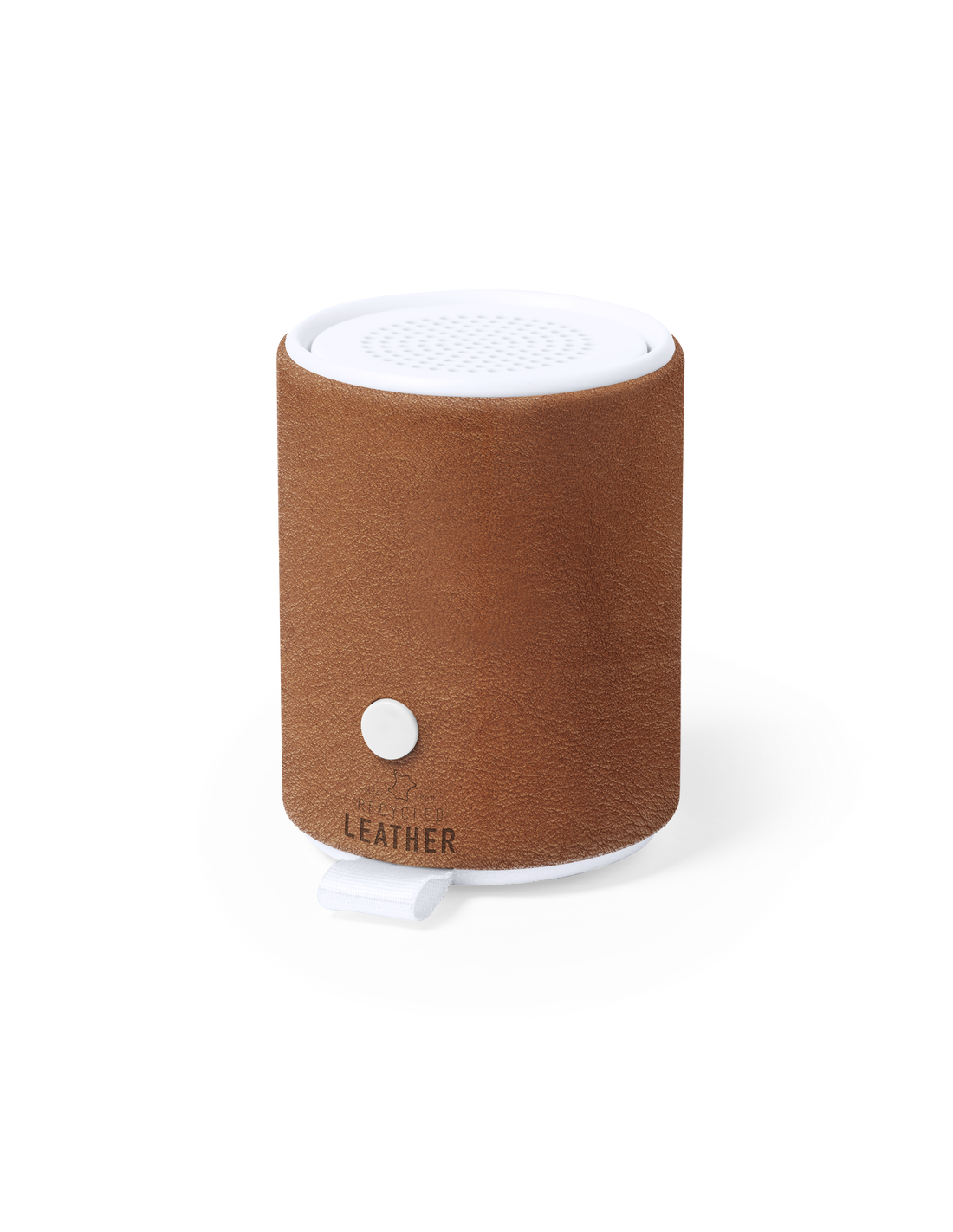 Altavoz Bluetooth con carcasa fabricada en RABS y forrada en cuero reciclado.Con 3W de potencia y batería de 400 mAh. Conexión Bluetooth 5.0, con ranura para tarjeta micro SD y base antideslizante. Incluye cable cargador Tipo C y manual de instrucciones en español e inglés. Presentado en caja individual de diseño kraft.El material RABS o ABS Reciclado y el cuero reciclado proceden del reciclado de artículos al final de su vida útil. Los materiales reciclados empleados incorporan la certificación RCS, que garantiza el origen reciclado de los mismos.