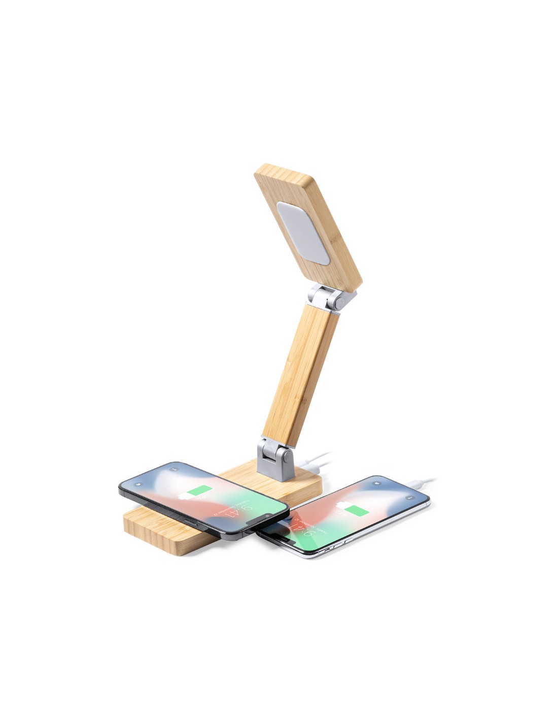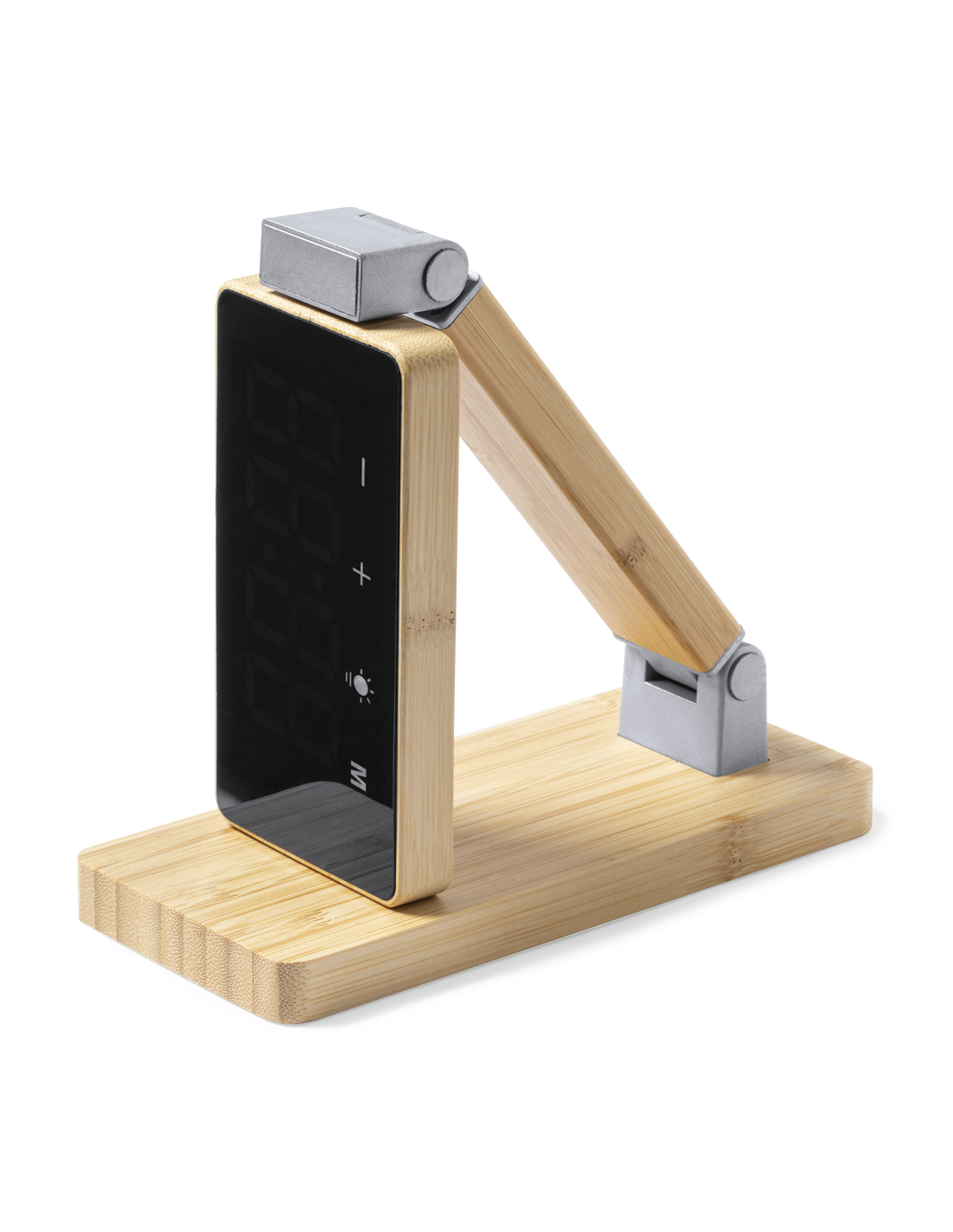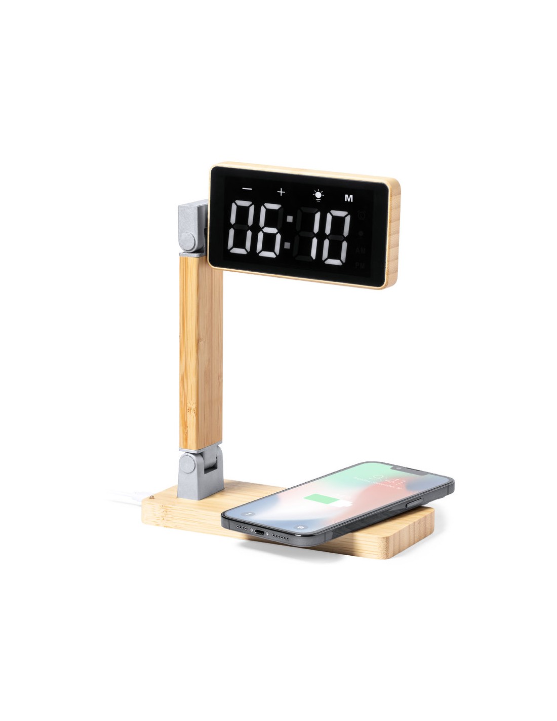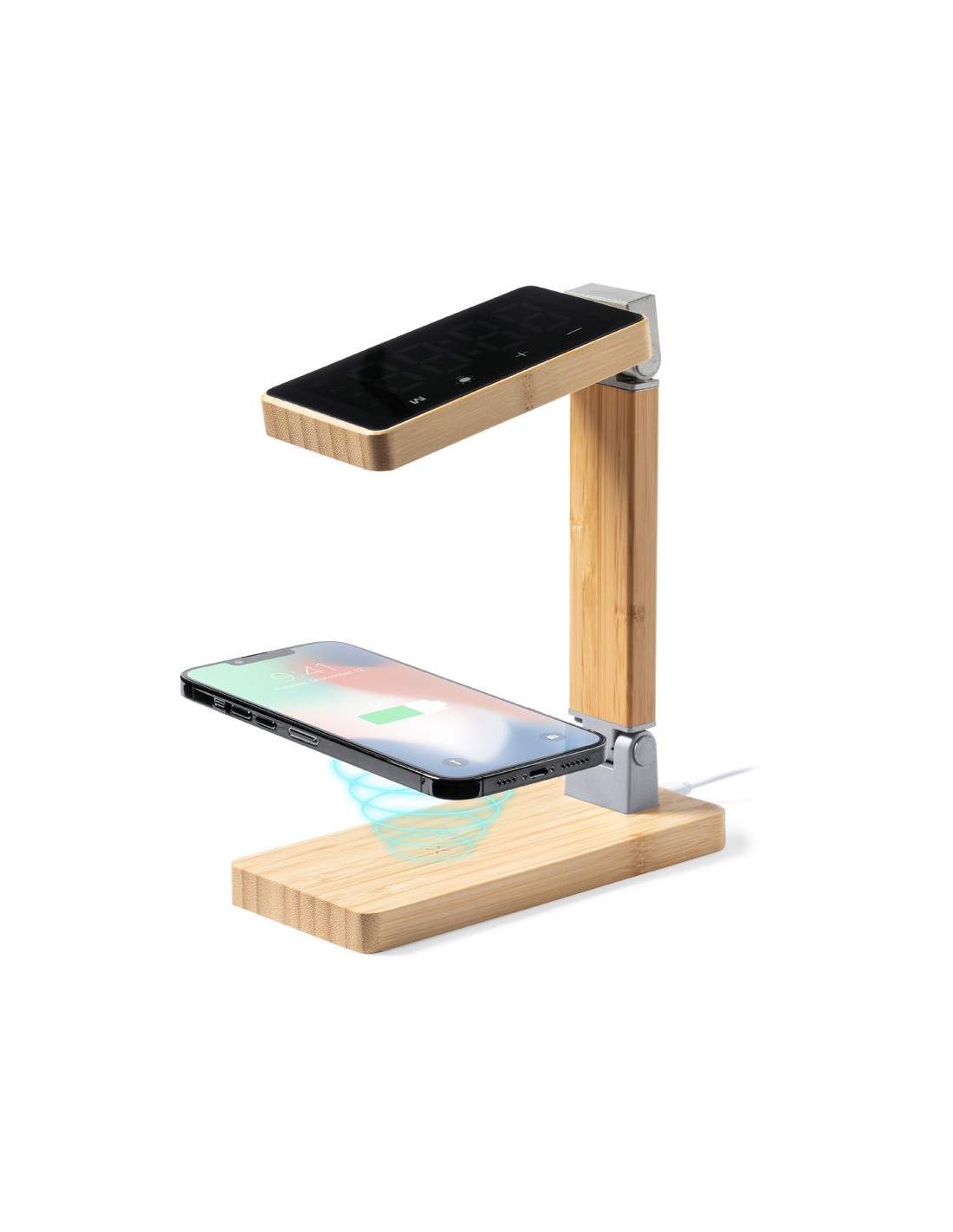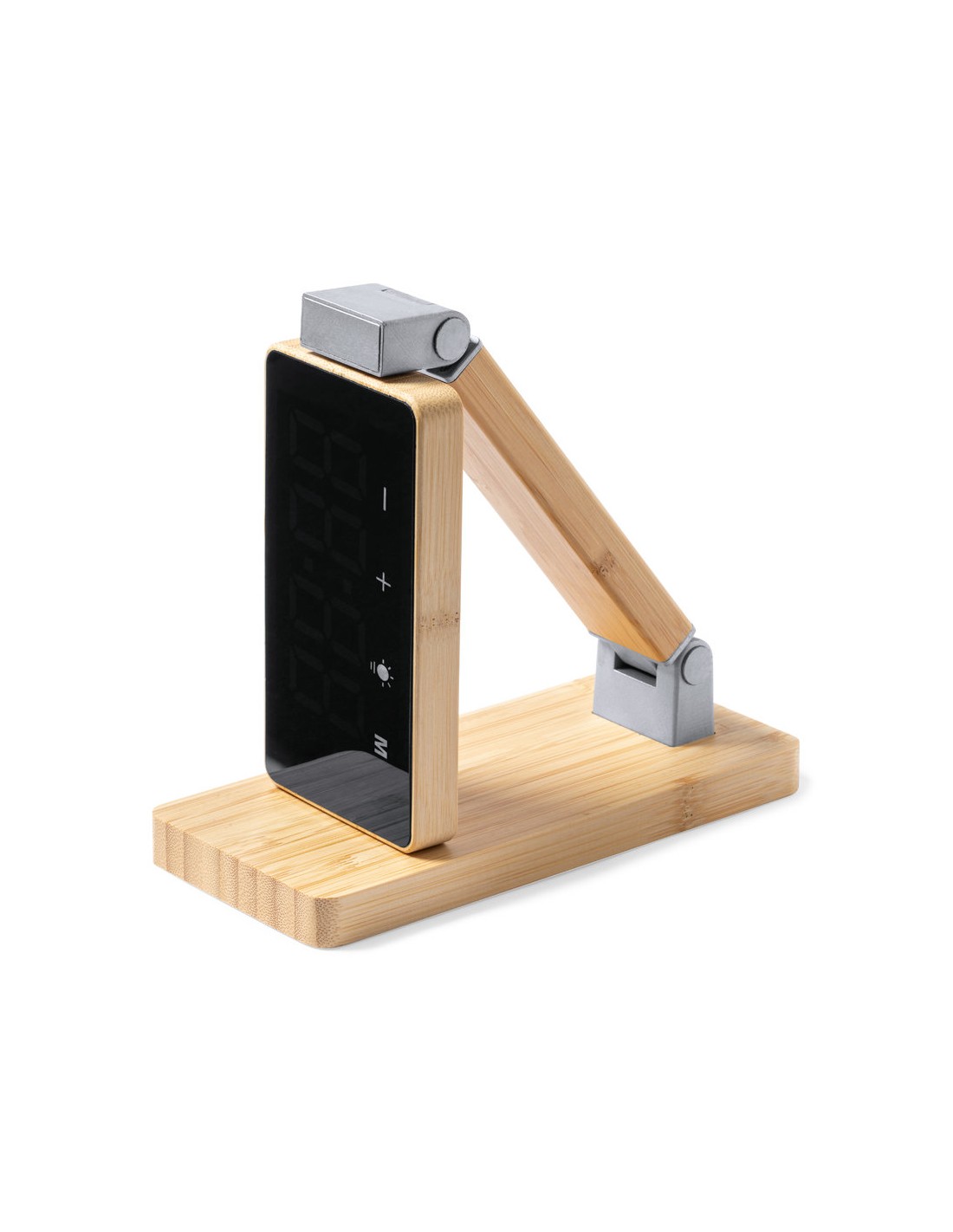 Reloj multifunción con pantalla táctil retroiluminada y cargador inalámbrico 15W integrado, con salida USB(5V DC 2A). Plegable y fabricado en bambú, con funciones fecha/hora y alarma. Lámpara con 16 LEDs y 3 posiciones de iluminación, con intensidad de luz regulable. Cable de carga Tipo C incluido y compatible con dispositivos equipados con tecnología de carga inalámbrica Qi. Presentado en caja individual de diseño kraft, con manual de instrucciones en español en inglés.Fabricado conforme a los estándares RoHS y en cumplimiento con los siguientes requisitos de seguridad:Sistema de protección contra sobrecalentamiento.Sistema de protección contra sobrecarga.Sistema de bloqueo para evitar cortocircuitos.