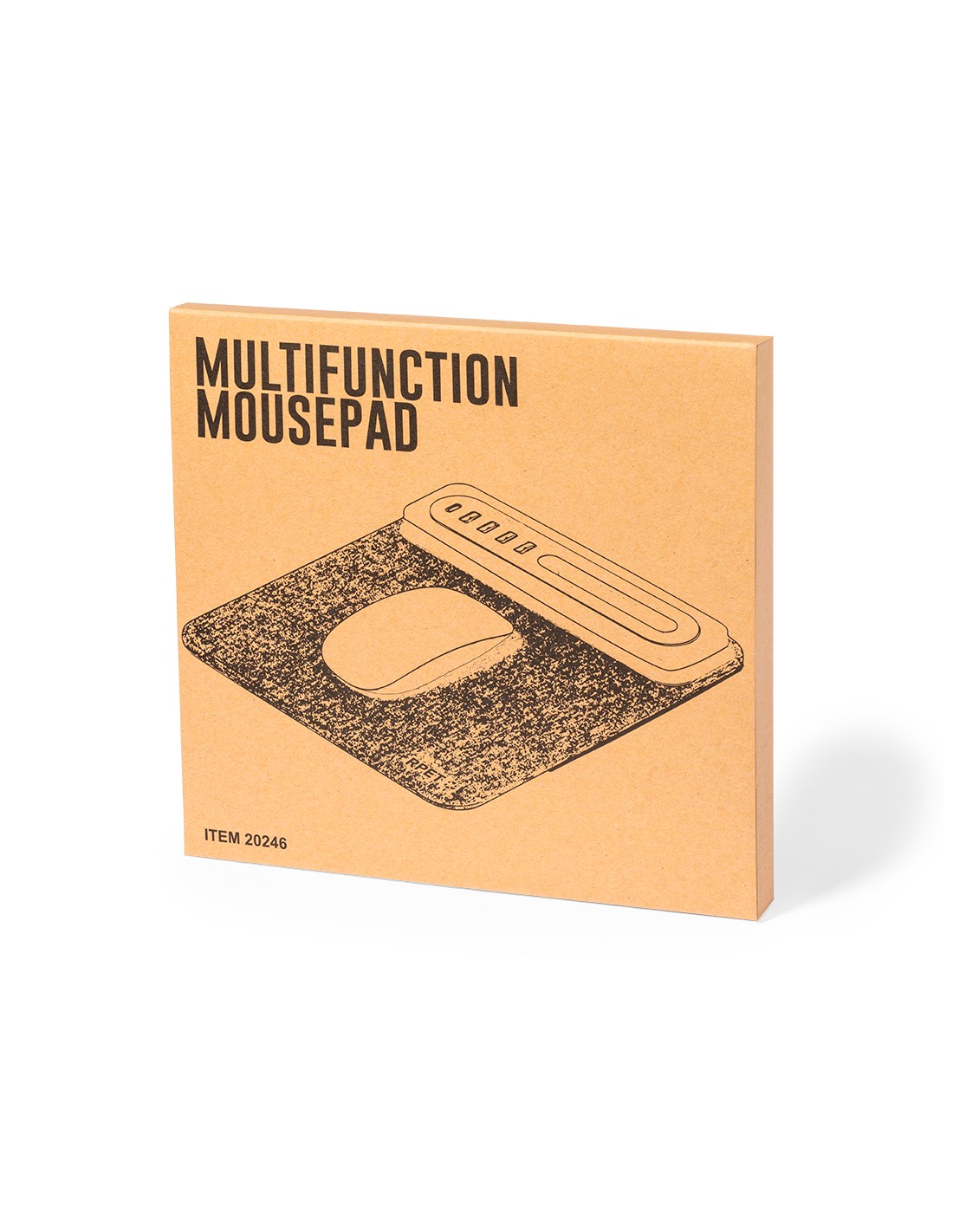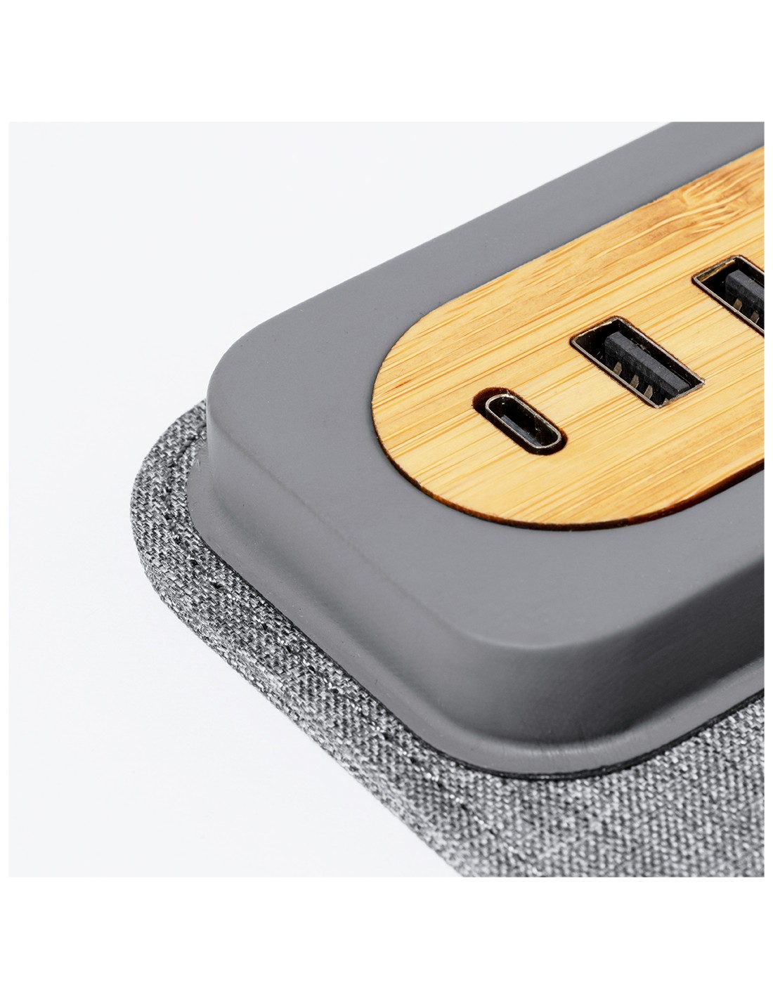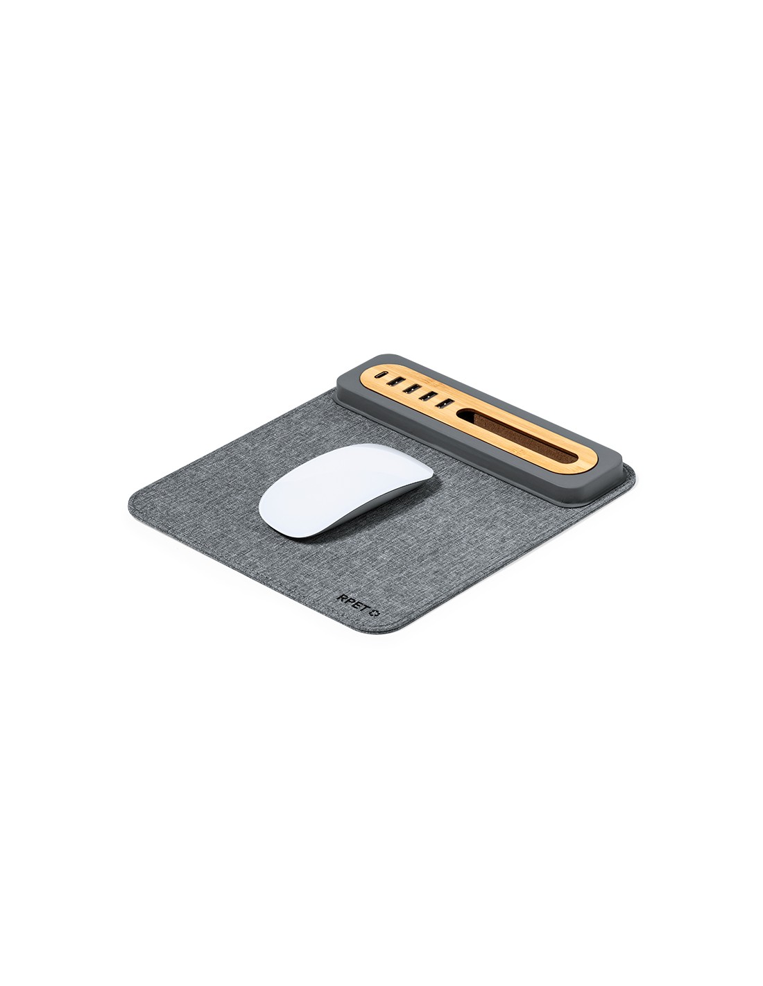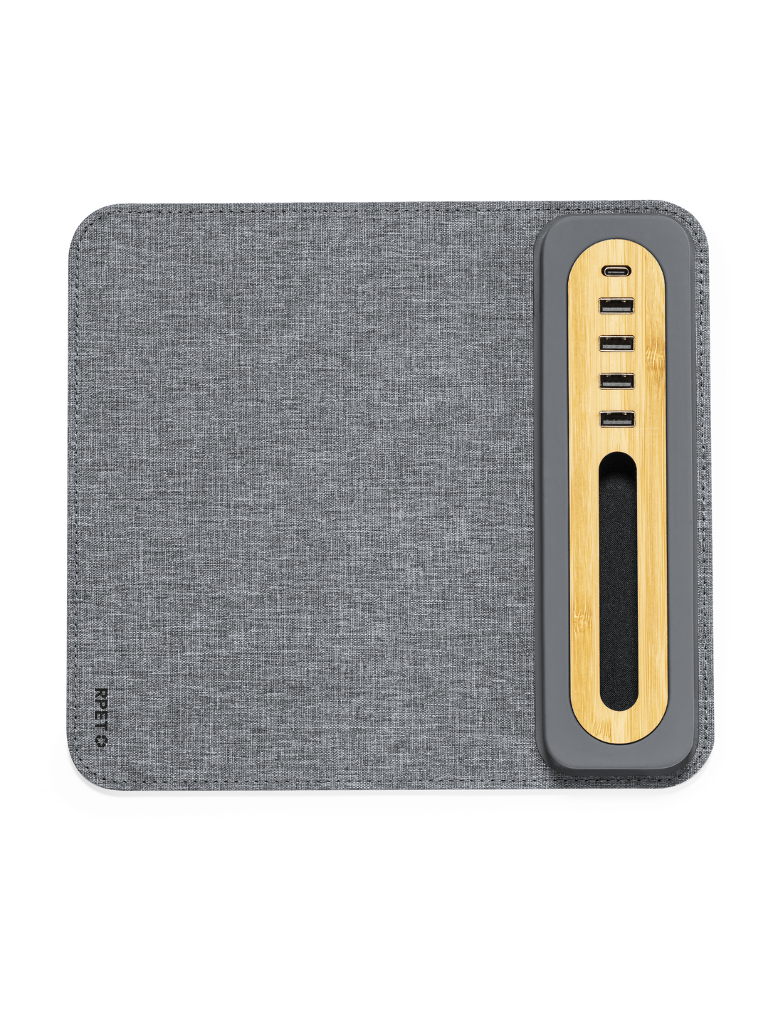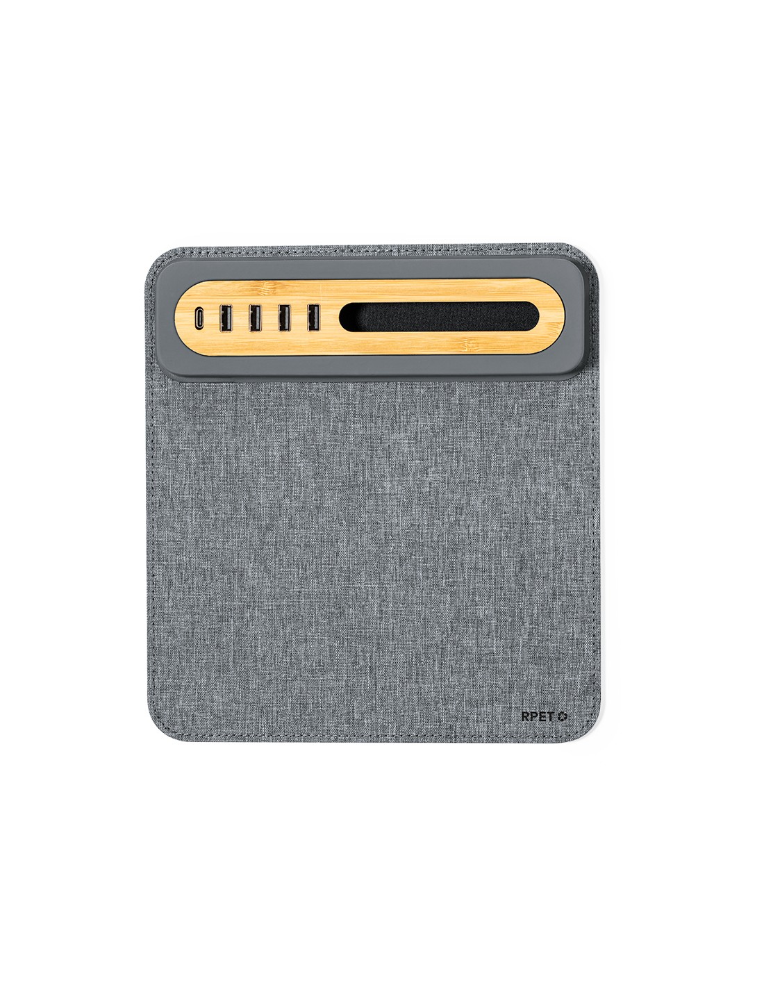 Elegante y funcional alfombrilla fabricada en combinación de suave poliéster RPET y bambú. Con puerto tipo C y cuatro puertos USB 2.0, permitiendo conectar y cargar los dispositivos fácilmente. Con soporte para smartphone y base antideslizante que garantiza un uso cómodo y estable. Introduce una nueva era de conectividad y sostenibilidad en el espacio de trabajo.Presentada en caja individual de diseño kraft y en bolsa reciclada.El material RPET se elabora a partir de plástico reciclado, para así fomentar la reutilización de residuos plásticos y ayudar a la sostenibilidad del planeta.