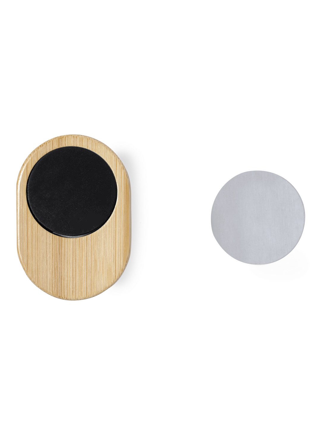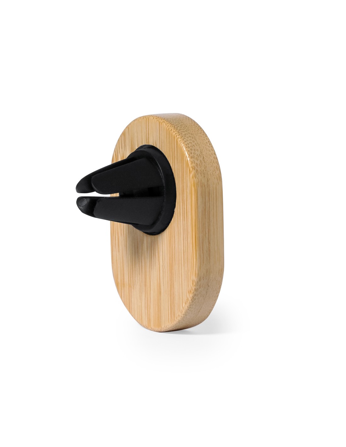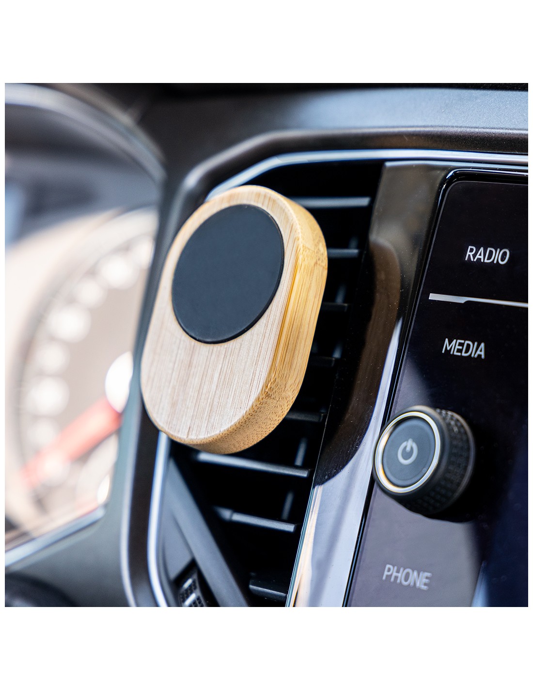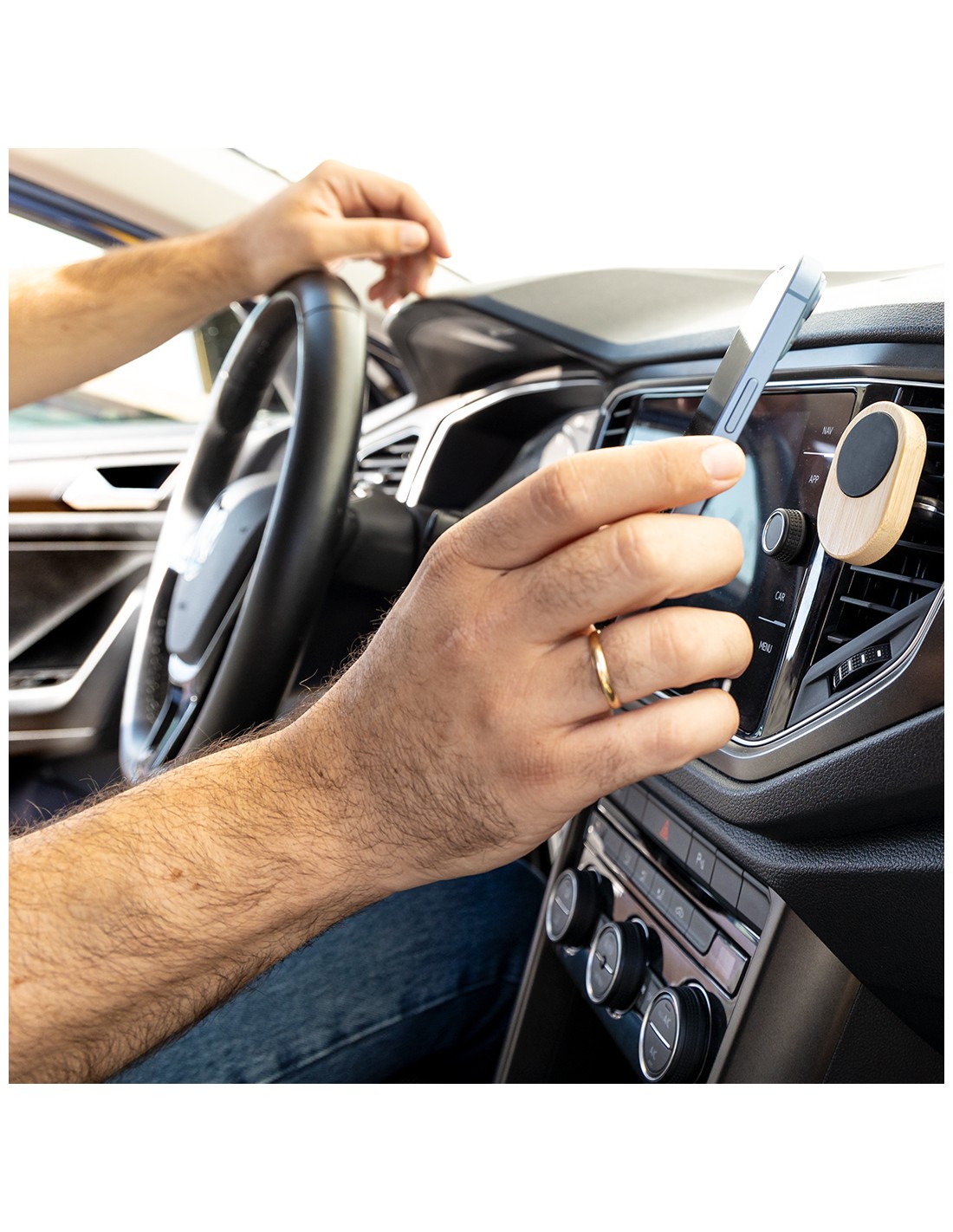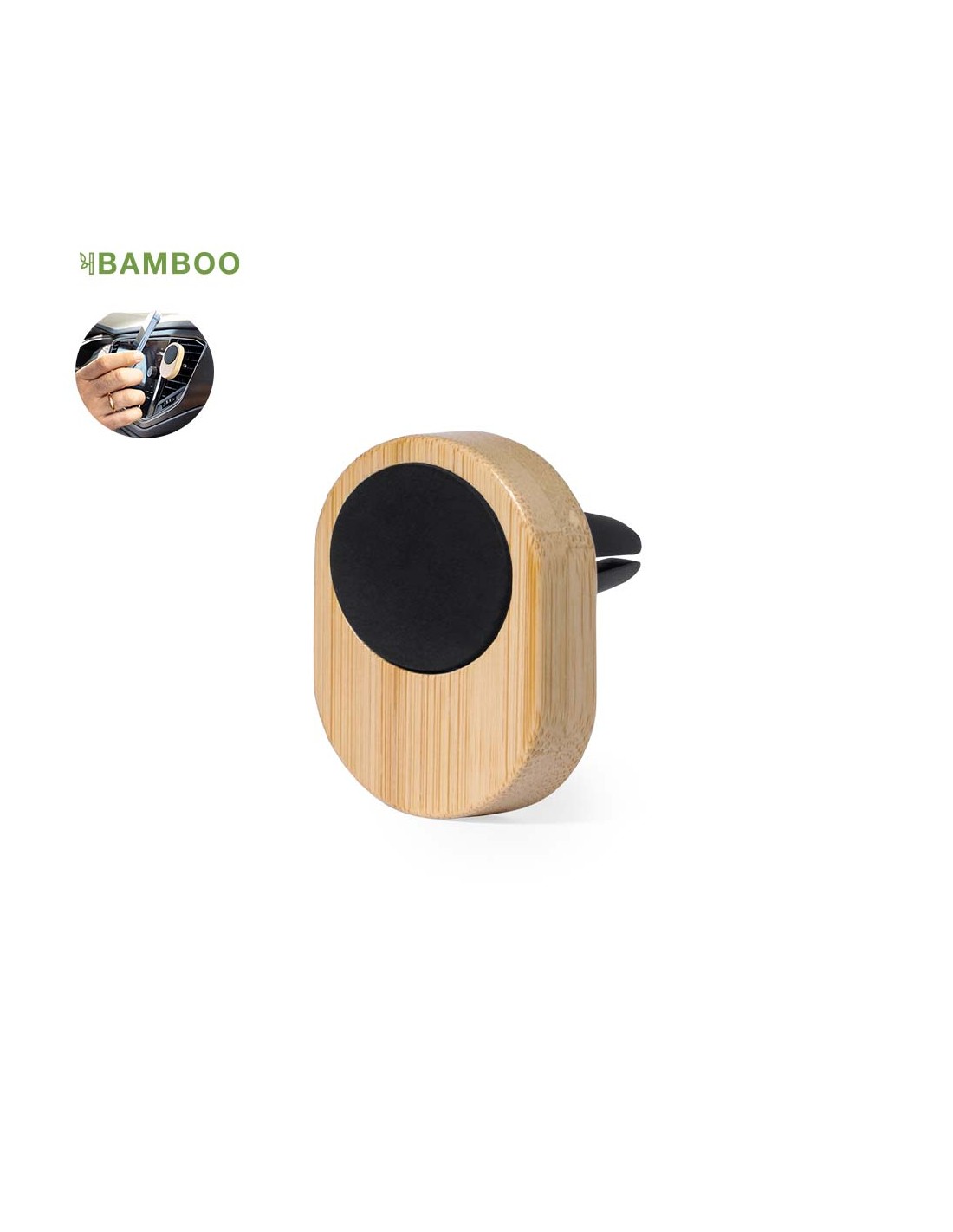 Soporte de rejilla de coche para smartphone fabricado en bambú. Cómoda y segura fijación magnética. Incluye anillo adhesivo. Presentado en caja individual de diseño eco en cartón kraft.Materiales como el bambú fomentan la utilización de materias primas naturales, reduciendo las emisiones contaminantes. Proviene de una planta de gran resistencia, con versatilidad de crecimiento y regeneración rápida, siendo una excelente alternativa al uso de madera tradicional.