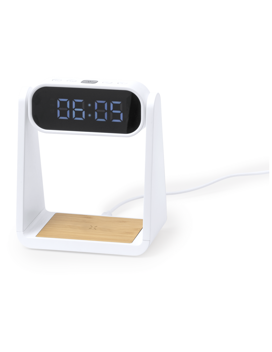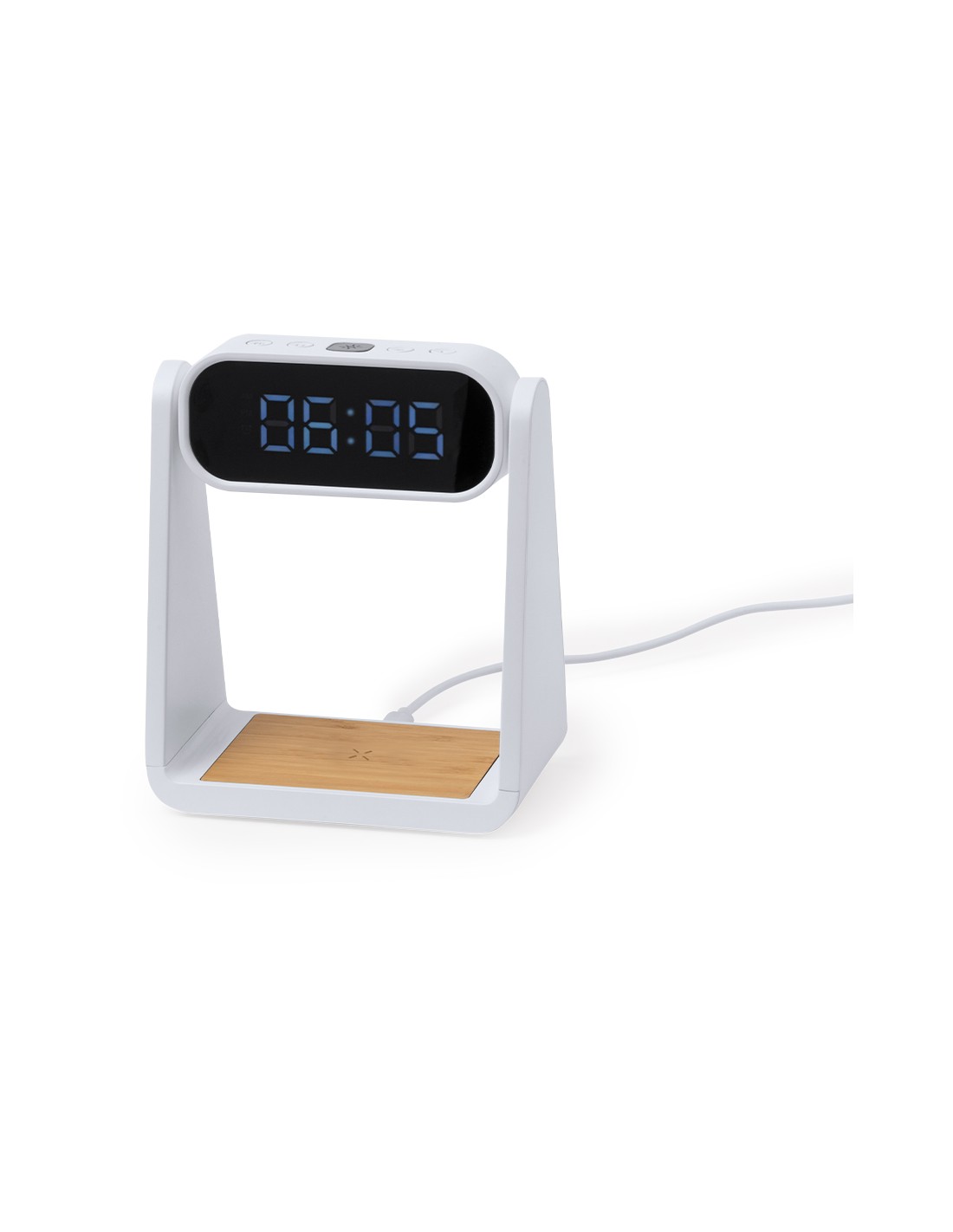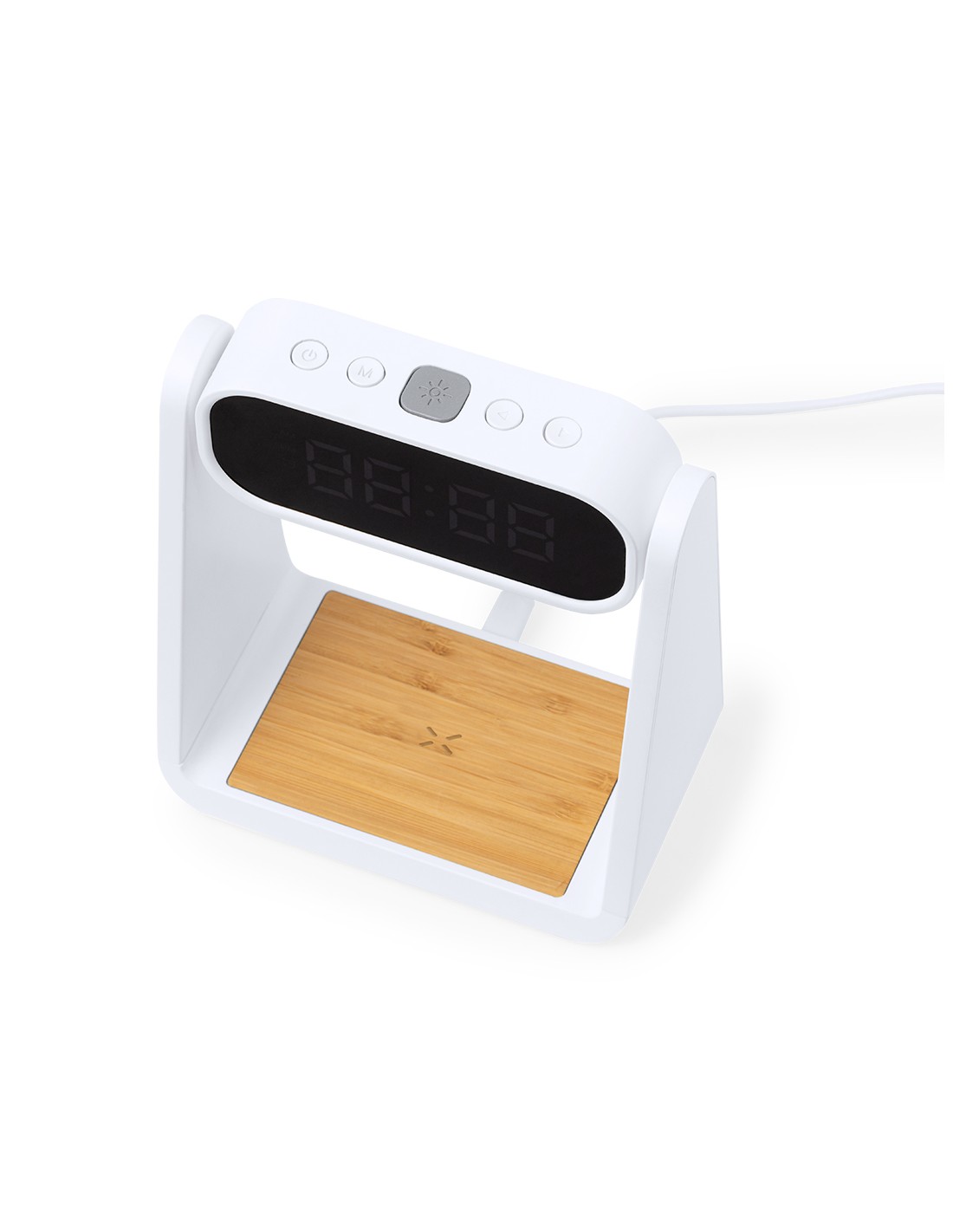 Reloj multifunción con pantalla retroiluminada, función lámpara y cargador inalámbrico 10W integrado. Fabricado en resistente ABS y bambú, de elegante diseño en color blanco, con funciones hora (12/24h) y alarma (3) . Pantalla con intensidad regulable, compatible con dispositivos equipados con tecnología de carga inalámbrica Qi y lámpara con 6 LEDs. Presentado en caja individual de diseño kraft y protector de papel, con manual de instrucciones en español en inglés.Elaborado con elementos vegetales para así fomentar la utilización de materias primas naturales y reducir las emisiones contaminantes.