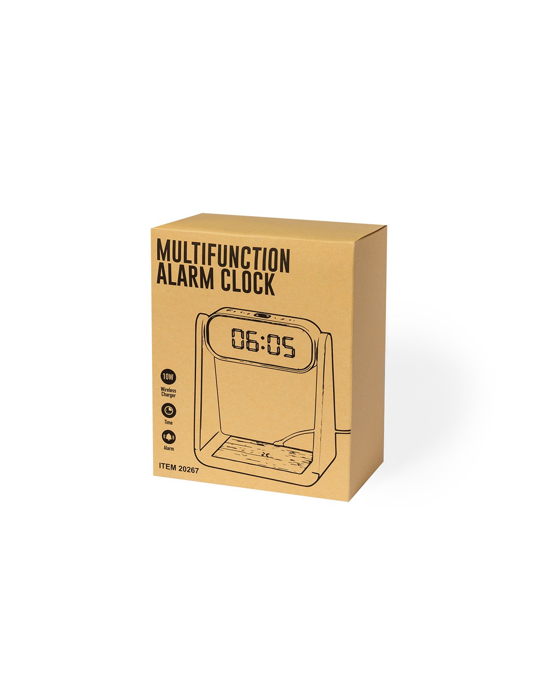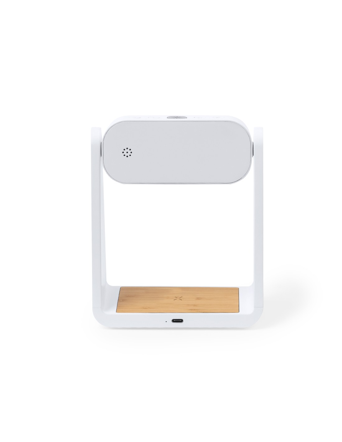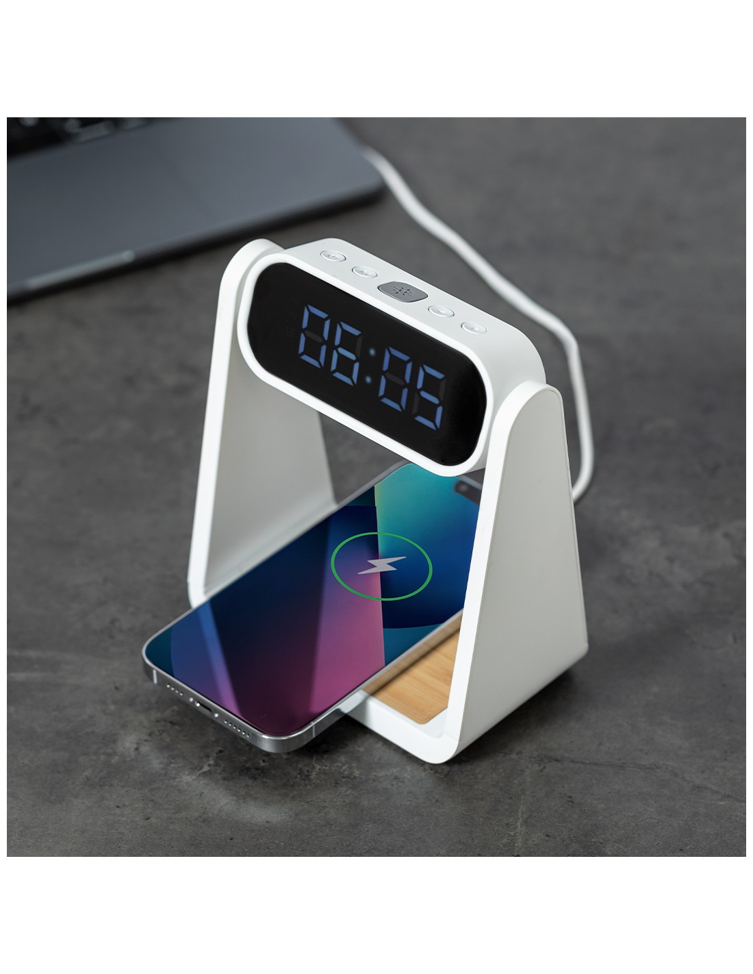 Reloj multifunción con pantalla retroiluminada, función lámpara y cargador inalámbrico 10W integrado. Fabricado en resistente ABS y bambú, de elegante diseño en color blanco, con funciones hora (12/24h) y alarma (3) . Pantalla con intensidad regulable, compatible con dispositivos equipados con tecnología de carga inalámbrica Qi y lámpara con 6 LEDs. Presentado en caja individual de diseño kraft y protector de papel, con manual de instrucciones en español en inglés.Elaborado con elementos vegetales para así fomentar la utilización de materias primas naturales y reducir las emisiones contaminantes.