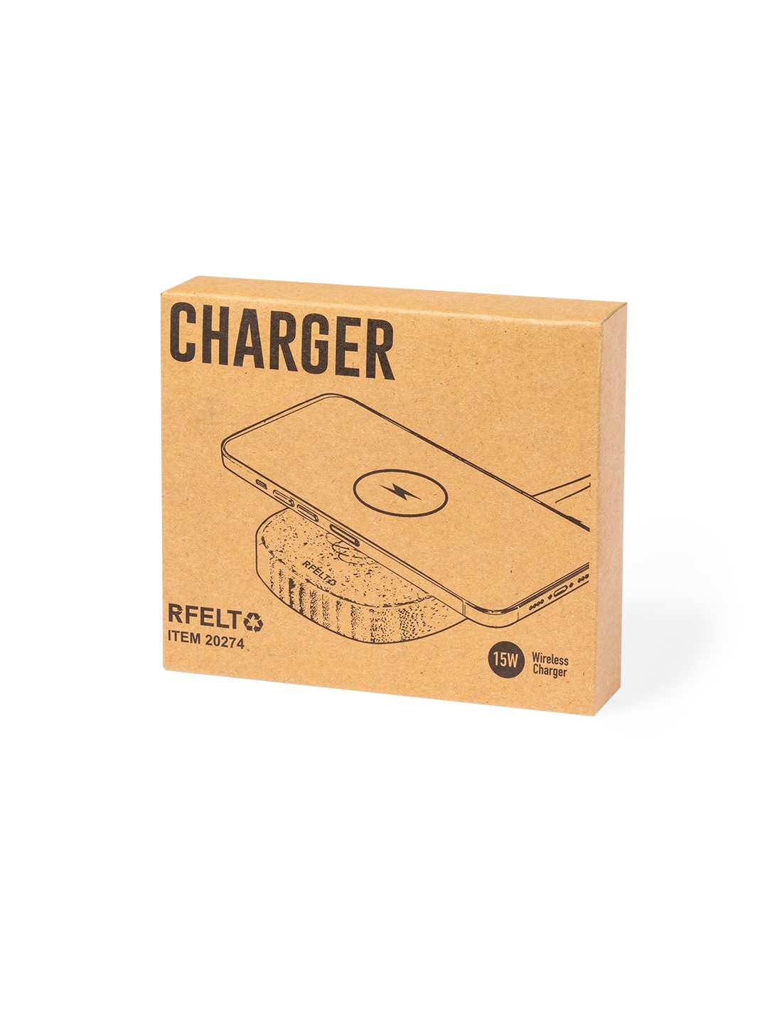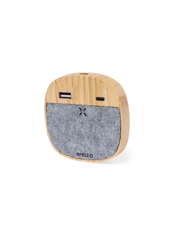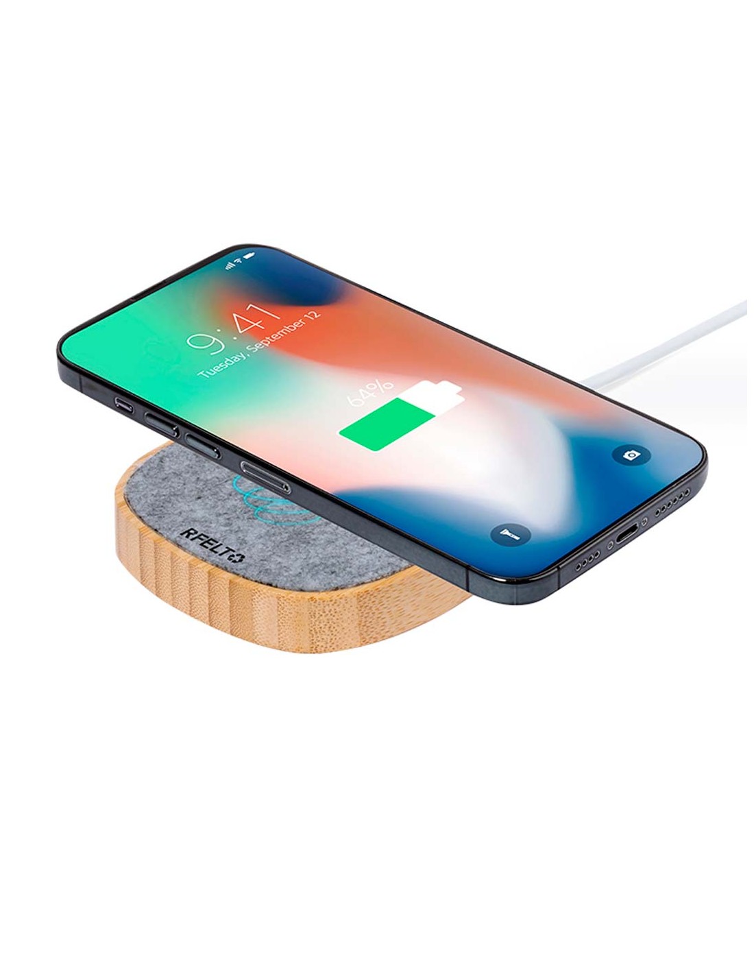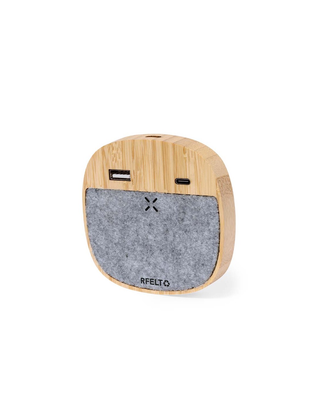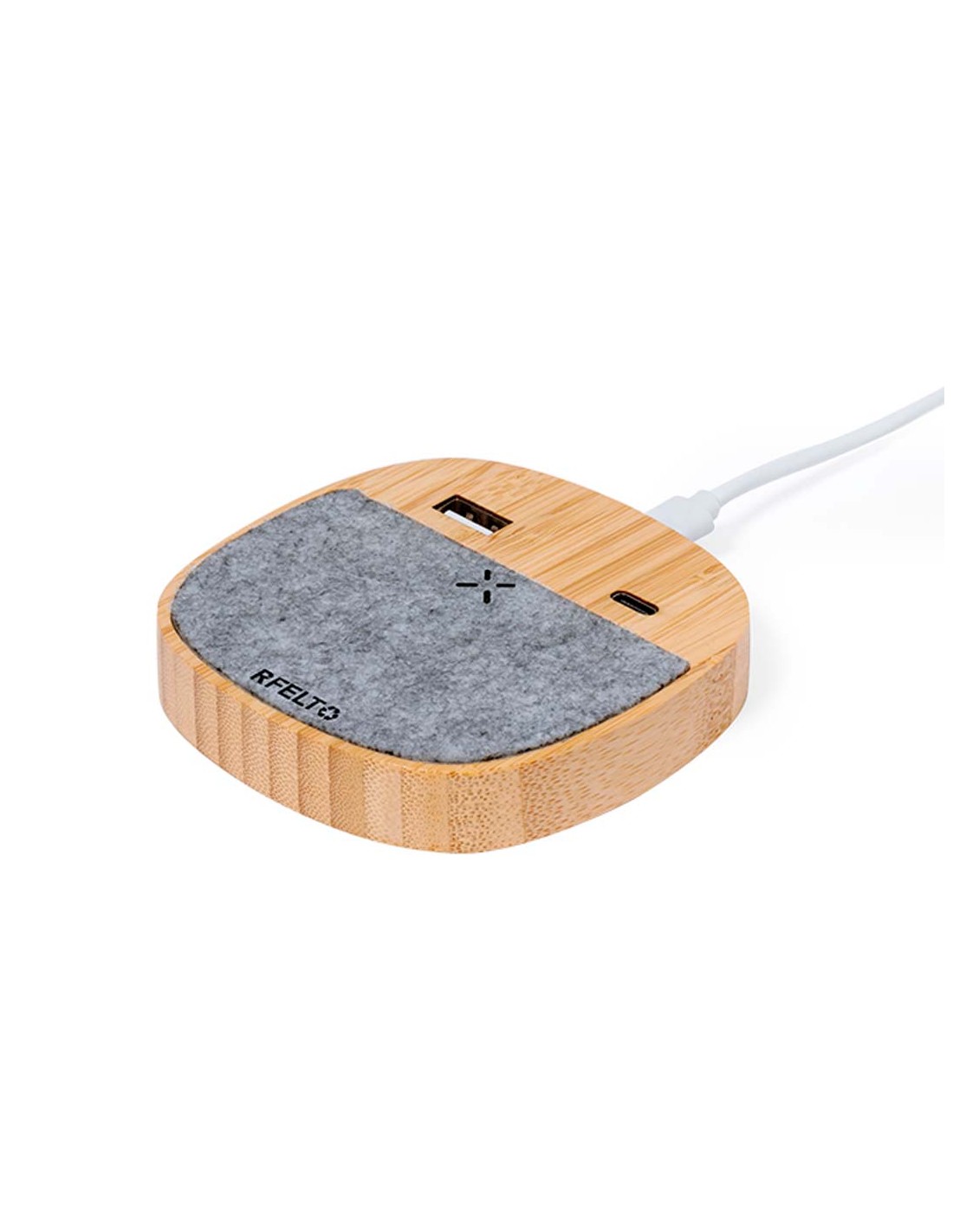 Cargador inalámbrico fabricado en bambú y fieltro RPET. Función de carga de 15W y compatible con dispositivos equipados con tecnología Qi. Incluye 2 salidas para multicarga de dispositivos: 1 salida tipo USB y una salida Tipo C. Con distintivo RPET. Amplia superficie de marcaje, presentado en atractiva caja de diseño kraft.El fieltro RPET reciclado es fruto de la combinación del proceso de reciclaje de materiales plásticos junto a la técnica milenaria de fabricación del fieltro, dando como resultado un material de eco-tendencia que, además de ser de origen reciclado, también se convierte en reciclable.