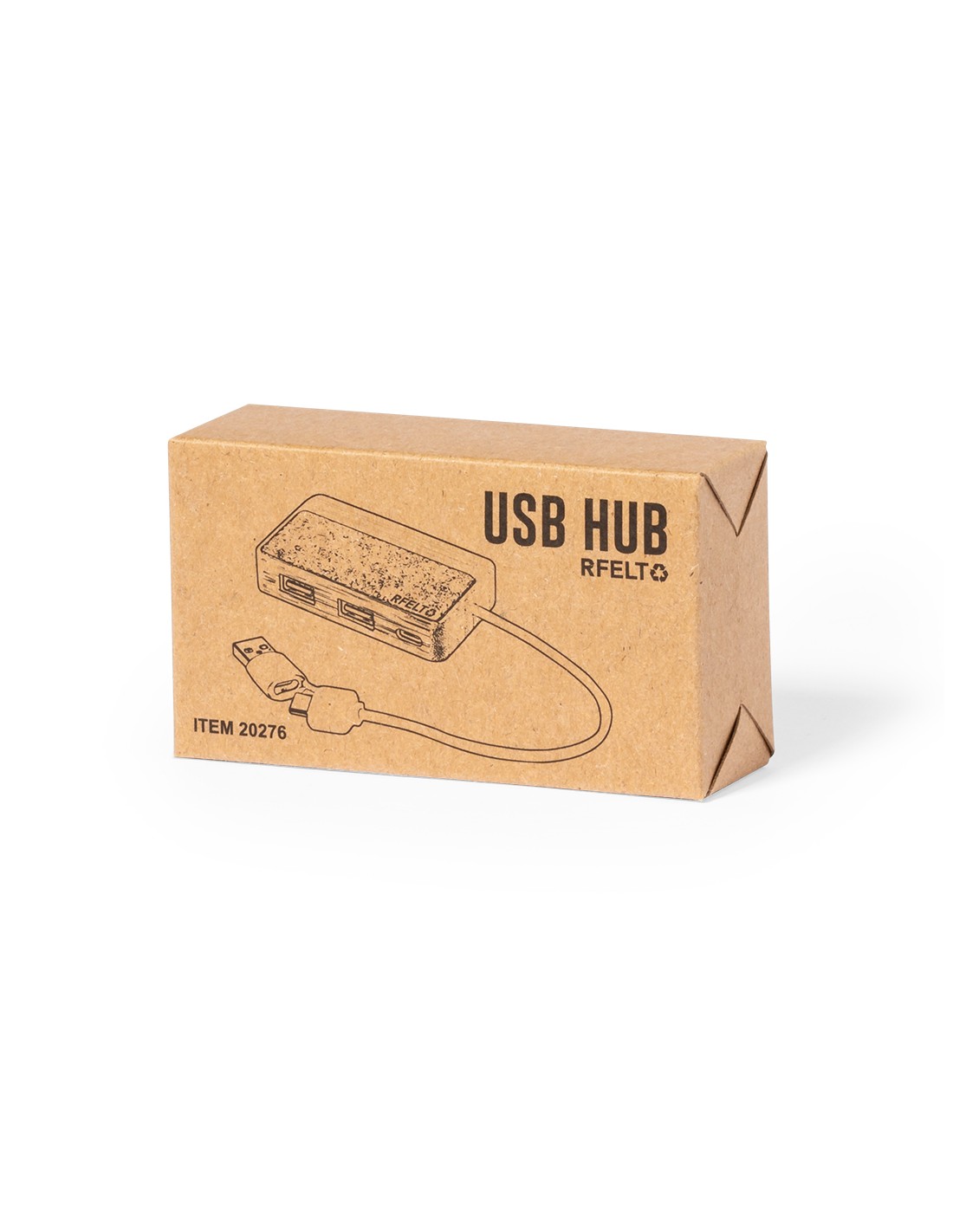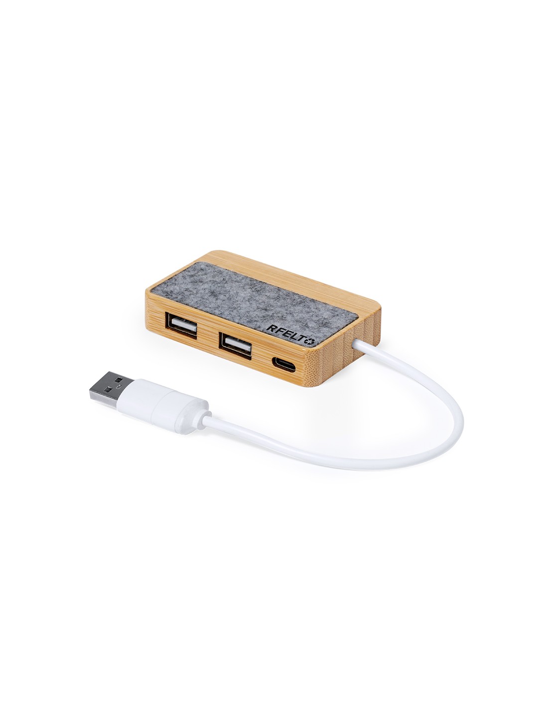 Puerto USB 2.0 fabricado en bambú y fieltro RPET. Incluye puerto Tipo C y 2 puertos USB, con entrada dual USB/Tipo C. Con distintivo RPET. Presentado en caja individual de diseño kraft.El fieltro RPET reciclado es fruto de la combinación del proceso de reciclaje de materiales plásticos junto a la técnica milenaria de fabricación del fieltro, dando como resultado un material de eco-tendencia que, además de ser de origen reciclado, también se convierte en reciclable.