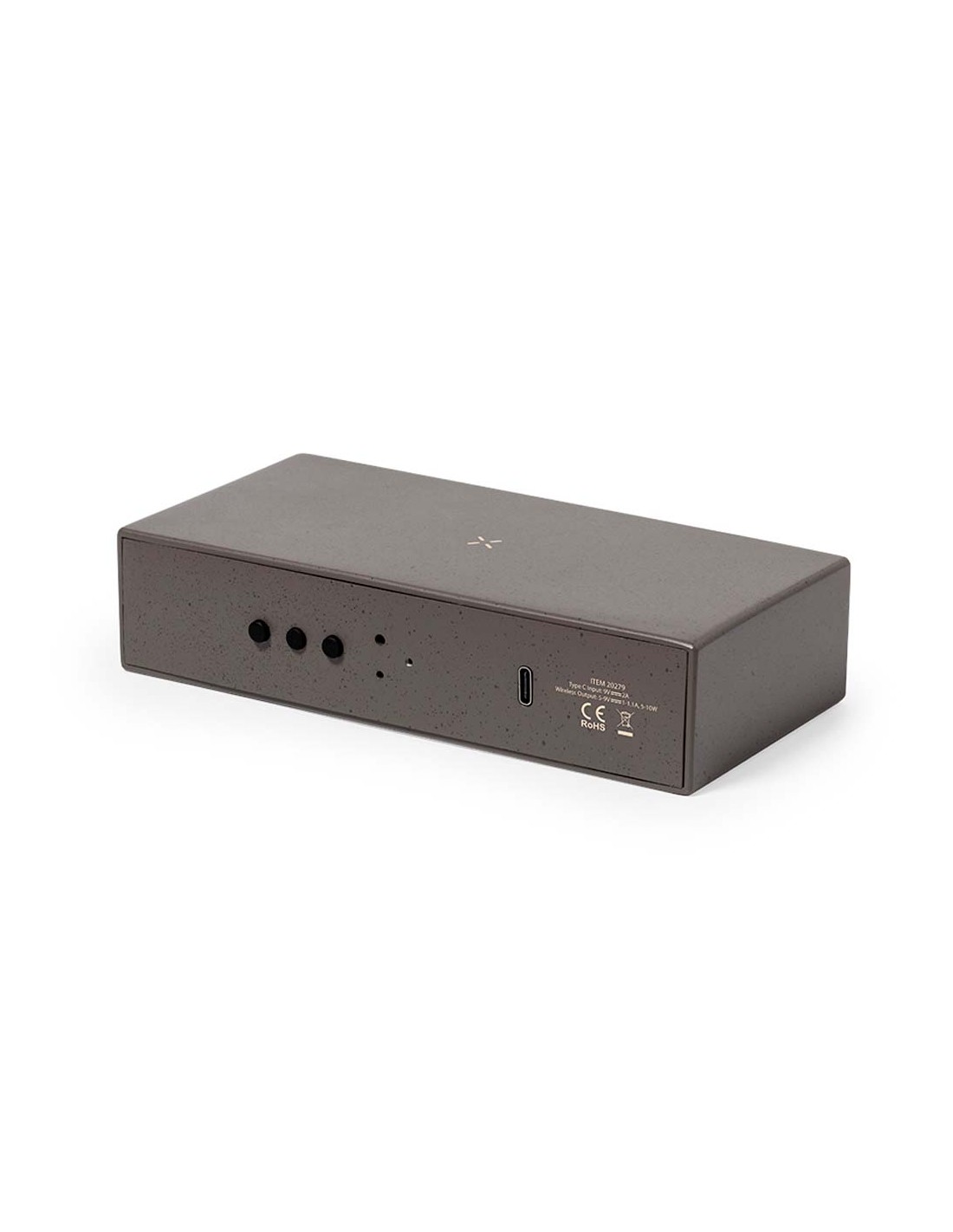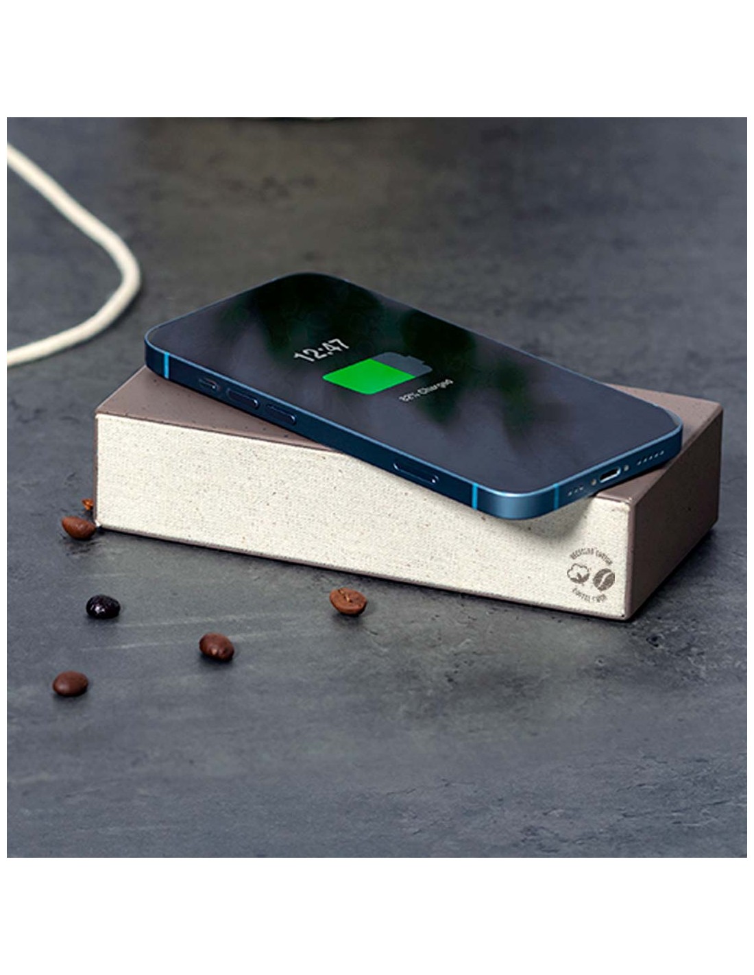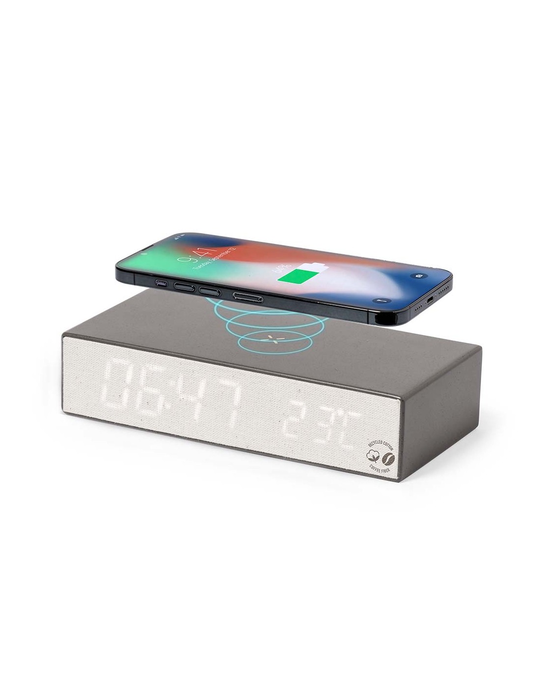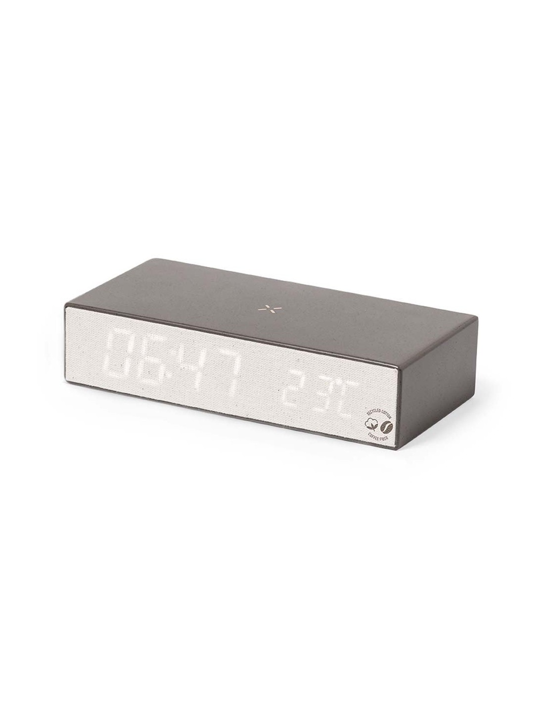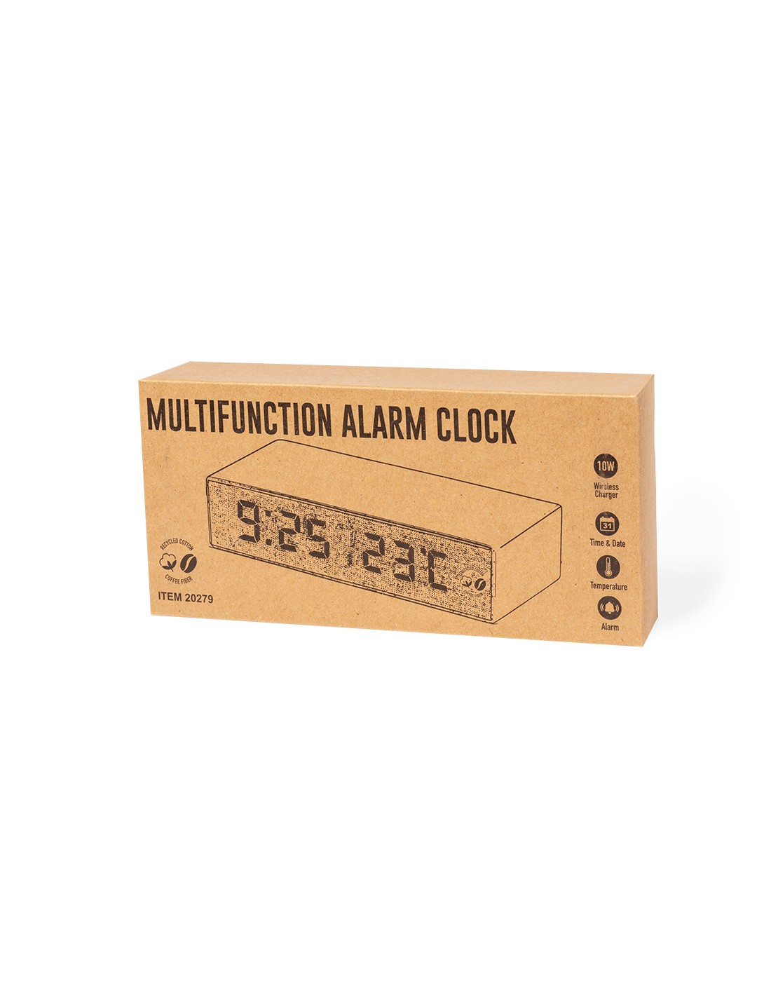 Reloj multifunción con cargador inalámbrico 10W integrado. Fabricado en en fibra de café y algodón reciclado. Función hora (12/24h), alarma, con intensidad de luz regulable. Alimentación mediante conexión USB. Compatible con dispositivos equipados con tecnología de carga inalámbrica y presentado en atractiva caja de diseño kraft. Con distintivo de fibra de café y algodón reciclado. Incluye manual de instruccions en español e inglés.La fibra de café es una solución circular que se obtiene de la utilización de los residuos producidos en la obtención del café. Una alternativa sostenible que favorece la reducción del uso de plásticos, ahorrando energía en su proceso de fabricación y contribuyendo al cuidado del medio ambiente.Disponible certificación GRS (Global Recycled Standard / Estándar de Reciclaje Global), que garantiza el origen reciclado del material usado para fabricar el producto.