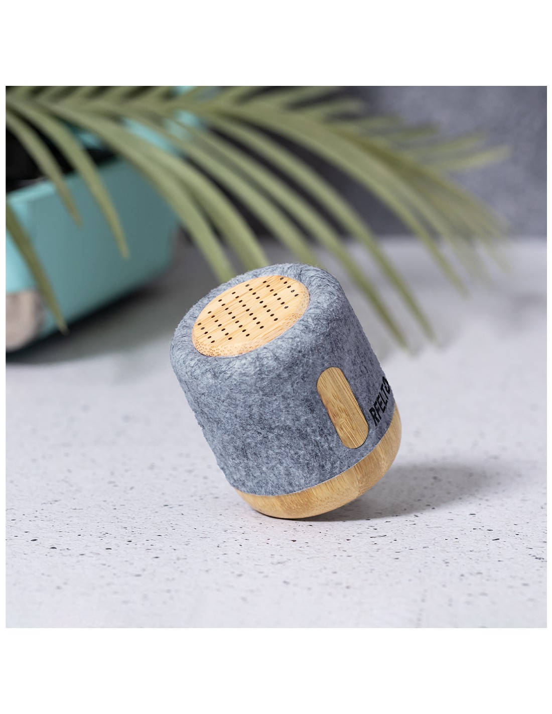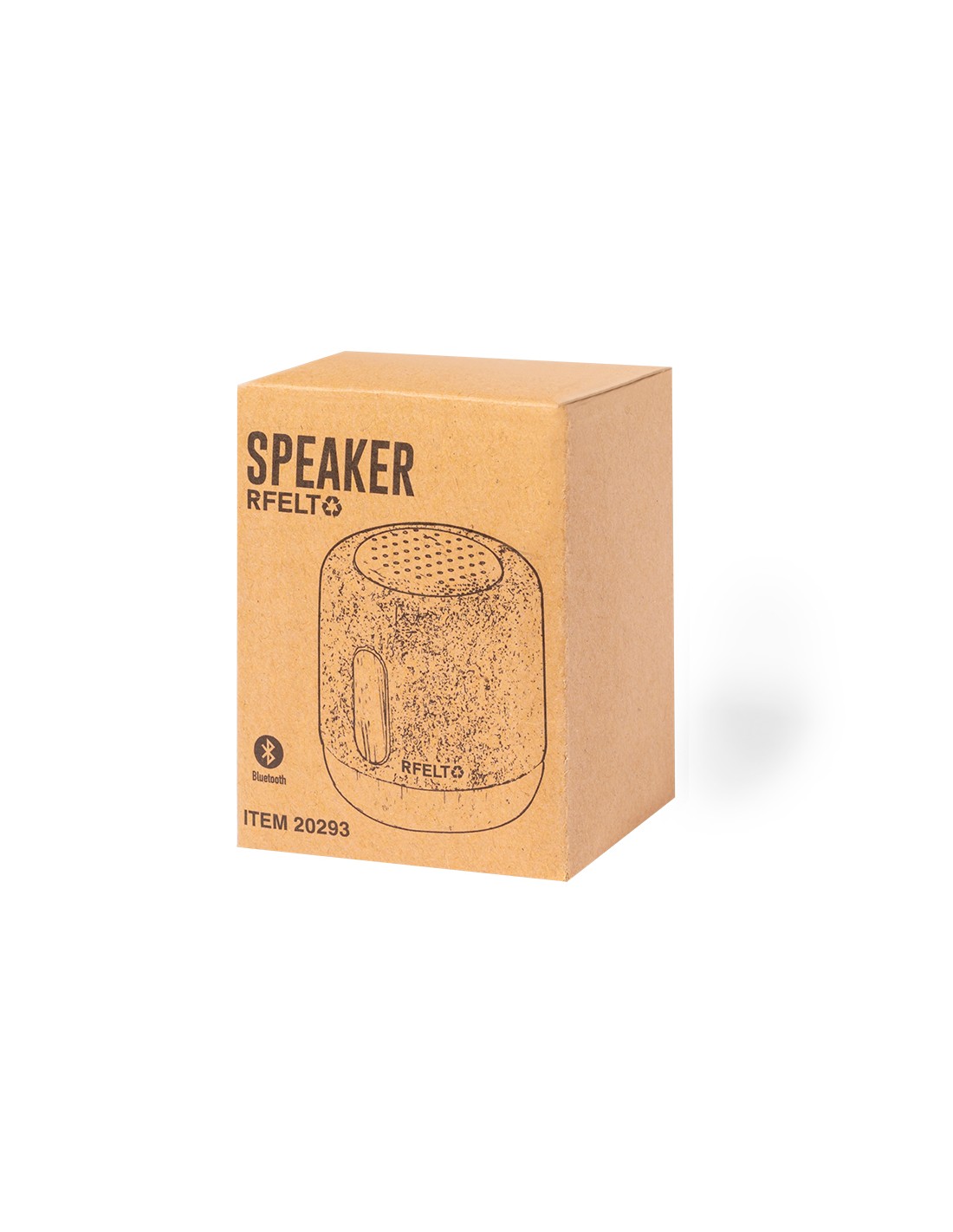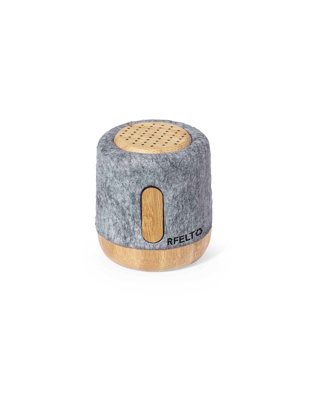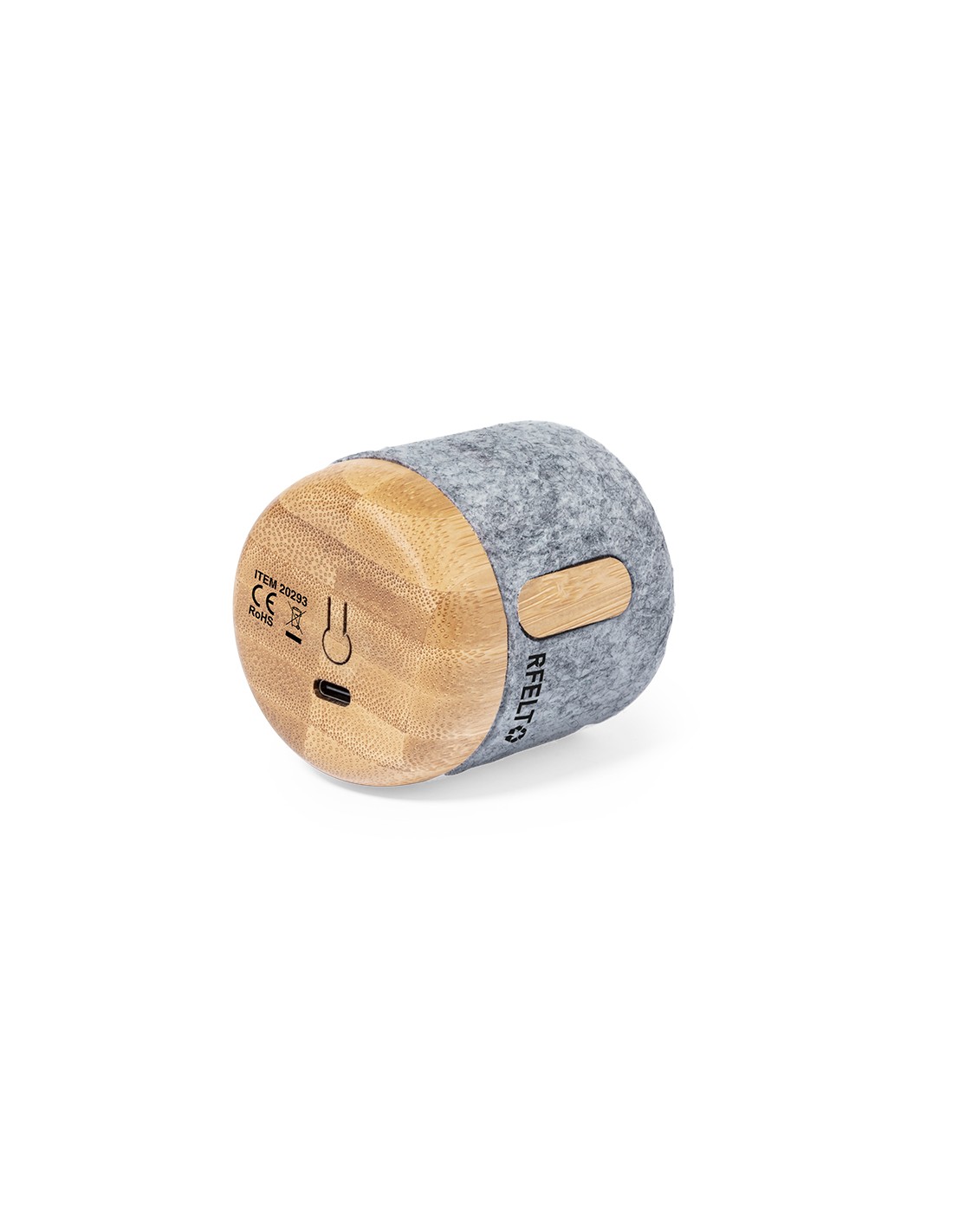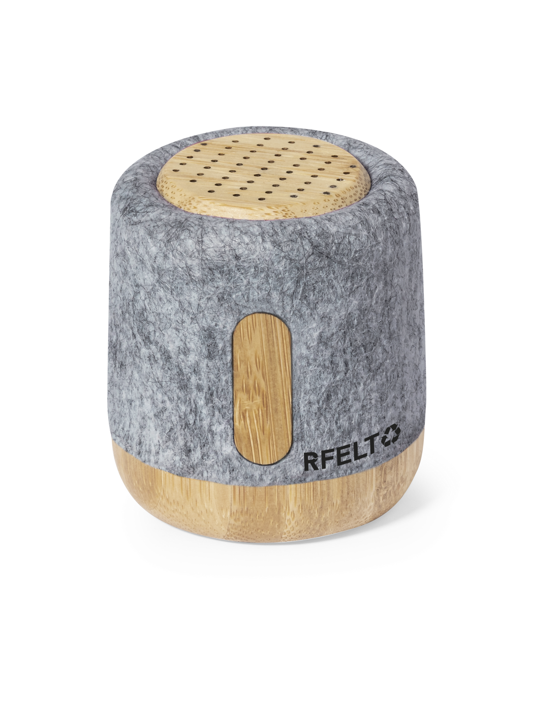 Altavoz con conexión Bluetooth. Carcasa fabricada en bambú y fieltro RPET. Con 3W de potencia, batería de 300 mAh y conexión Bluetooth 5.0. Incluye cable cargador Tipo C y manual de instrucciones en español e inglés. Con distintivo RPET y presentado en caja individual de diseño kraft.El fieltro RPET reciclado es fruto de la combinación del proceso de reciclaje de materiales plásticos junto a la técnica milenaria de fabricación del fieltro, dando como resultado un material de eco-tendencia que, además de ser de origen reciclado, también se convierte en reciclable.