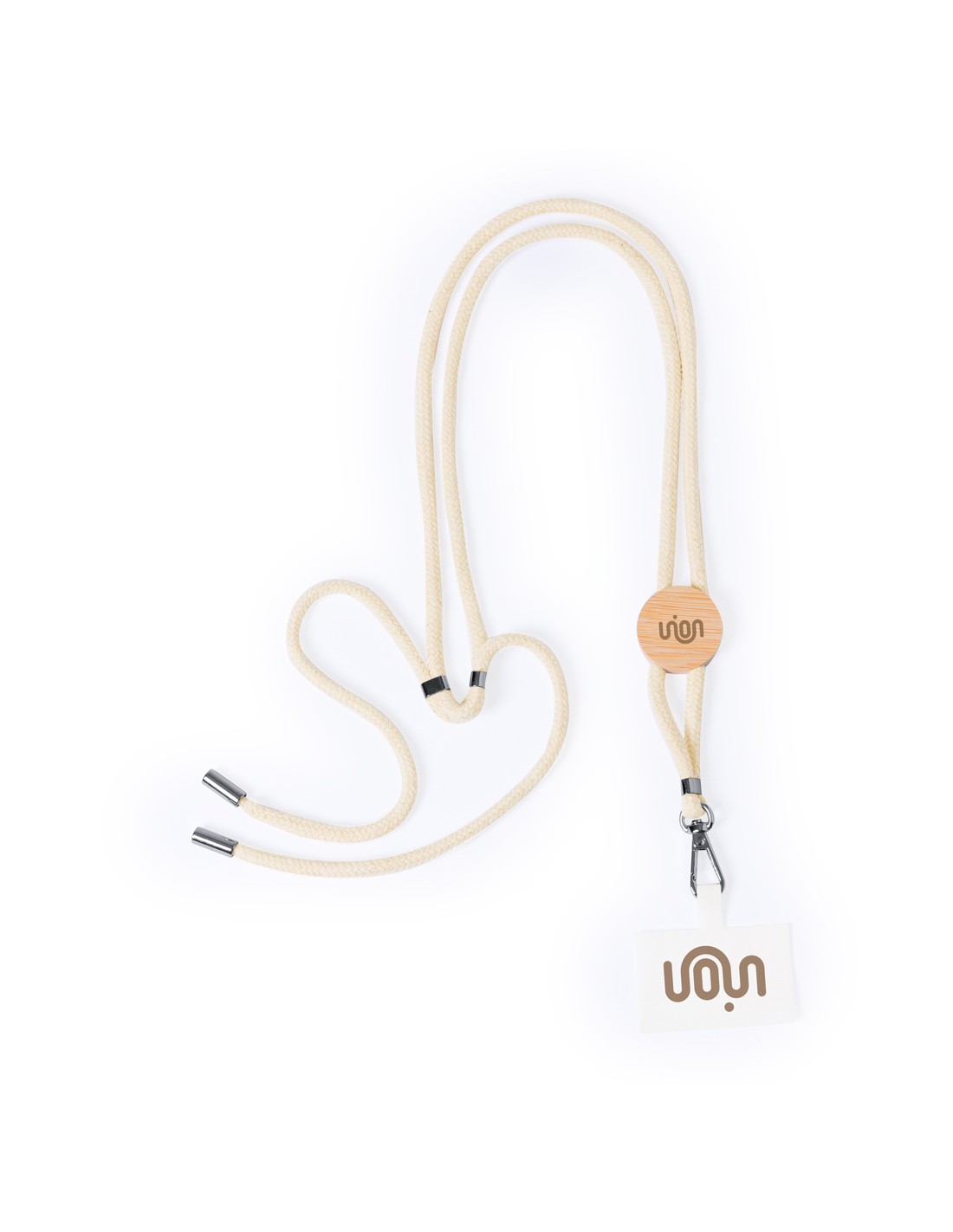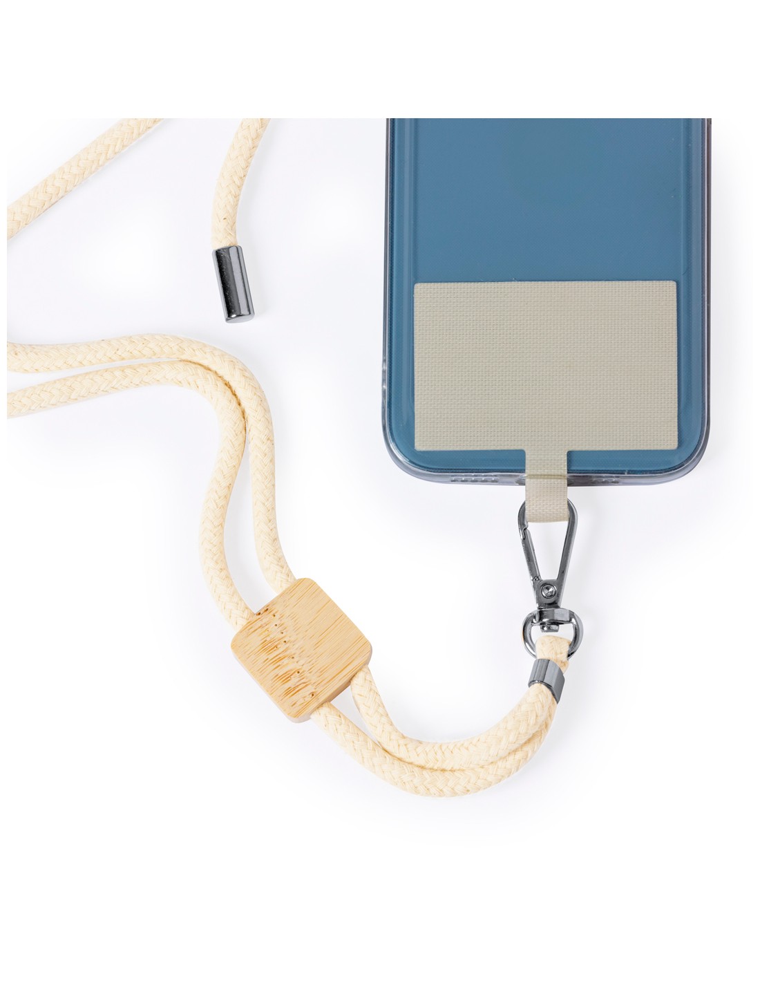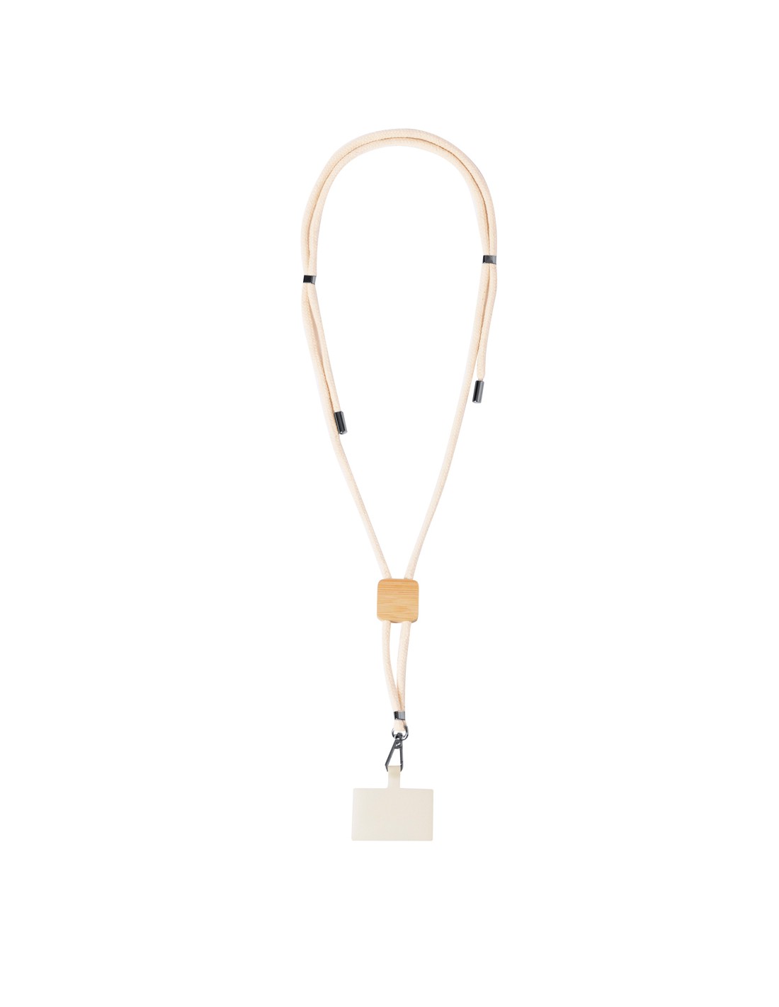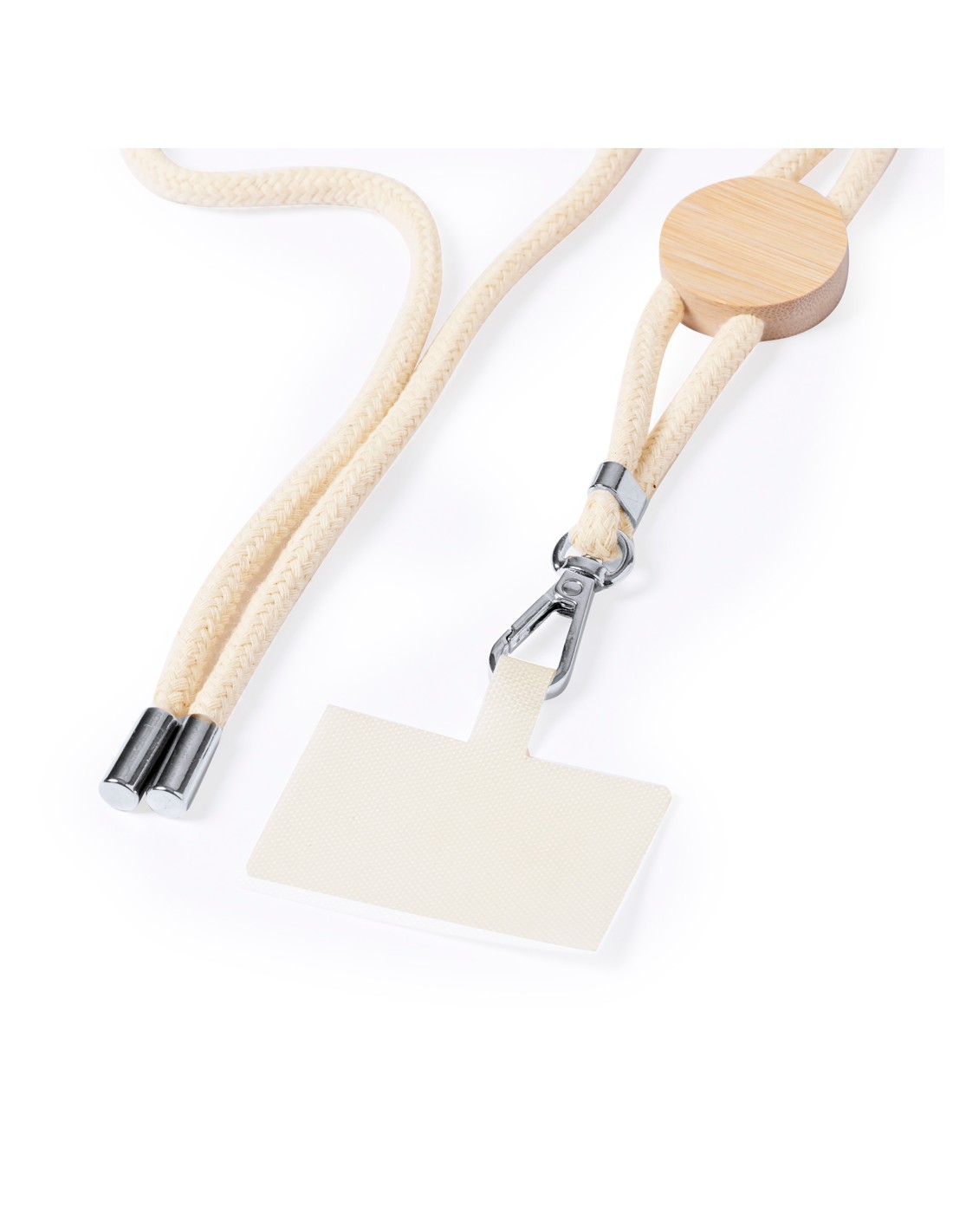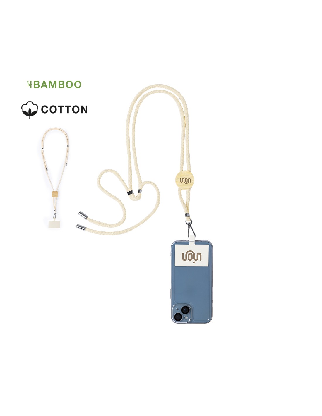 Original lanyard con accesorio para smartphone. Fabricado en resistente algodón, con accesorio de bambú para marcaje. Accesorio de transporte para situar entre la funda y el smartphone y mosquetón giratorio metálico. Ajustadores en cuello, con accesorios cromados en los extremos de los cordones de ajuste.Materiales como el bambú fomentan la utilización de materias primas naturales, reduciendo las emisiones contaminantes. Proviene de una planta de gran resistencia y versatilidad, con crecimiento y regeneración rápidos, siendo una excelente alternativa al uso de madera tradicional.