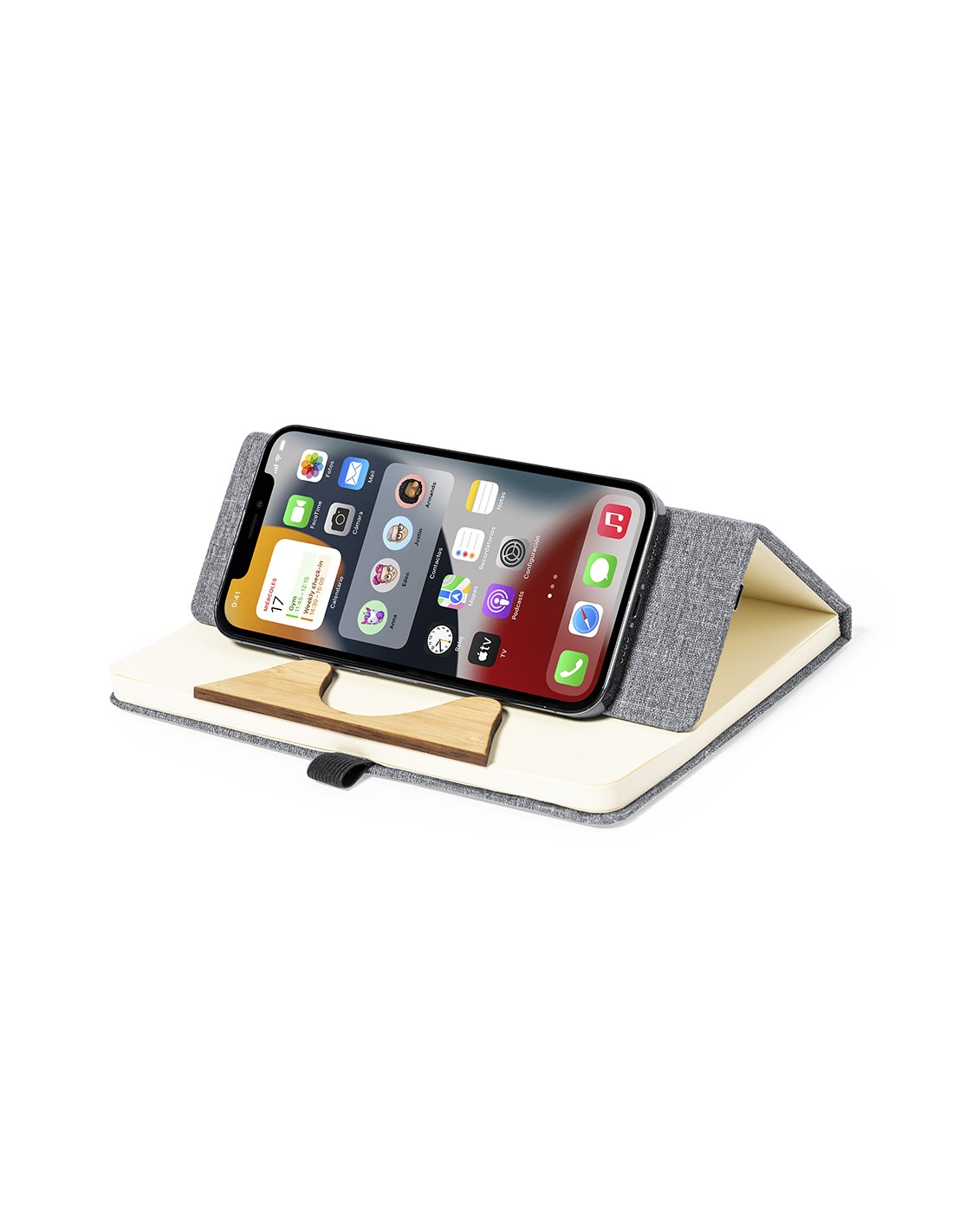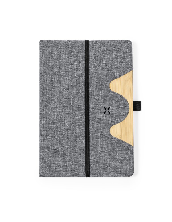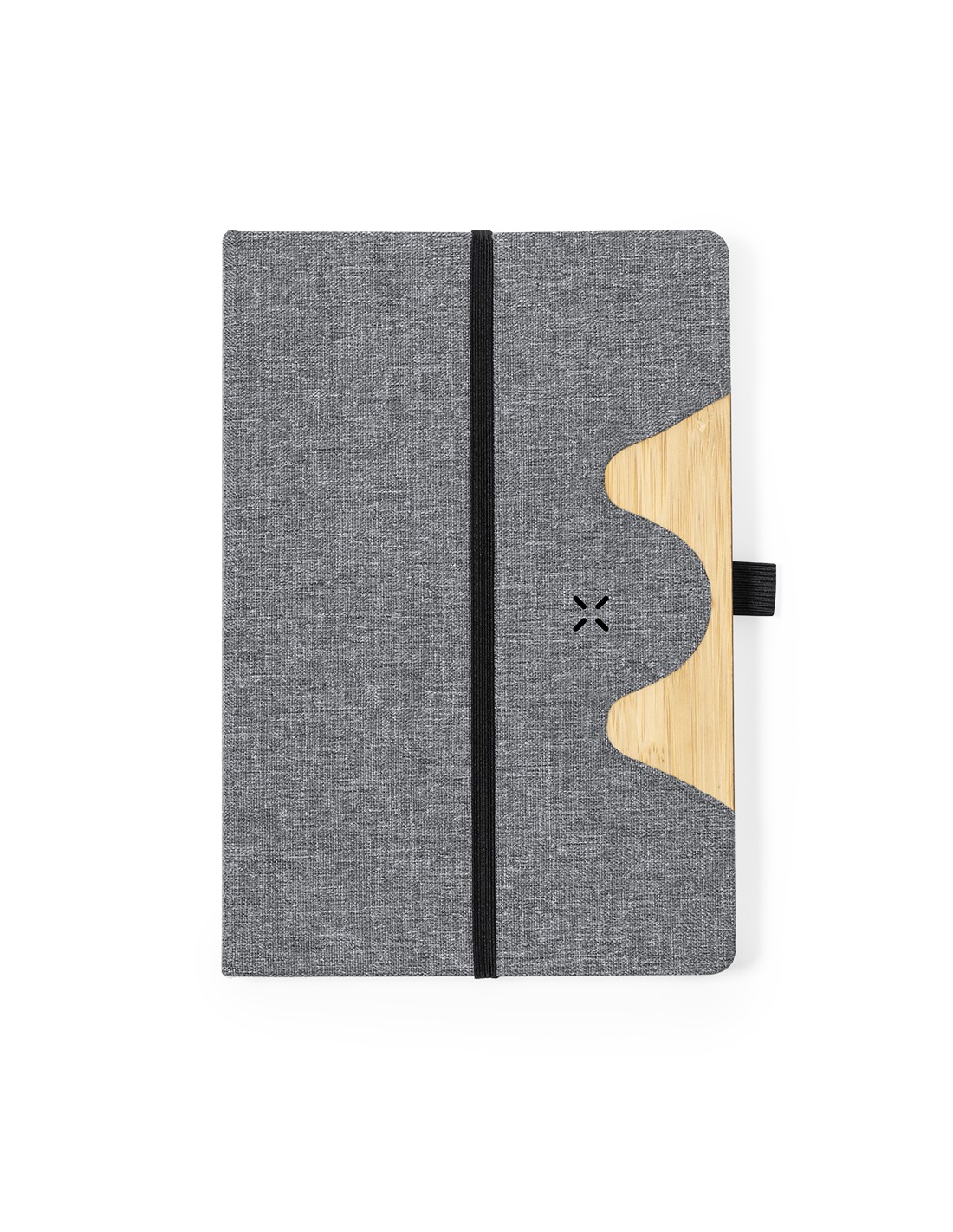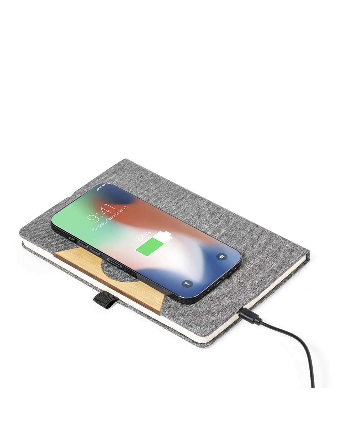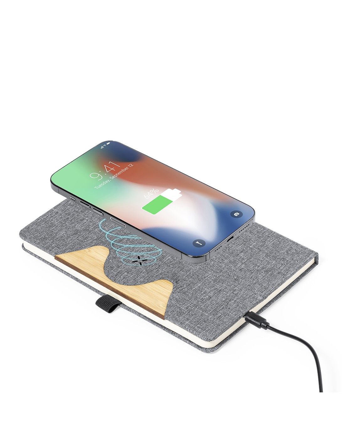 Bloc de notas cargador tamaño A5 y fabricado en resistente poliéster 300D RPET. Portada con detalle en bambú y cargador inalámbrico de 15W integrado, compatible con smartphones con tecnología de carga inalámbrica. Incluido cable de carga Tipo C y disponible manual de instrucciones en español e inglés. Con 80 hojas interiores de disposición a una raya y presentado en bolsa de papel reciclado. El material RPET se elabora a partir de plástico reciclado, para así fomentar la reutilización de residuos plásticos y ayudar a la sostenibilidad del planeta.Materiales como el bambú fomentan la utilización de materias primas naturales, reduciendo las emisiones contaminantes. Proviene de una planta de gran resistencia y versatilidad, con crecimiento y regeneración rápidos, siendo una excelente alternativa al uso de madera tradicional.Fabricado conforme a los estándares RoHS y en cumplimiento con los siguientes requisitos de seguridad: Sistema de protección contra sobrecalentamiento. Sistema de protección contra sobrecarga. Sistema de bloqueo para evitar cortocircuitos.