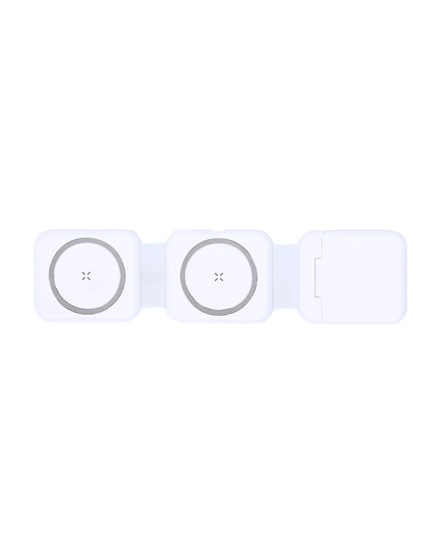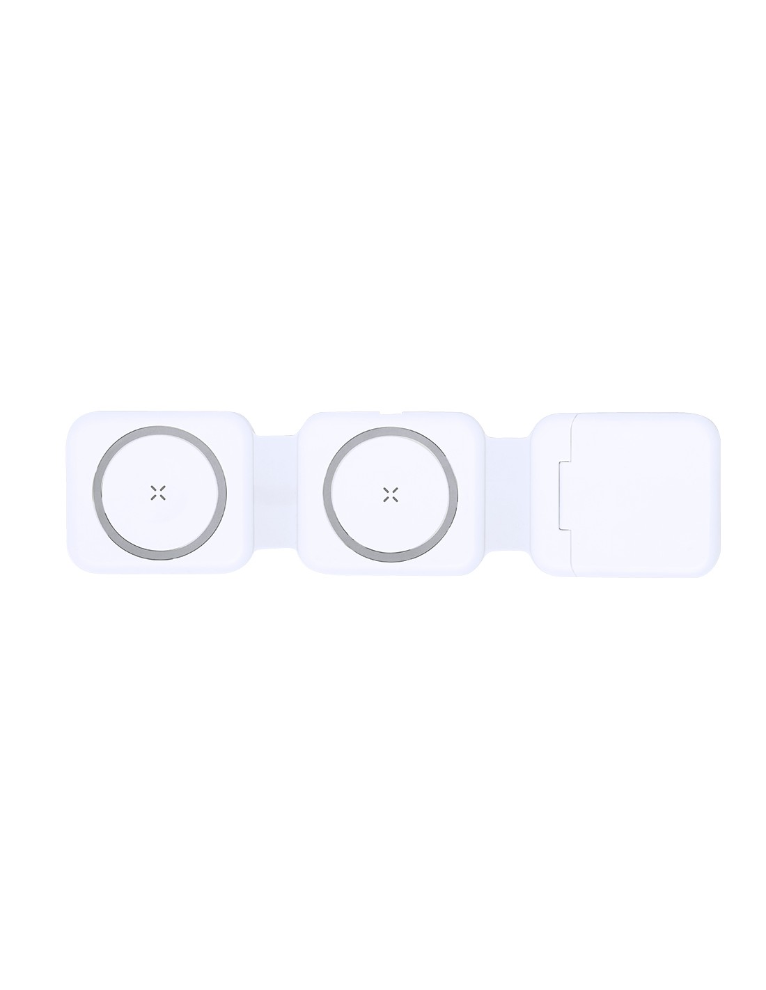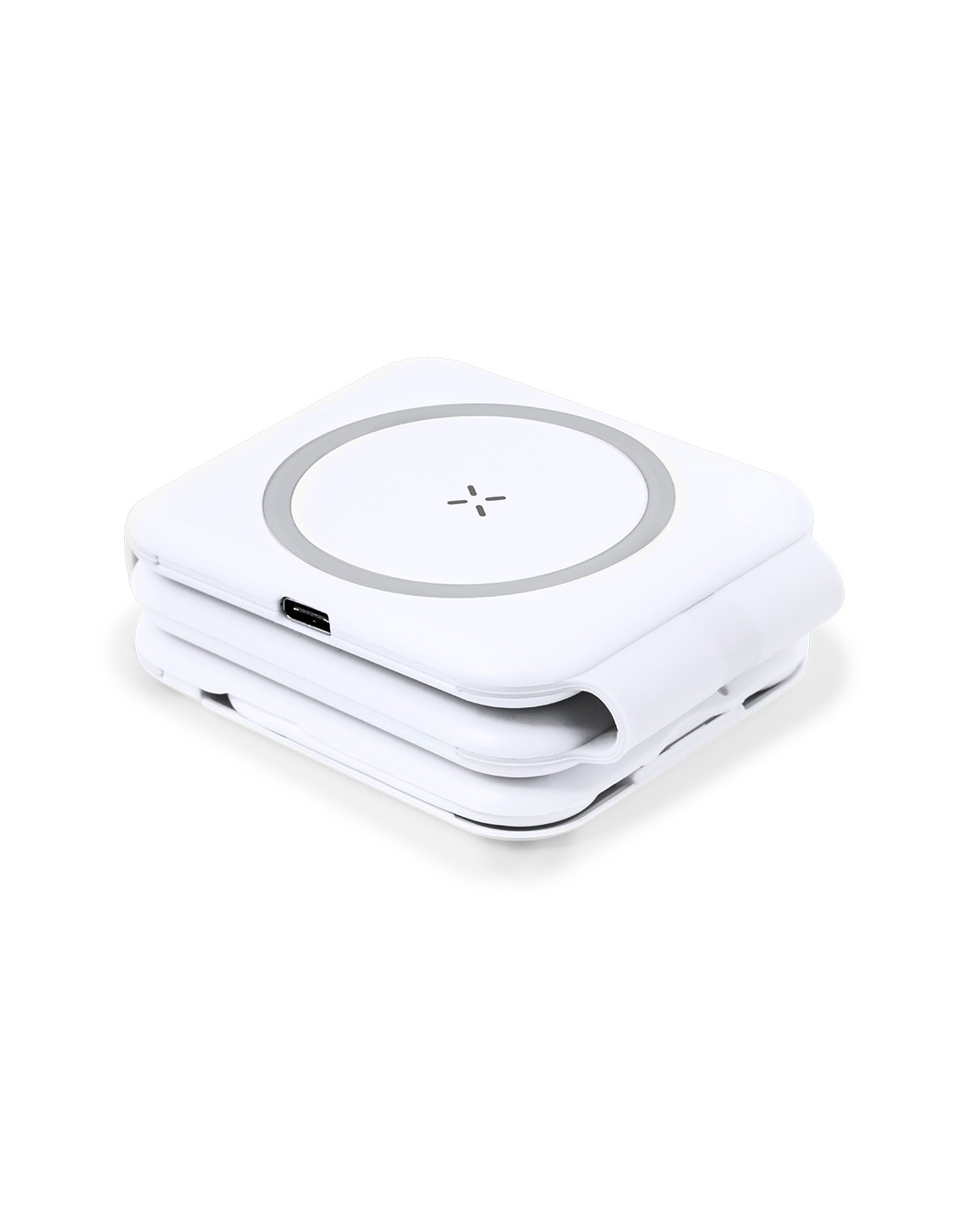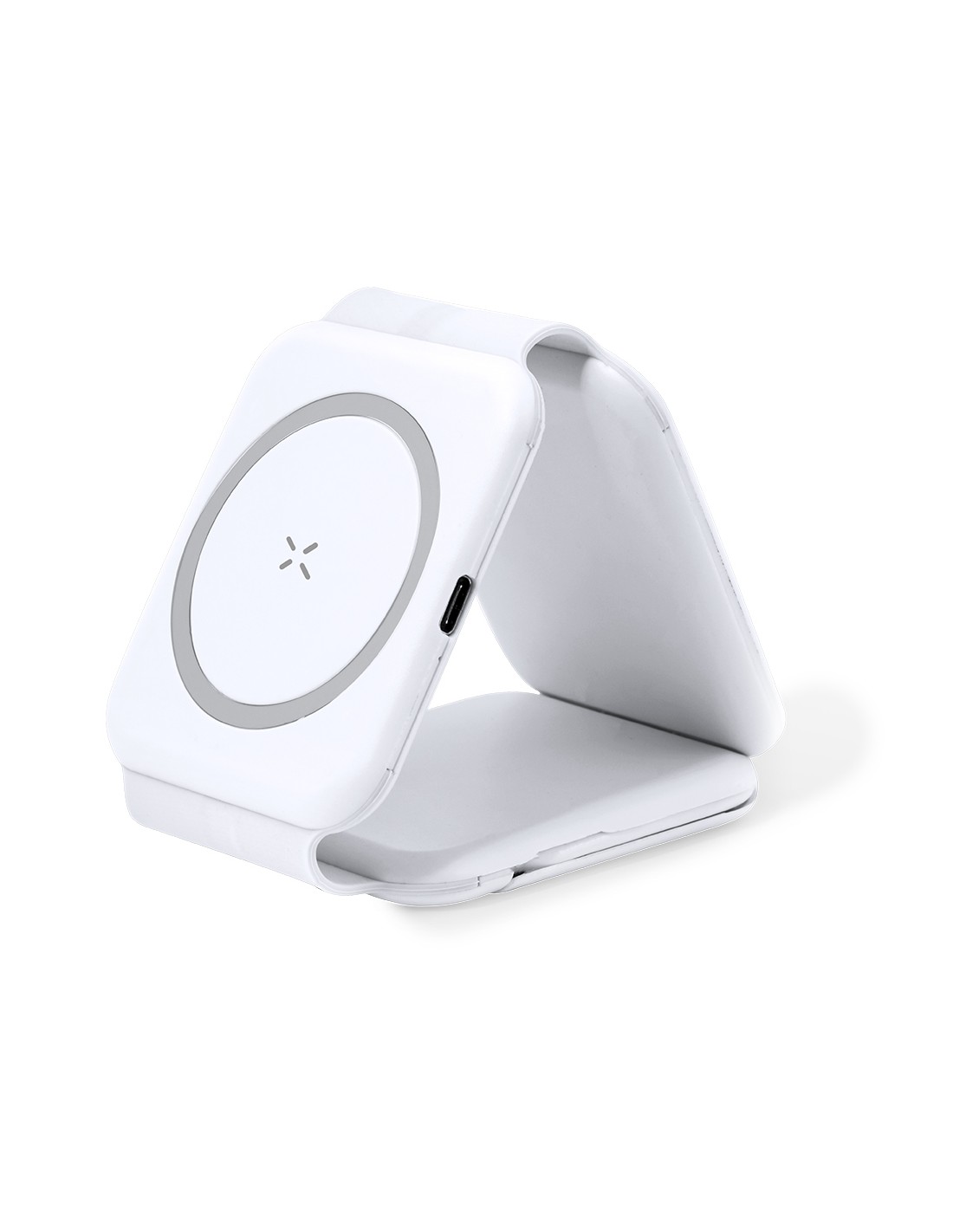 Completo cargador inalámbrico magnético 15W, diseñado para la carga simultánea del smartphone, auriculares y smartwatch. Se trata de un gadget todo en uno: plegable, portable, de tamaño compacto y muy versátil. Incluye set de cables cargadores sincronizadores -aptos para transferencia de datos- con conexiones Micro USB, Tipo C y Lightning. Además, incorpora un accesorio eyector para tarjeta SIM. Elaborado en resistente ABS de color blanco y presentado en atractiva caja individual de diseño. Disponible manual de instrucciones en español e inglés.Fabricado conforme a los estándares RoHS y en cumplimiento con los siguientes requisitos de seguridad: Sistema de protección contra sobrecalentamiento. Sistema de protección contra sobrecarga. Sistema de bloqueo para evitar cortocircuitos.