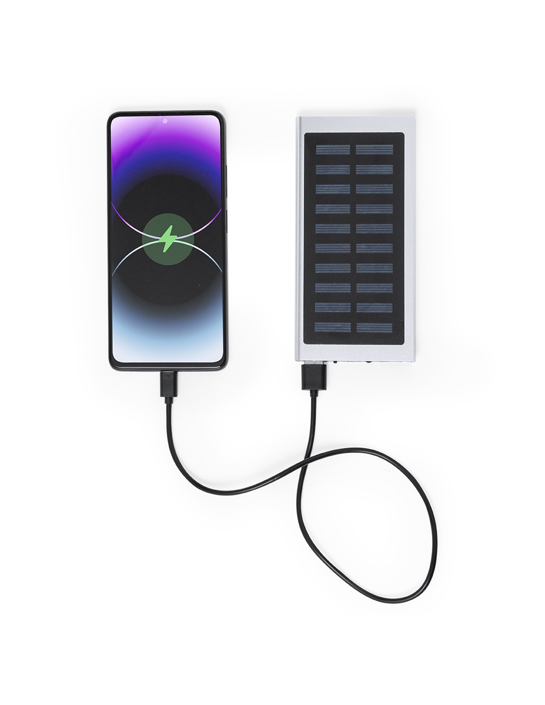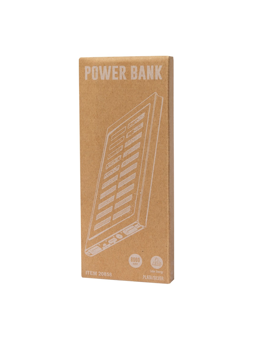 Batería auxiliar externa de recarga solar y de gran capacidad de carga -8.000 mAh-. Fabricada en aluminio, con conector de entrada/salida Tipo C y 2 salidas USB. Presentada en caja individual de diseño kraft. Disponible manual de instrucciones en español e inglés.Las capacidades mostradas en todas nuestras baterías auxiliares externas son reales, incorporando todas ellas baterías de grado A y no recicladas, con una vida útil de al menos 500 ciclos de carga y según normativa CE. Además, están fabricadas conforme a los estándares RoHS y en cumplimiento con los siguientes requisitos de seguridad:Sistema de protección contra sobrecarga del power bank.Sistema de protección contra descarga completa que proporciona una mayor durabilidad del power bank.Sistema de bloqueo para evitar cortocircuitos.Sistema de transferencia de carga constante, acorde con la capacidad del dispositivo de destino.