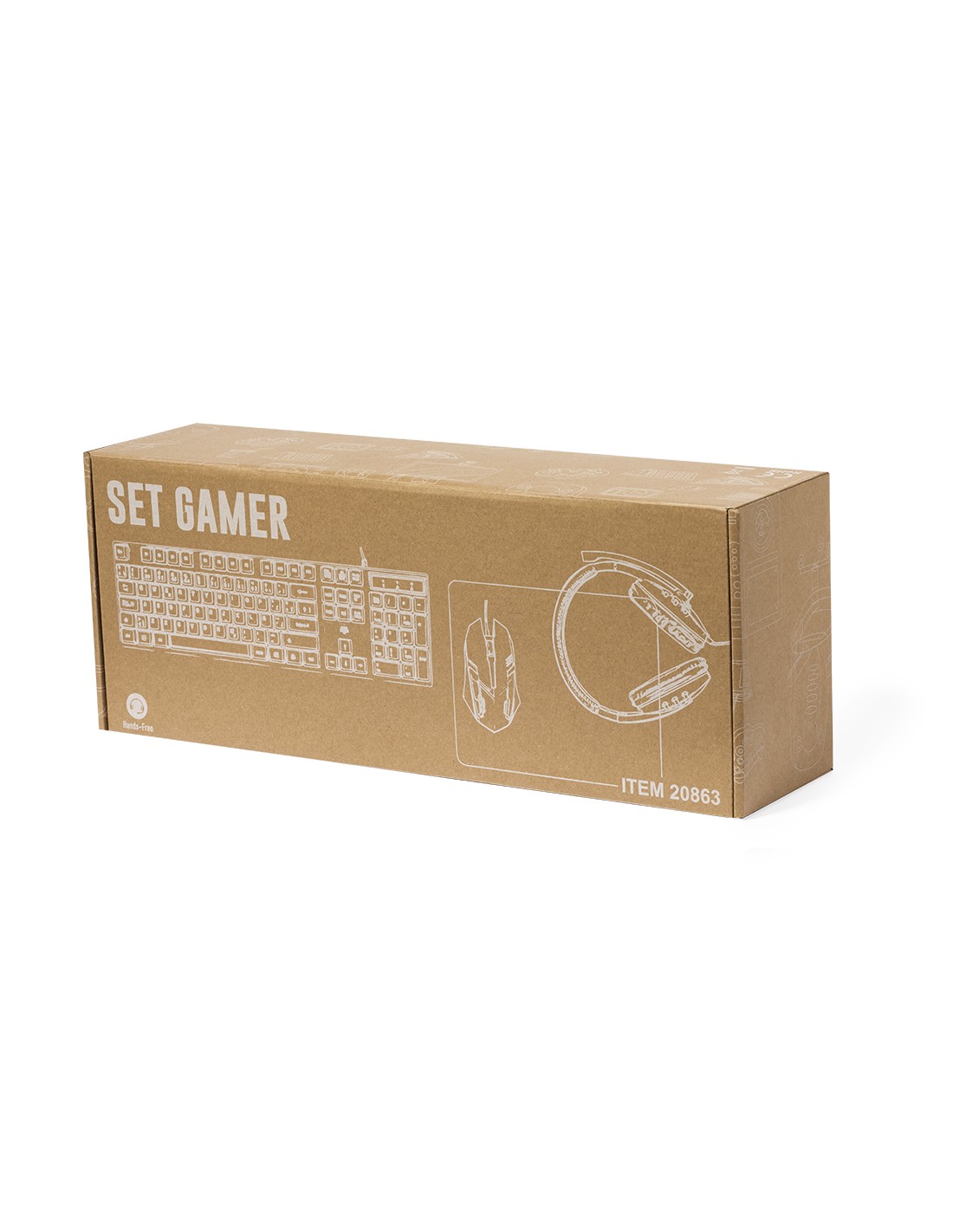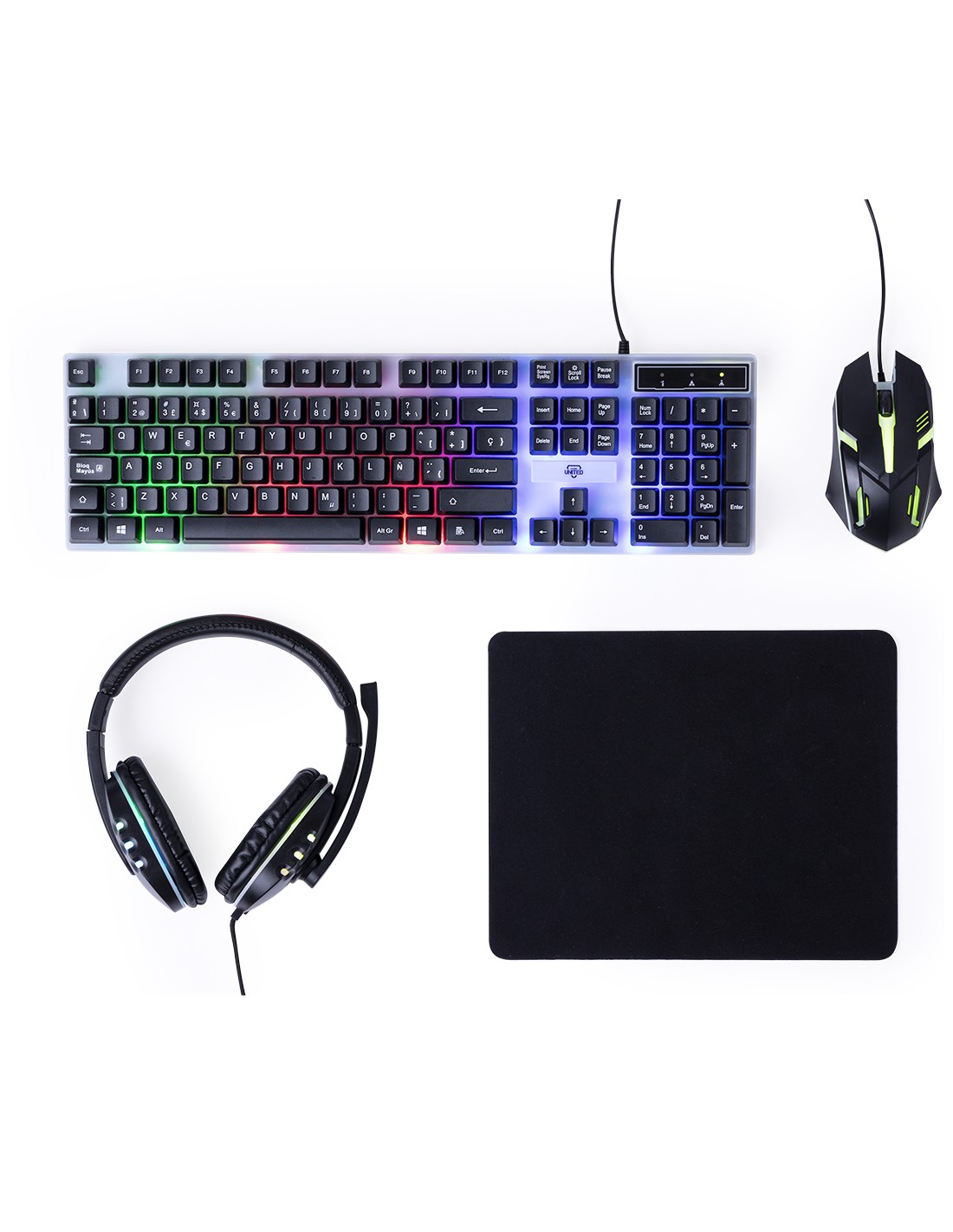 Set gamer para una experiencia de videojuego inmersiva. Incluye ratón óptico y teclado QWERTY en español, ambos retroiuminados con luz LED multicolor y conexión mediante cable USB. Además, incorpora una alfombrilla en suave poliéster, con base de silicona antideslizante perfecta para usar el ratón con precisión. El set lo completan unos auriculares de diadema con sonido envolvente y retroiluminados con luz LED multicolor; micrófono integrado y conexión jack de 3,5mm. Set en elegante acabado de color negro, presentado en caja individual de diseño kraft.