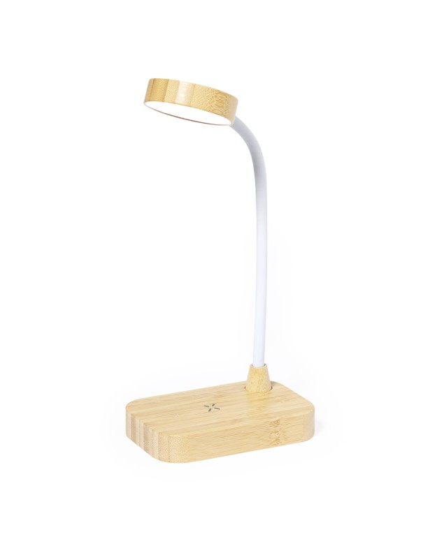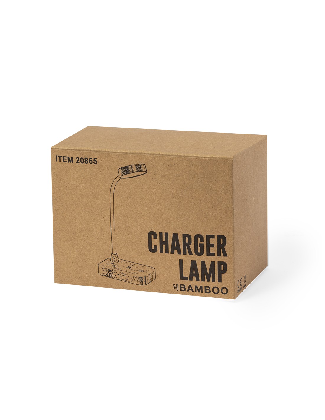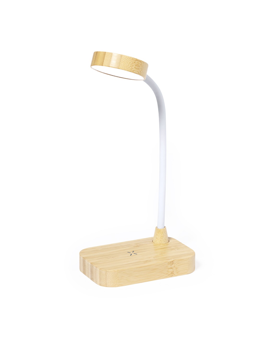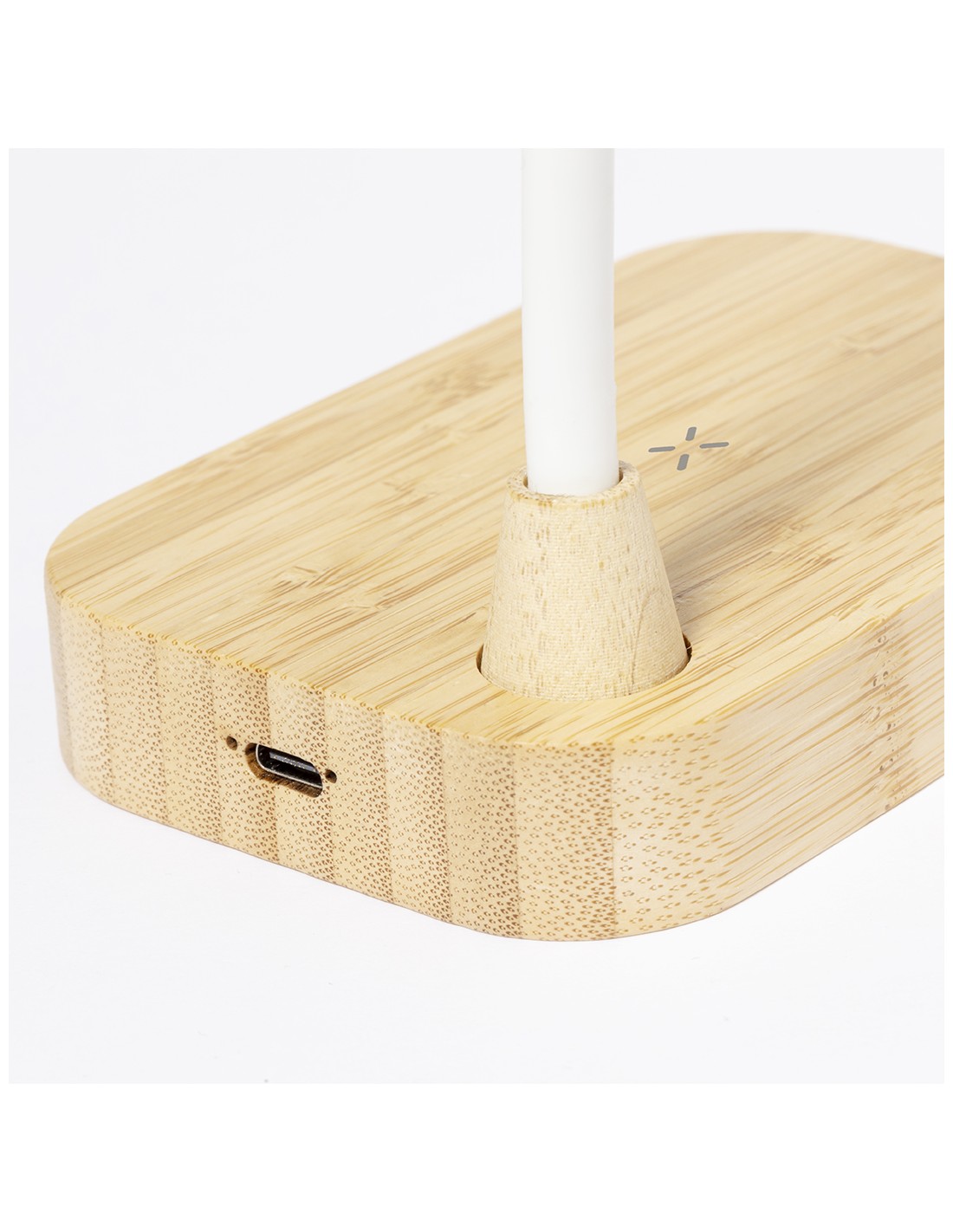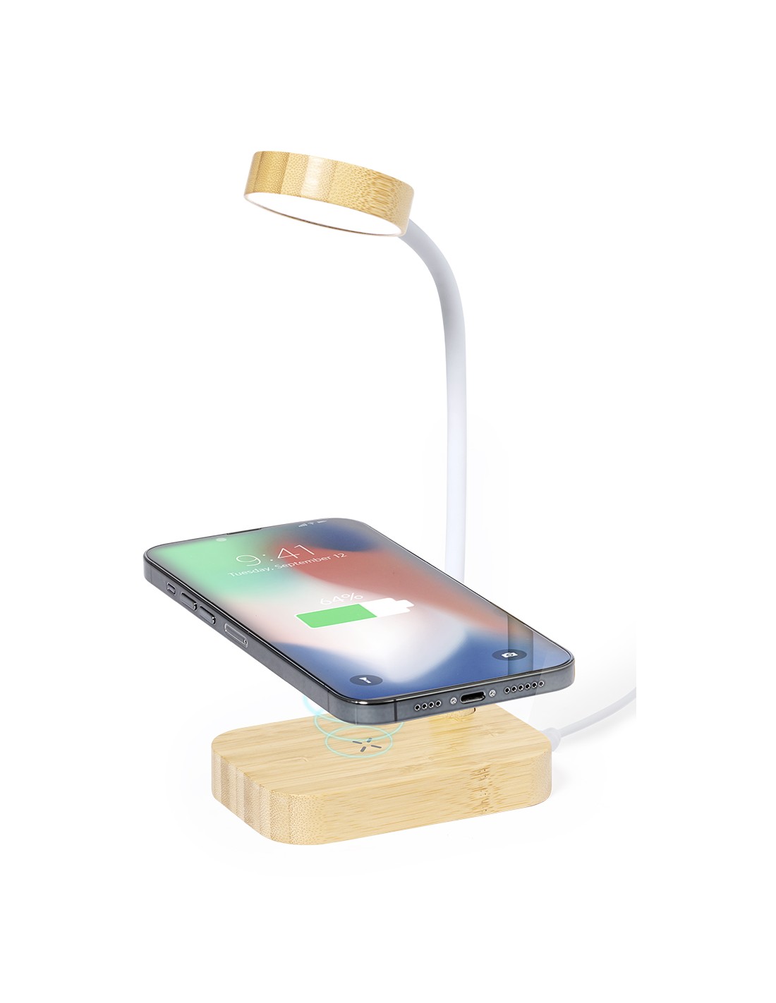 Lámpara cargador fabricada en resistente bambú. Con cargador inalámbrico 15W integrado y lámpara de 12 LEDs, mástil flexible y 3 posiciones de iluminación (cálida, fría y media), además de regulador de intensidad de la luz. Compatible con dispositivos móviles de carga inalámbrica, con cable cargador Tipo C y presentada en una atractiva caja de diseño kraft. Disponible manual de instrucciones en español e inglés.Materiales como el bambú fomentan la utilización de materias primas naturales, reduciendo las emisiones contaminantes. Proviene de una planta de gran resistencia y versatilidad, con crecimiento y regeneración rápidos, siendo una excelente alternativa al uso de madera tradicional.Fabricada conforme a los estándares RoHS y en cumplimiento con los siguientes requisitos de seguridad:Sistema de protección contra sobrecalentamiento.Sistema de protección contra sobrecarga.Sistema de bloqueo para evitar cortocircuitos.