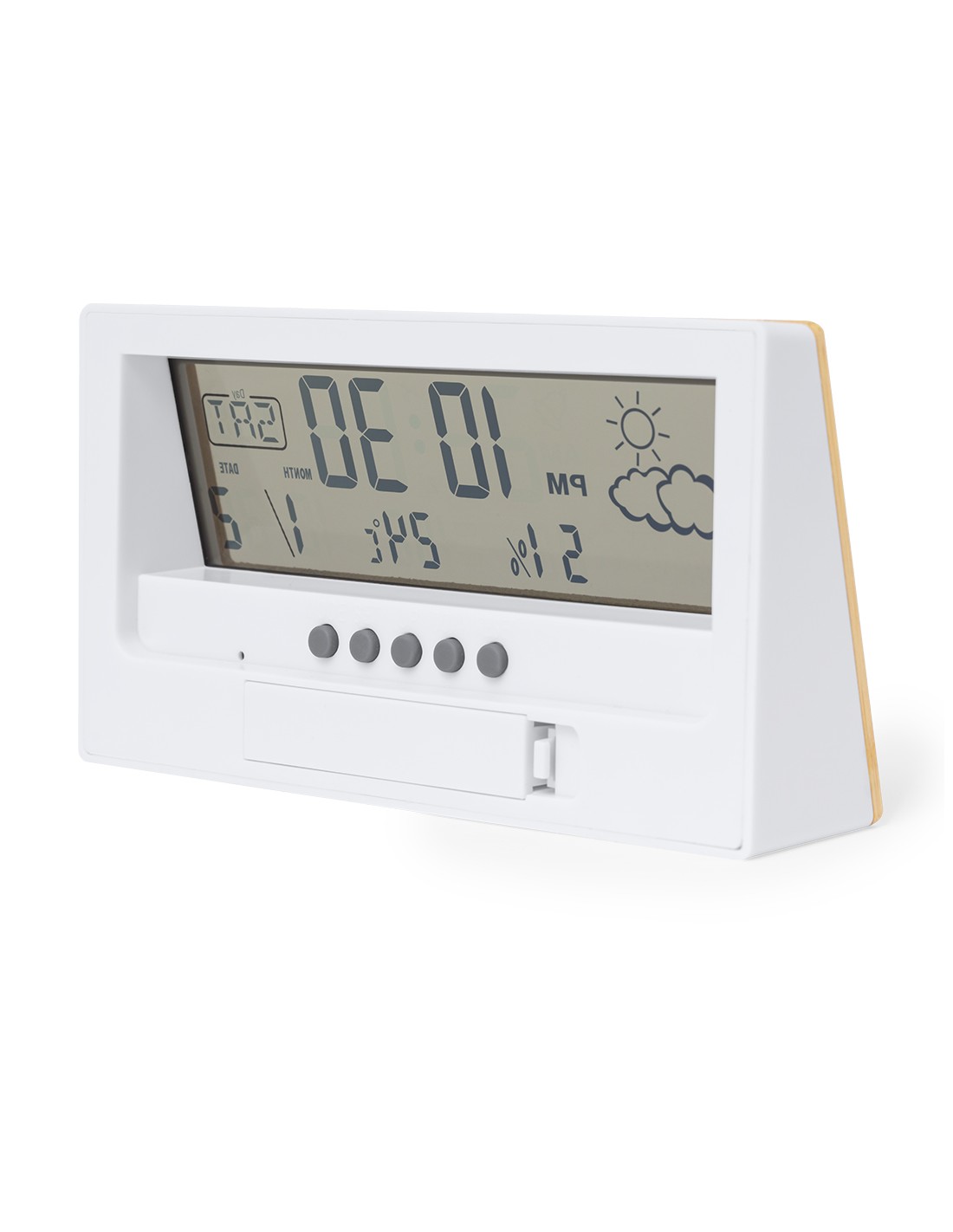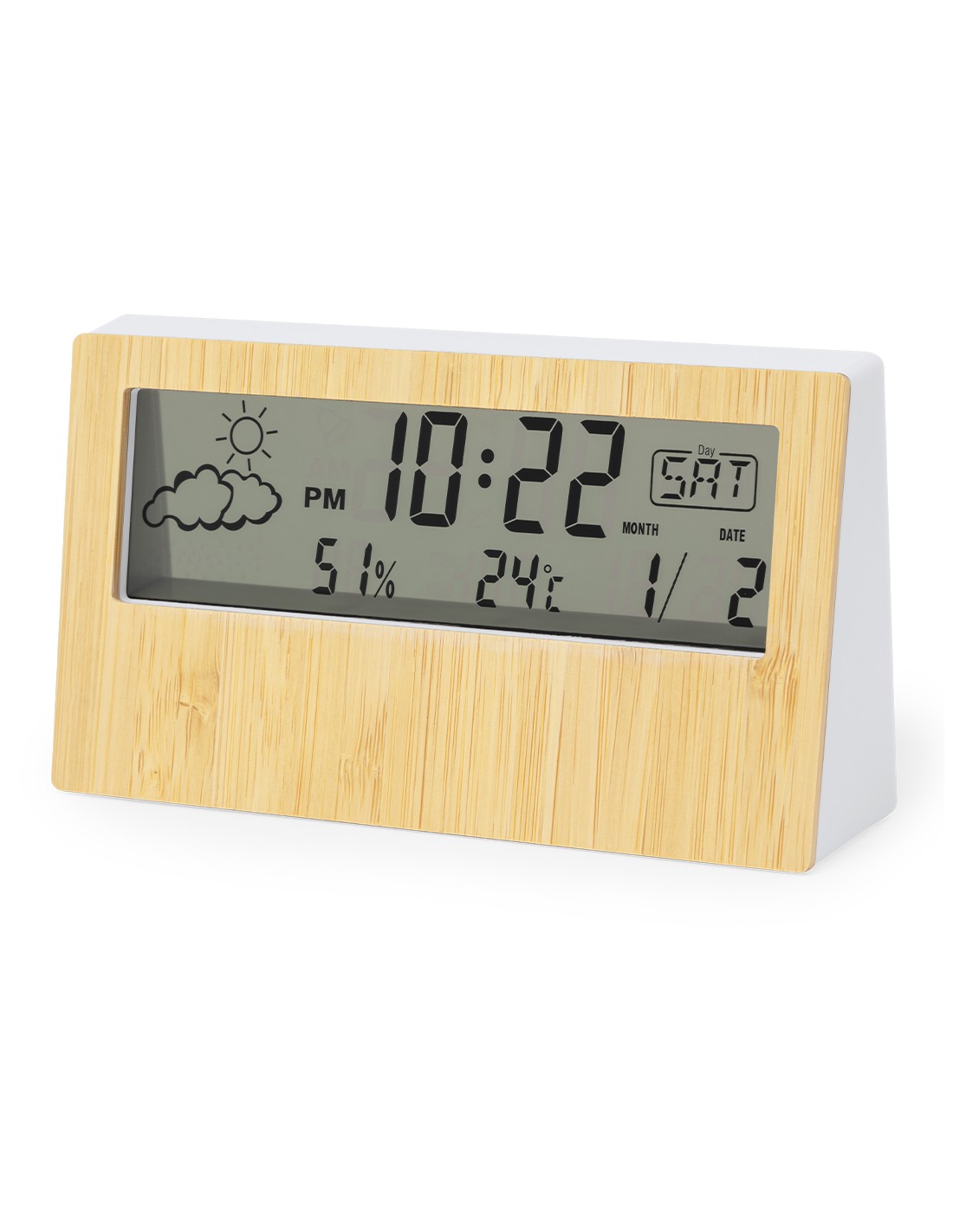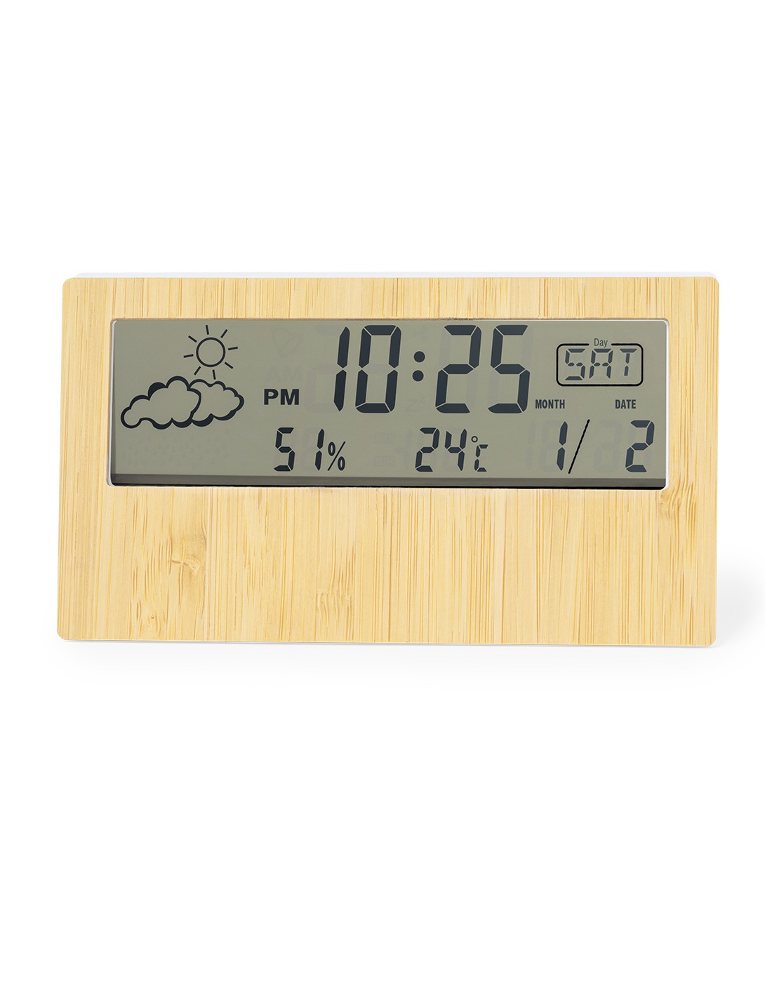 Estación meteorológica con frontal en bambú. Con sensor de temperatura y humedad. Función calendario y alarma. Alimentación a pila (1xAAA no incluida) y presentado en atractiva caja de diseño kraft. Disponible manual de instrucciones en español e inglés.Materiales como el bambú fomentan la utilización de materias primas naturales, reduciendo las emisiones contaminantes. Proviene de una planta de gran resistencia y versatilidad, con crecimiento y regeneración rápidos, siendo una excelente alternativa al uso de madera tradicional.