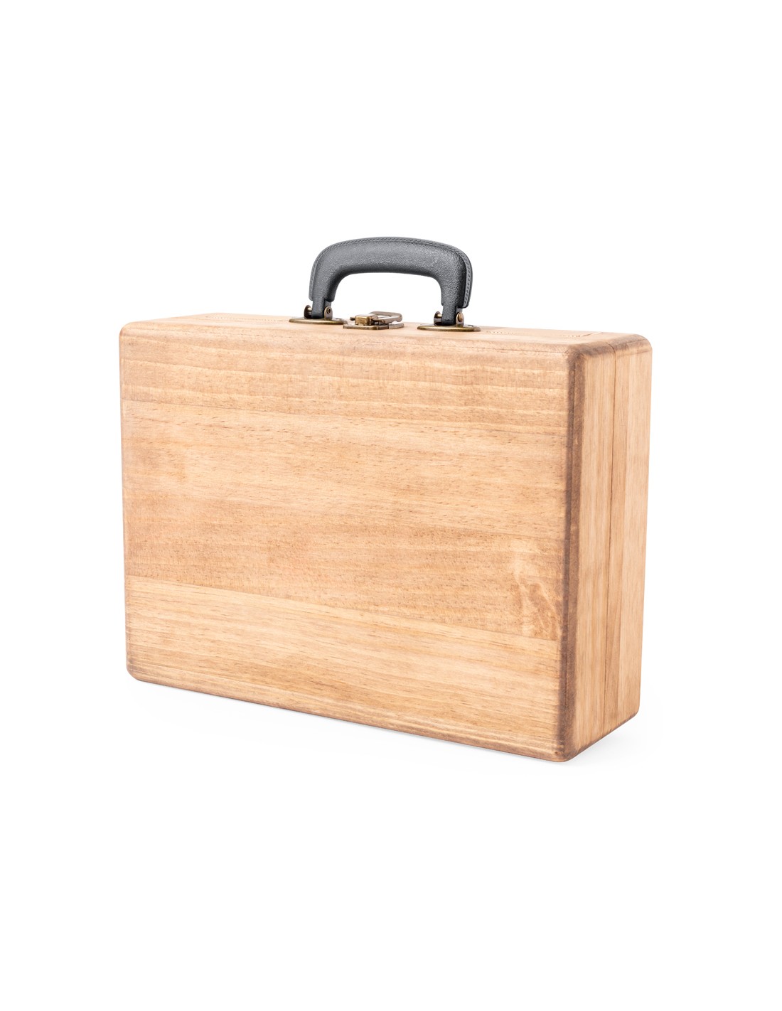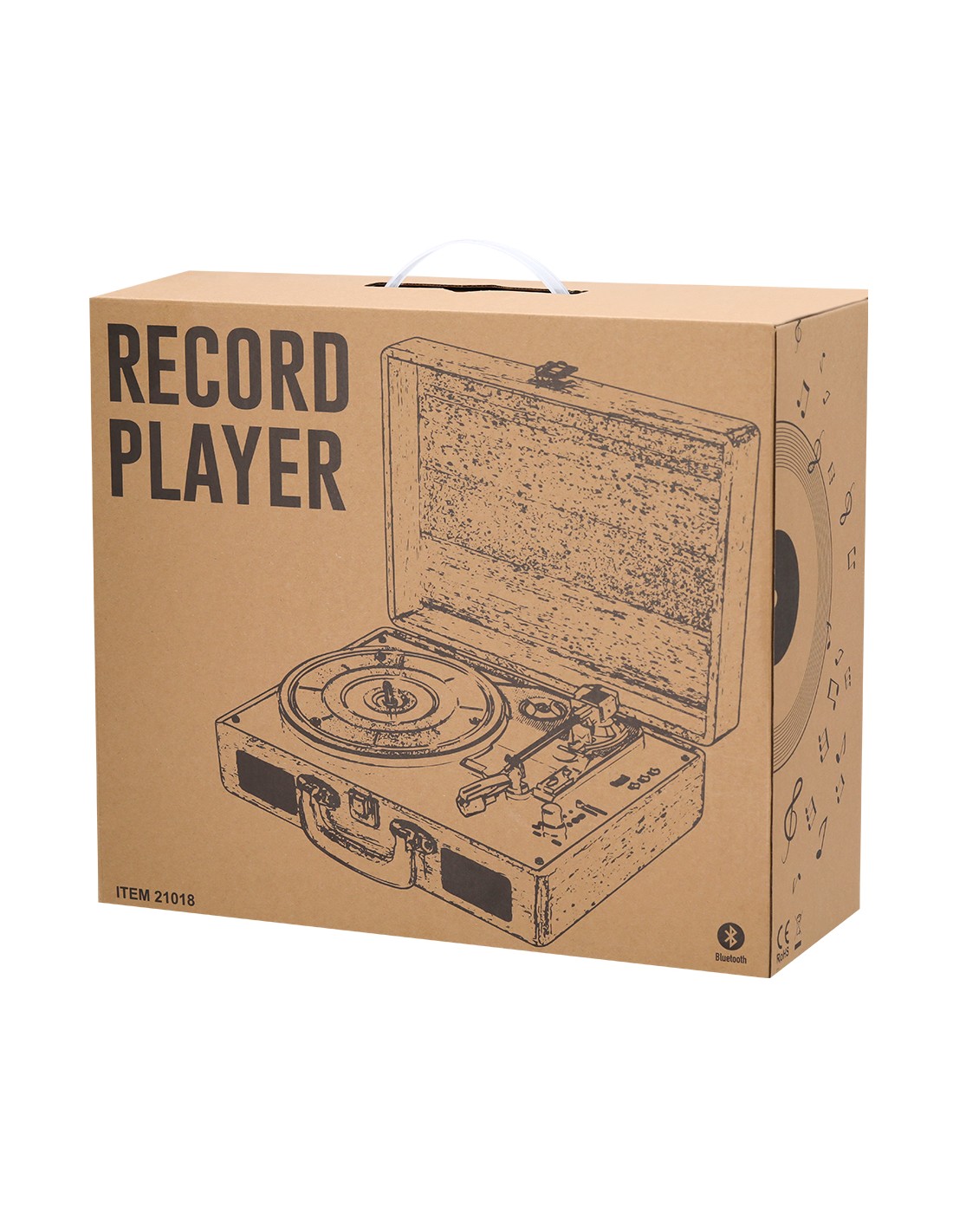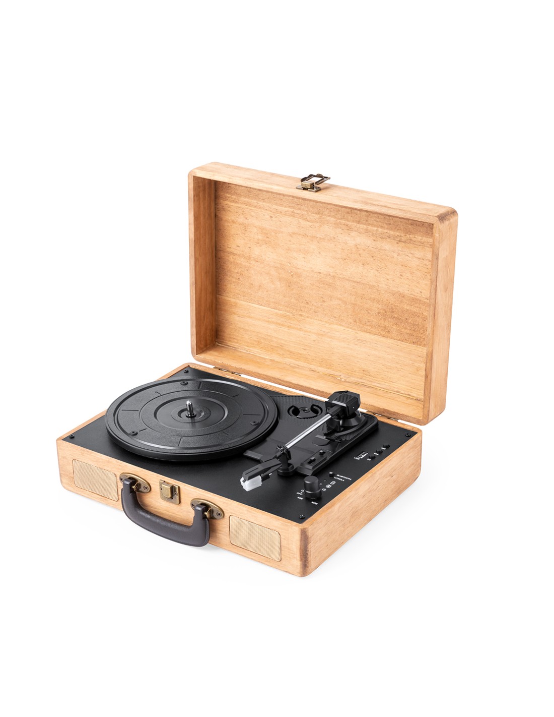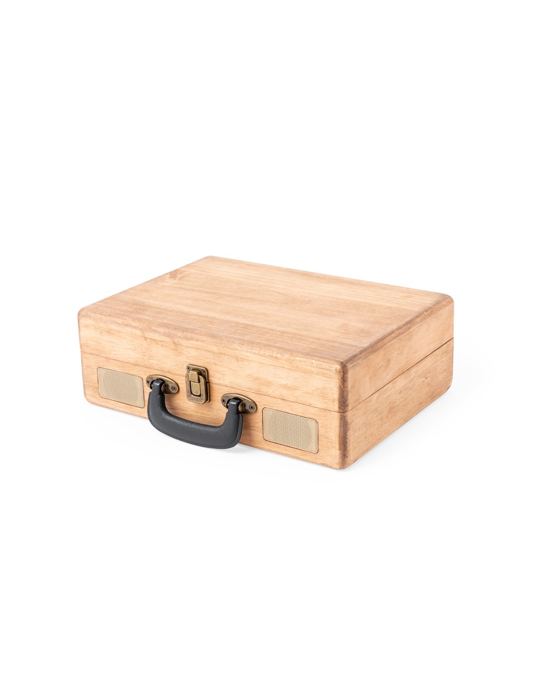 Tocadiscos portátil presentado en un maletín fabricado en madera natural, con cierre de seguridad y asa de transporte. Compatible con discos de 33, 45 y 78 RPM y con adaptador central para singles de 7”. Brazo recto, con función de recogida automática cuando llega al final de cada cara del disco y funda protectora para la aguja cuando no se está usando. Conexión por Bluetooth@ y altavoces estéreo integrados de 3W de potencia, con función reproductor para conectar una memoria USB. Además, ofrece la posibilidad de digitalizar los discos de vinilo de manera sencilla. Salida estéreo RCA para conectar a dispositivos de sonido externos y botón ON/OFF con control de volumen. Incluye una batería interna de 1.200 mAh, pudiendo usarse en cualquier lugar sin necesidad de conectarlo a la red (cable de carga incluido). Viene en caja individual de diseño kraft, con manual de instrucciones en español e inglés.