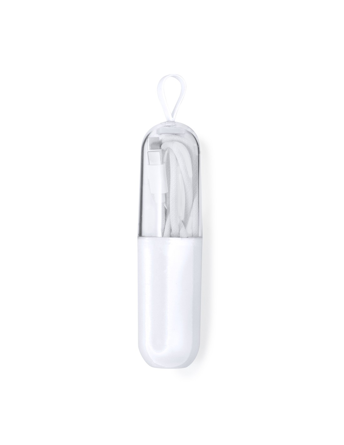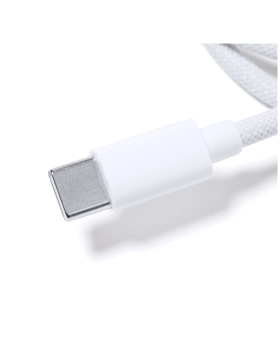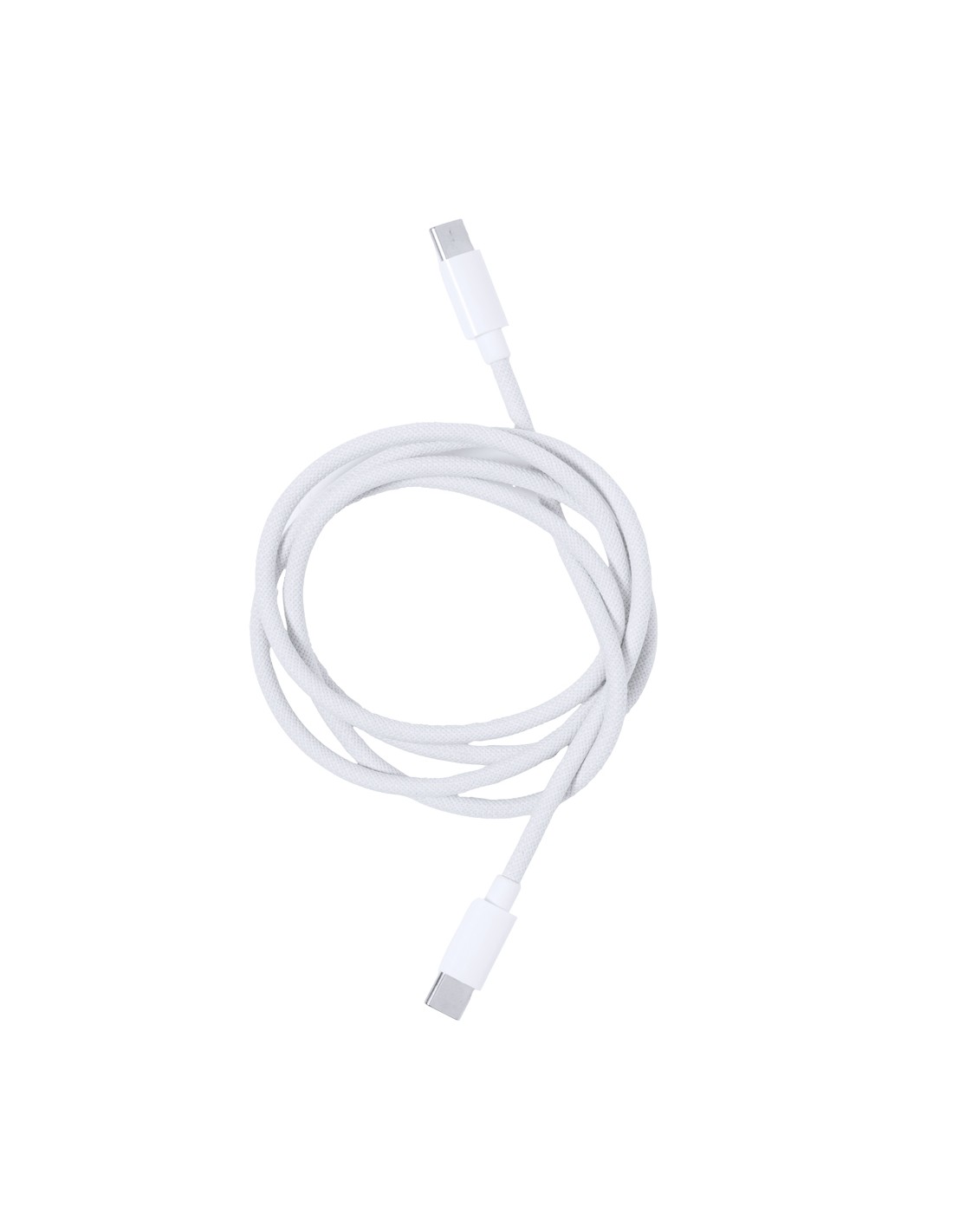Cable cargador con conexión dual Tipo C. De 65W de potencia y apto para transferir datos. 100cm de longitud, con conectores de aluminio y presentado en atractivo estuche con una parte transparente y otra opaca. Con asa de transporte y presentado individualmente en bolsa reciclada.