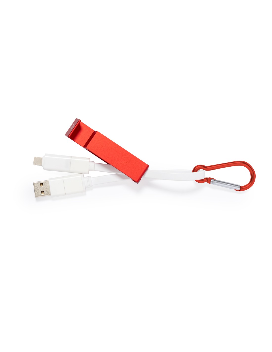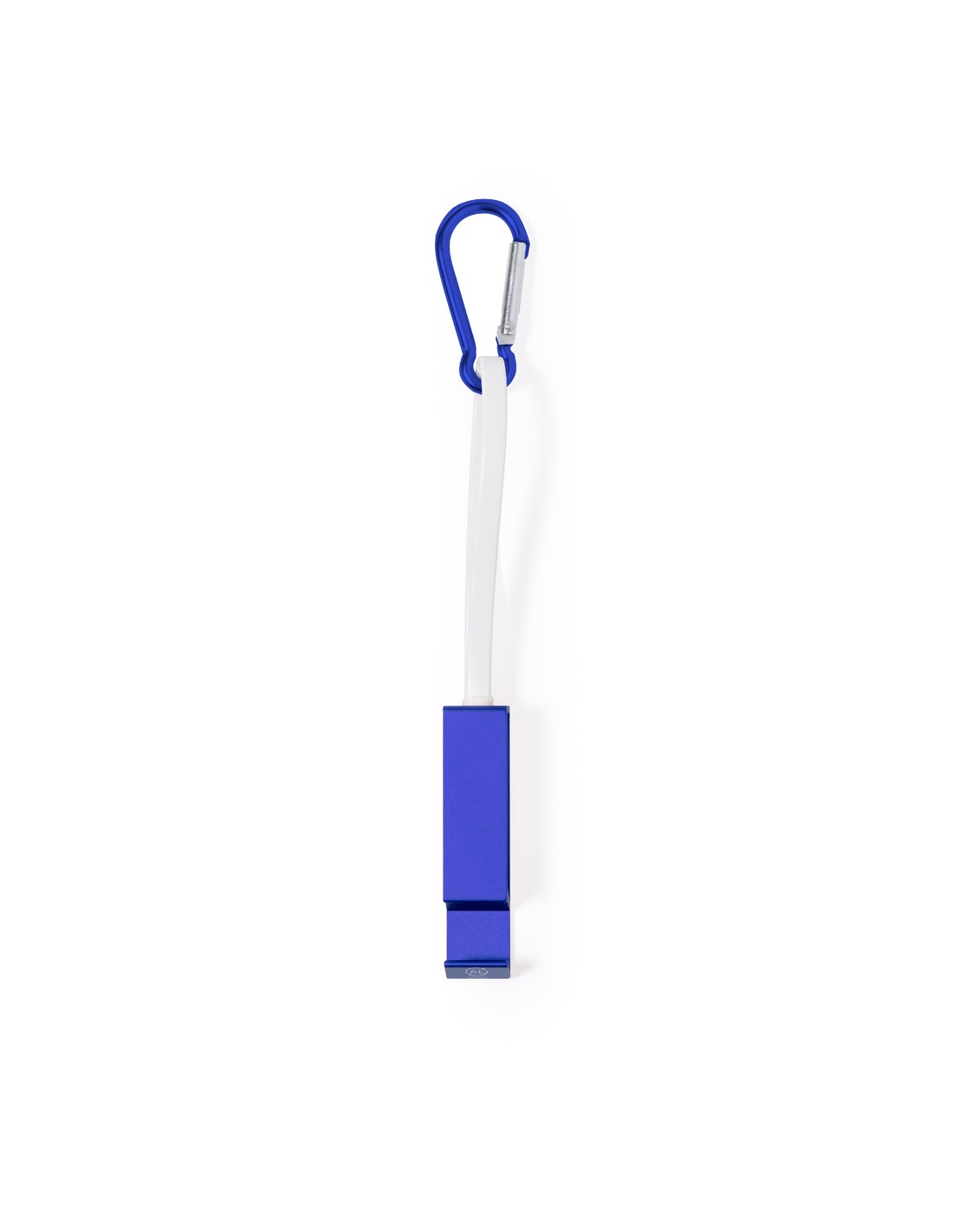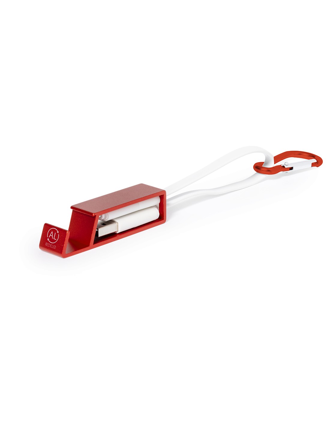 Cable cargador multifunción, fabricado en Aluminio Reciclado y con un ingenioso diseño que permite guardar los cables de carga cómodamente, además de facilitar el transporte. Incluye mosquetón a juego y soporte para smartphone, con conexión Tipo C (entrada y salida) y dual Micro USB / Lightning. En varios colores de acabado metalizado y con logotipo Aluminio Reciclado. Presentado en bolsa reciclada individual.El Aluminio Reciclado es un material con posibilidades de reciclaje casi infinitas, sin perder sus propiedades originales y consumiendo menos energía en este proceso.Certificación GRS (Global Recycled Standard / Estándar de Reciclaje Global), que garantiza el origen reciclado del material usado para fabricar el producto.