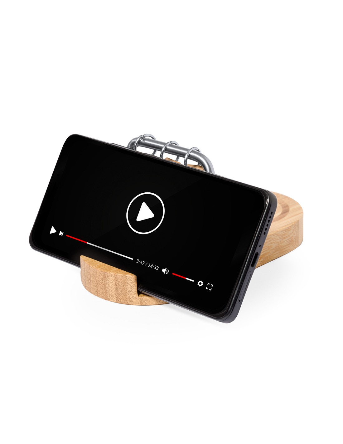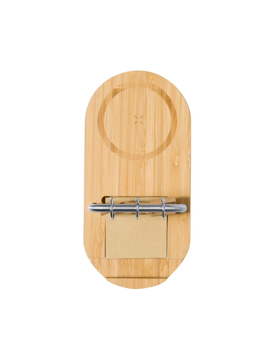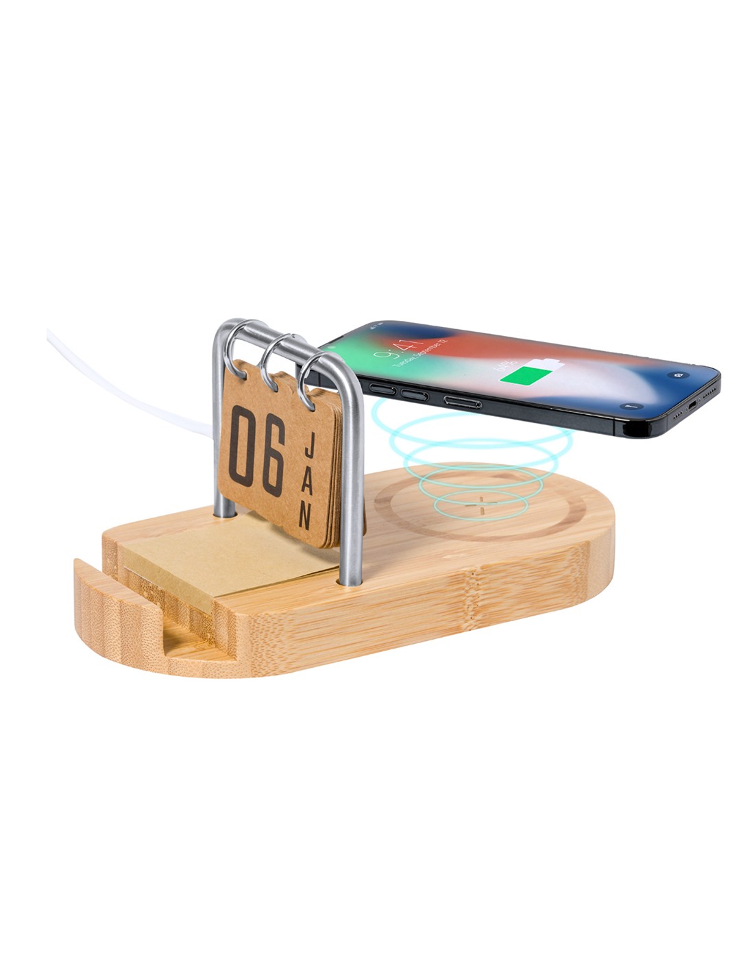 Cargador multifunción inalámbrico 15W fabricado en bambú. Incluye soporte para smartphone y calendario perpetuo, además de un bloc con 50 notas adhesivas acabado kraft de 4,5x4,5 cm. Salida USB y entrada y salida Tipo C, permitiendo cargar de manera simultánea hasta 3 dispositivos (1 mediante carga inalámbrica, 1 mediante cable Tipo C y 1 por cable USB). Compatible con dispositivos equipados con tecnología de carga inalámbrica. Amplia superficie de marcaje y presentado en caja individual de diseño kraft.Materiales como el bambú fomentan la utilización de materias primas naturales, reduciendo las emisiones contaminantes. Proviene de una planta de gran resistencia y versatilidad, con crecimiento y regeneración rápidos, siendo una excelente alternativa al uso de madera tradicional.Fabricado conforme a los estándares RoHS y en cumplimiento con los siguientes requisitos de seguridad:Sistema de protección contra sobrecalentamiento.Sistema de protección contra sobrecarga.Sistema de bloqueo para evitar cortocircuitos.