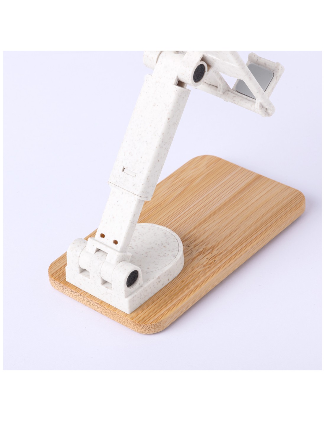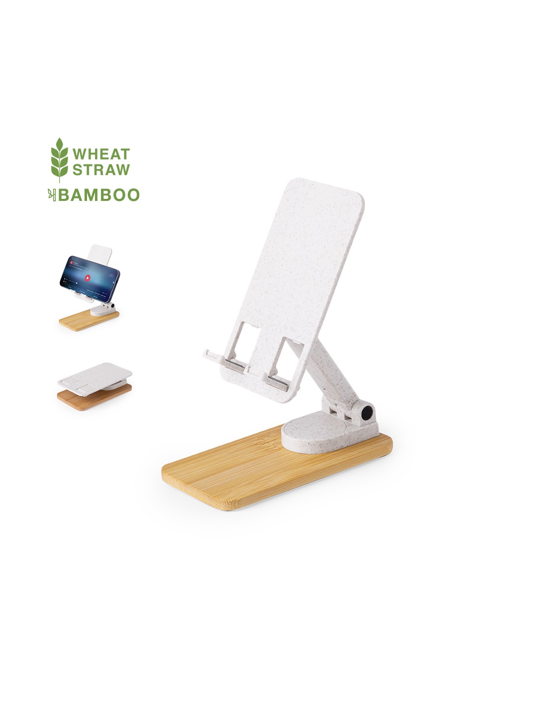 Soporte plegable para smartphones y tablets, fabricado en caña de trigo y con base en resistente bambú. Regulable en altura, con almohadillas de goma antideslizantes en base y soporte. Amplia superficie de marcaje, especialmente indicado para impresión en tampografía en el soporte y en láser en la base. Materiales como el bambú fomentan la utilización de materias primas naturales, reduciendo las emisiones contaminantes. Proviene de una planta de gran resistencia y versatilidad, con crecimiento y regeneración rápidos, siendo una excelente alternativa al uso de madera tradicional.La caña de trigo fomenta la utilización de materias primas naturales, reduciendo así las emisiones contaminantes.