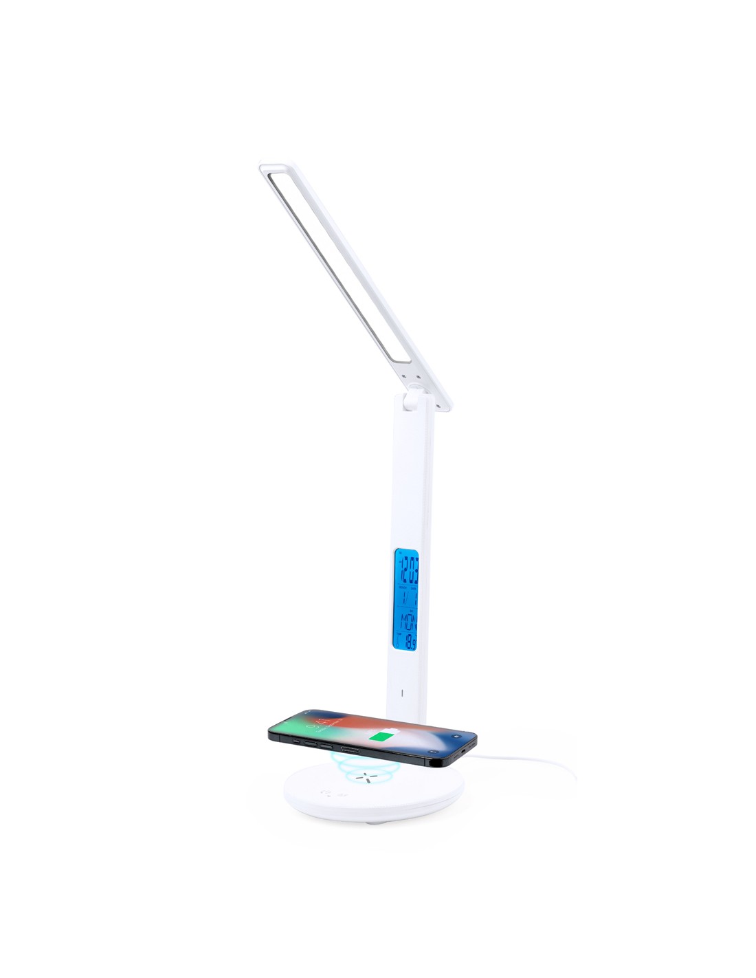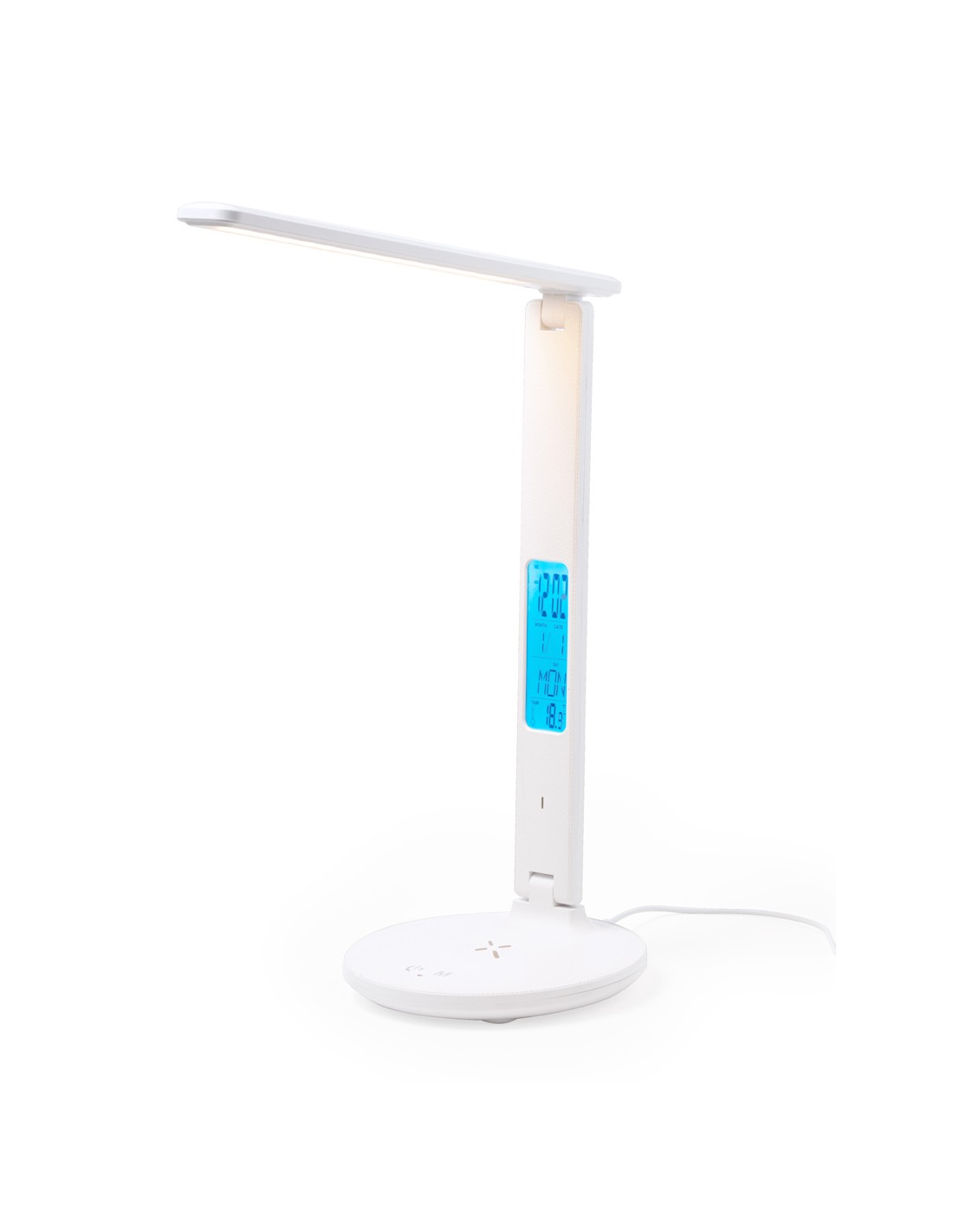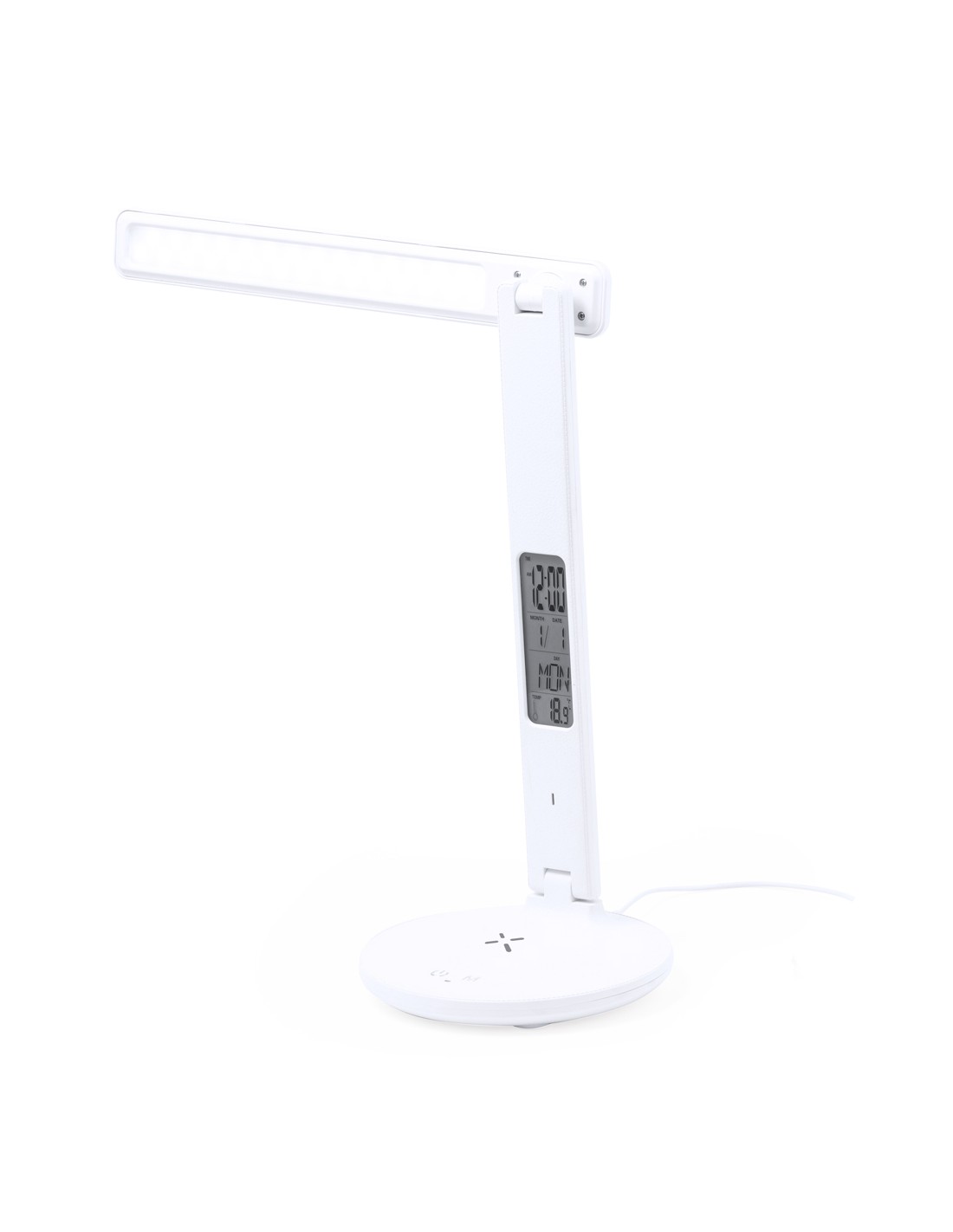 Lámpara multifunción plegable todo en uno, fabricada en resistente ABS blanco con acabado imitación piel. Provisto de 60 LEDs y 3 posiciones de iluminación (cálida, fría y media), con intensidad de luz regulable mediante el botón táctil de la base. Extensible y fácil de orientar, con pantalla de LCD integrada y retroiluminada, que marca hora, fecha, día y temperatura. Con botones de ajuste en la parte trasera y pila de botón incluida para guardar los datos. Incluye un cargador inalámbrico 10W integrado en la base, con entrada Tipo C y compatible con dispositivos móviles de carga inalámbrica. Con cable cargador Tipo C, y manual de instrucciones en español e inglés. Presentada en una atractiva caja de diseño kraft.