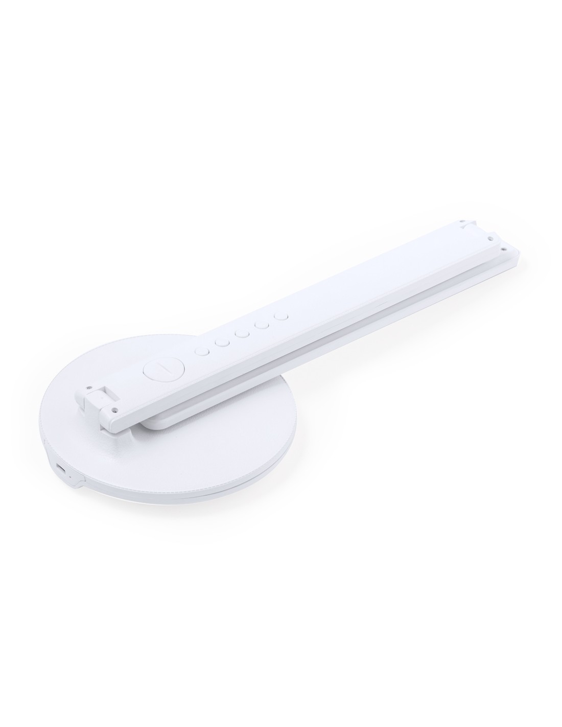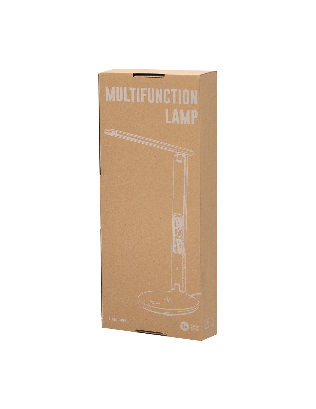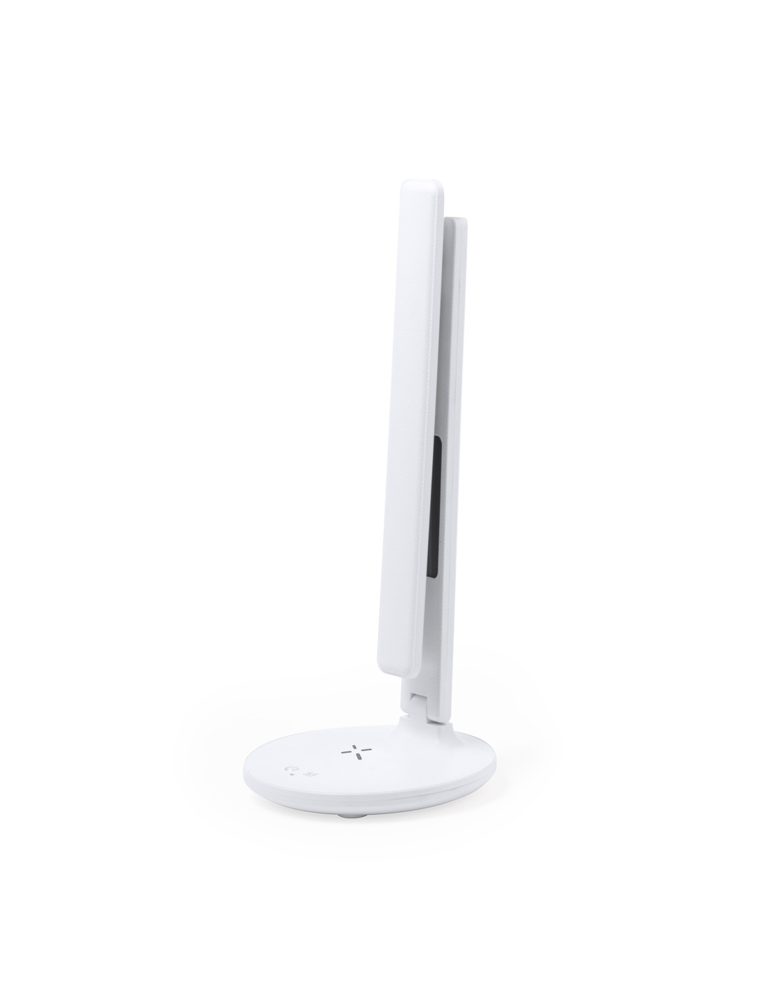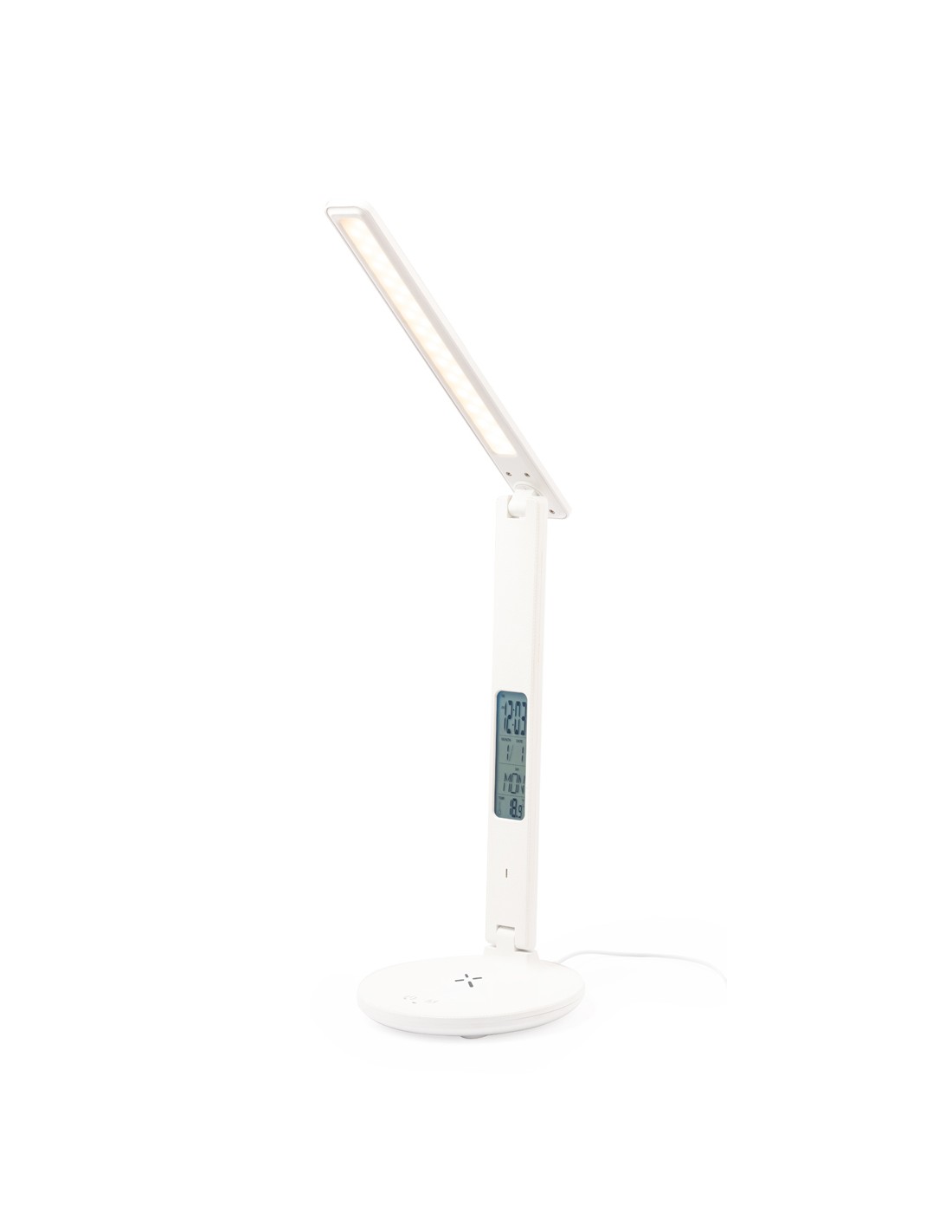 Lámpara multifunción plegable todo en uno, fabricada en resistente ABS blanco con acabado imitación piel. Provisto de 60 LEDs y 3 posiciones de iluminación (cálida, fría y media), con intensidad de luz regulable mediante el botón táctil de la base. Extensible y fácil de orientar, con pantalla de LCD integrada y retroiluminada, que marca hora, fecha, día y temperatura. Con botones de ajuste en la parte trasera y pila de botón incluida para guardar los datos. Incluye un cargador inalámbrico 10W integrado en la base, con entrada Tipo C y compatible con dispositivos móviles de carga inalámbrica. Con cable cargador Tipo C, y manual de instrucciones en español e inglés. Presentada en una atractiva caja de diseño kraft.