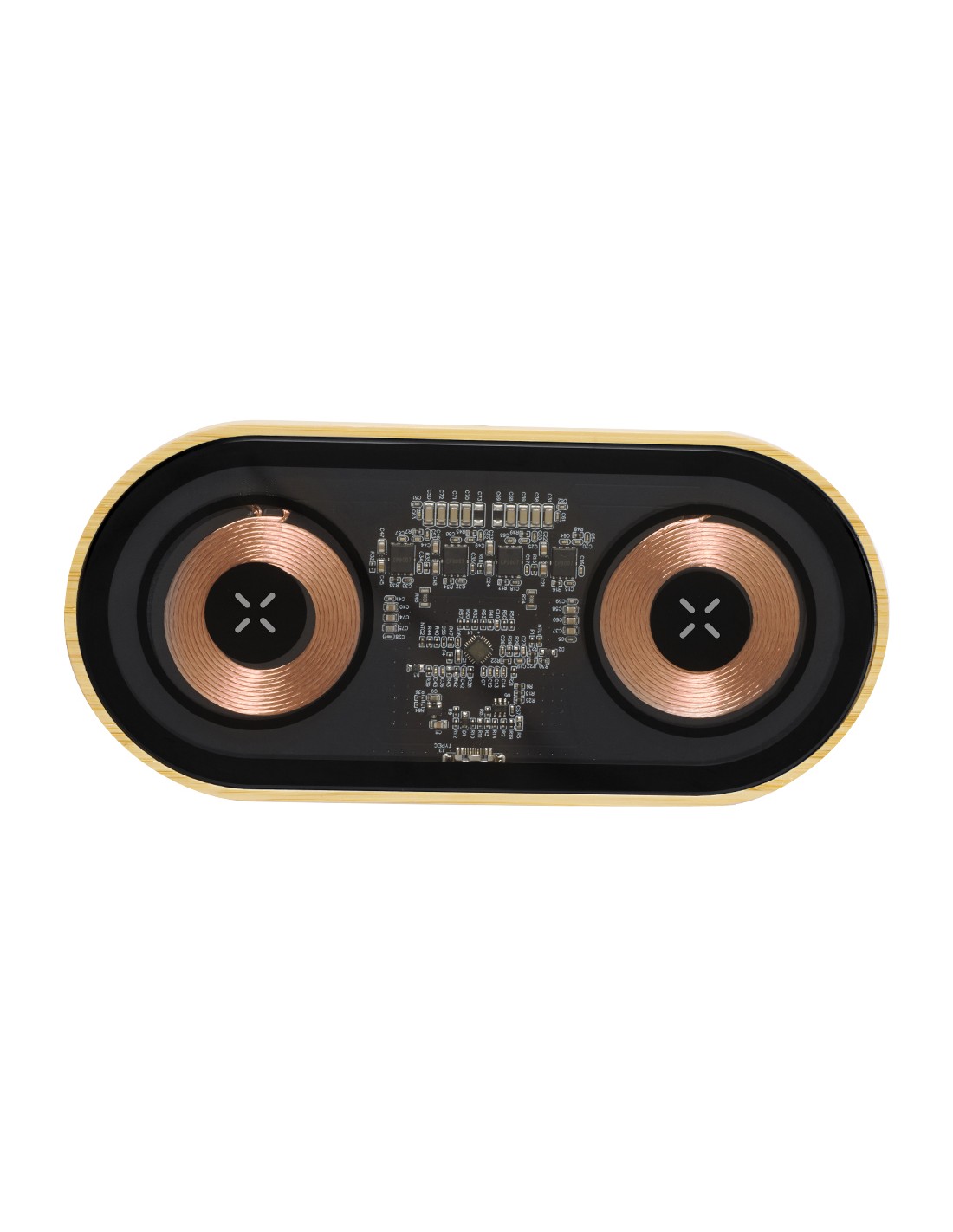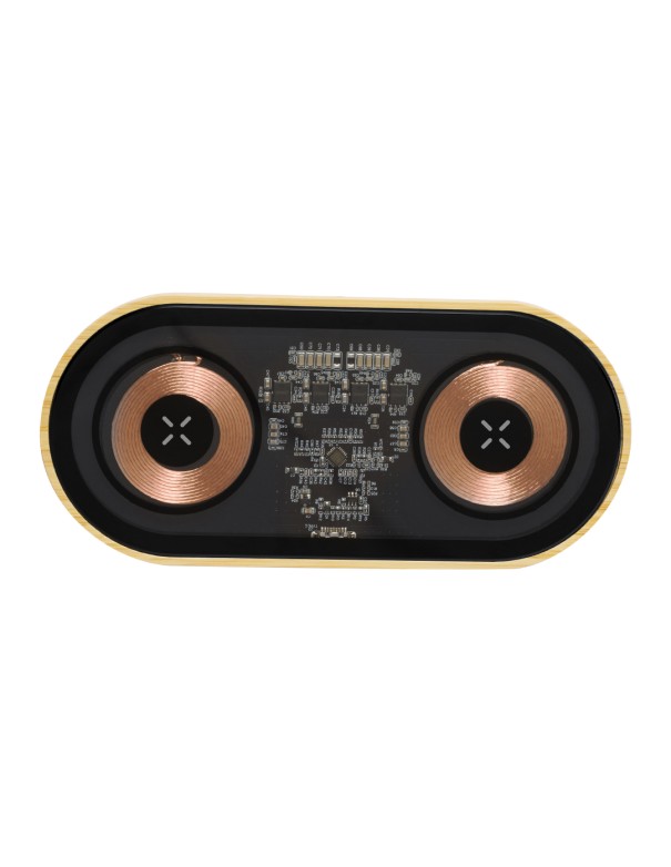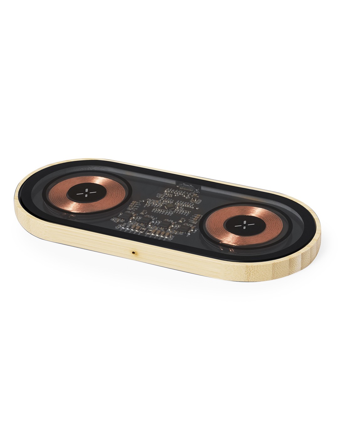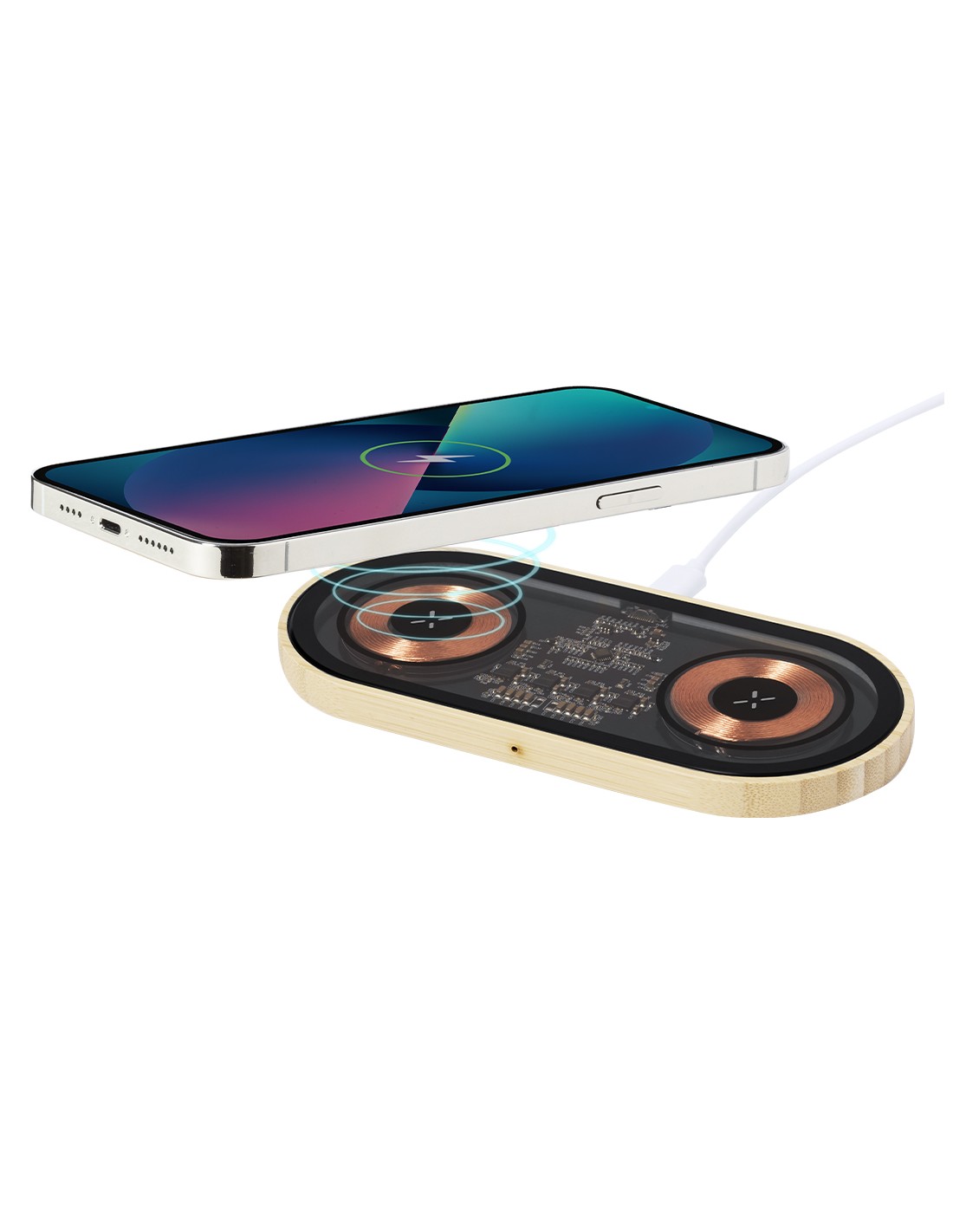 Cargador inalámbrico doble de 15W de original diseño y superficie transparente que permite ver los componentes internos del dispositivo. Con base de bambú, compatible con dispositivos con tecnología Qi, y que además permite cargar dos dispositivos simultáneamente. Conexión Tipo C, con instrucciones de uso en español e inglés. Presentado en caja individual de diseño kraft.Materiales como el bambú fomentan la utilización de materias primas naturales, reduciendo las emisiones contaminantes. Proviene de una planta de gran resistencia y versatilidad, con crecimiento y regeneración rápidos, siendo una excelente alternativa al uso de madera tradicional.Fabricado conforme a los estándares RoHS y en cumplimiento con los siguientes requisitos de seguridad:Sistema de protección contra sobrecalentamiento.Sistema de protección contra sobrecarga.Sistema de bloqueo para evitar cortocircuitos.