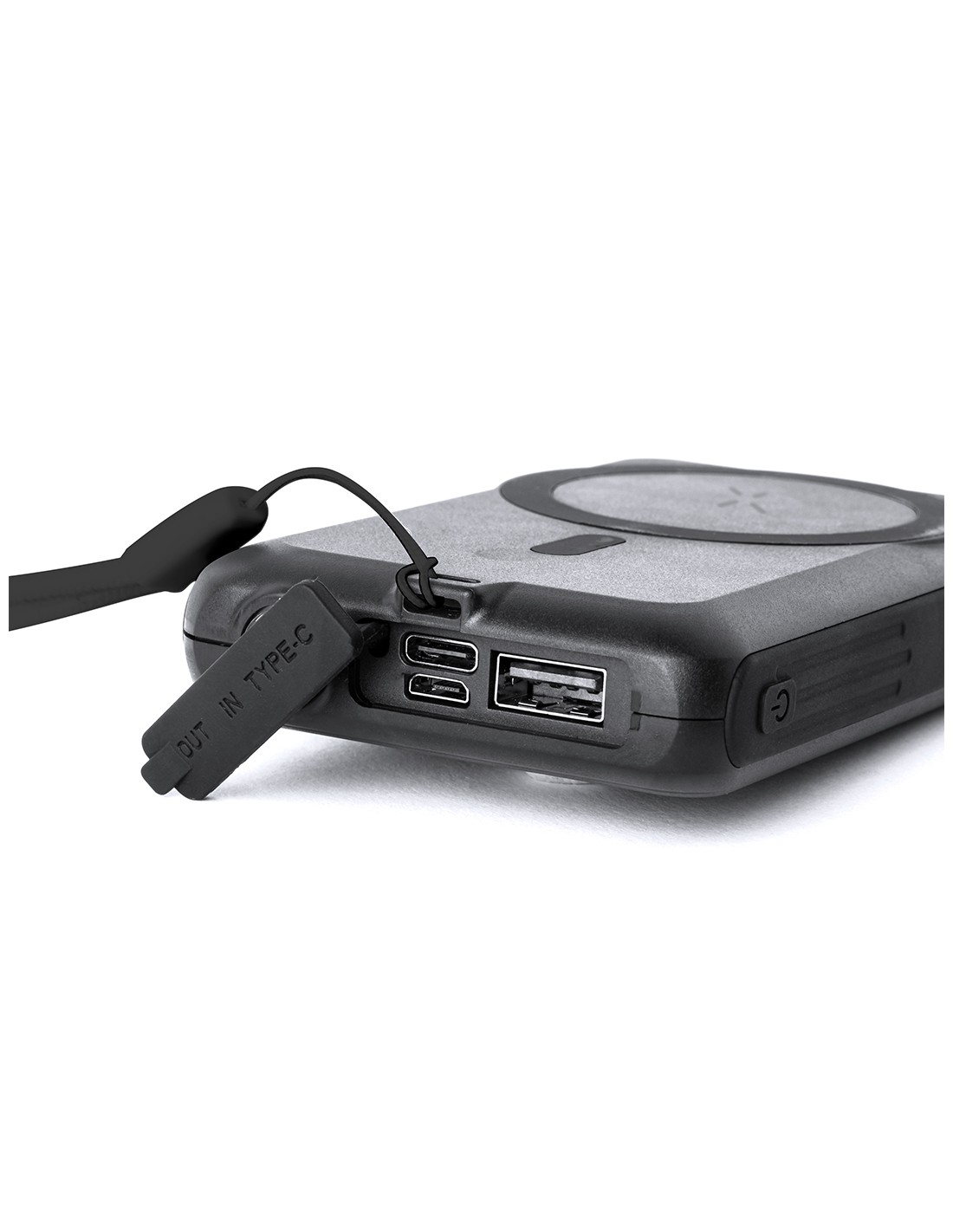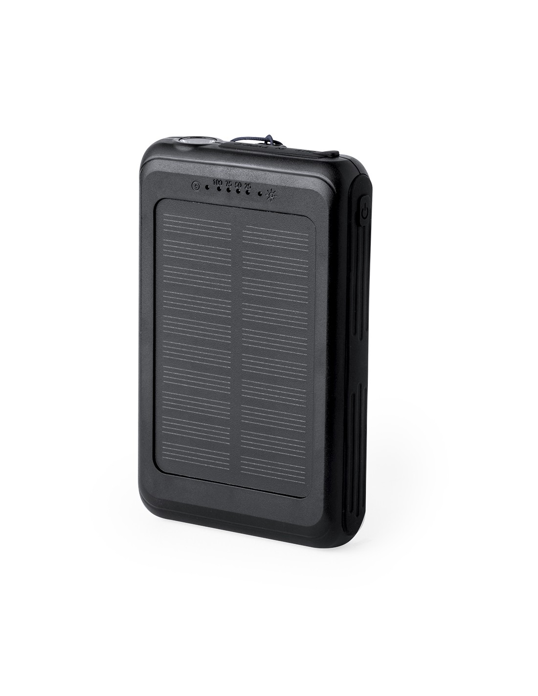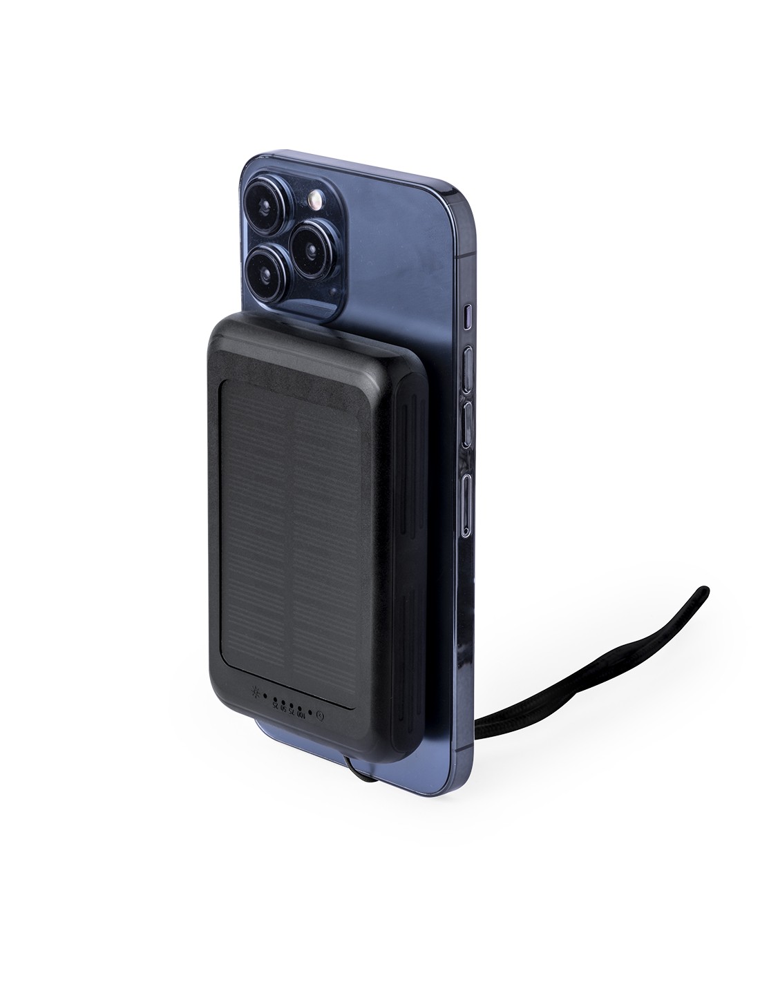 Batería auxiliar externa de recarga solar y de gran capacidad de carga -5.000 mAh-. Con cargador inalámbrico integrado 5W y fijación magnética Magsafe, permitiendo usar el dispositivo mientras se está cargando y compatible con dispositivos equipados con tecnología de carga inalámbrica Qi. Además, cuenta con una luz LED con dos posiciones de luz, fija e intermitente. Fabricada en resistente ABS de color negro, con conector de entrada/salida Tipo C + 1 salida USB + 1 entrada Micro USB. Presentada en atractiva caja individual de diseño.Las capacidades mostradas en todas nuestras baterías auxiliares externas son reales, incorporando todas ellas baterías de grado A y no recicladas, con una vida útil de al menos 500 ciclos de carga y según normativa CE. Además, están fabricadas conforme a los estándares RoHS y en cumplimiento con los siguientes requisitos de seguridad:Sistema de protección contra sobrecarga del power bank.Sistema de protección contra descarga completa que proporciona una mayor durabilidad del power bank.Sistema de bloqueo para evitar cortocircuitos.Sistema de transferencia de carga constante, acorde con la capacidad del dispositivo de destino.
