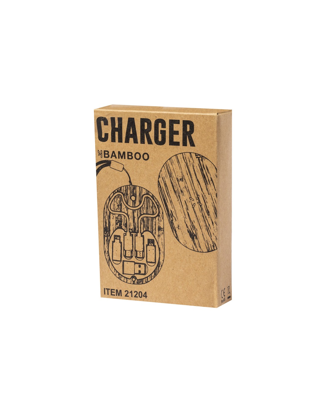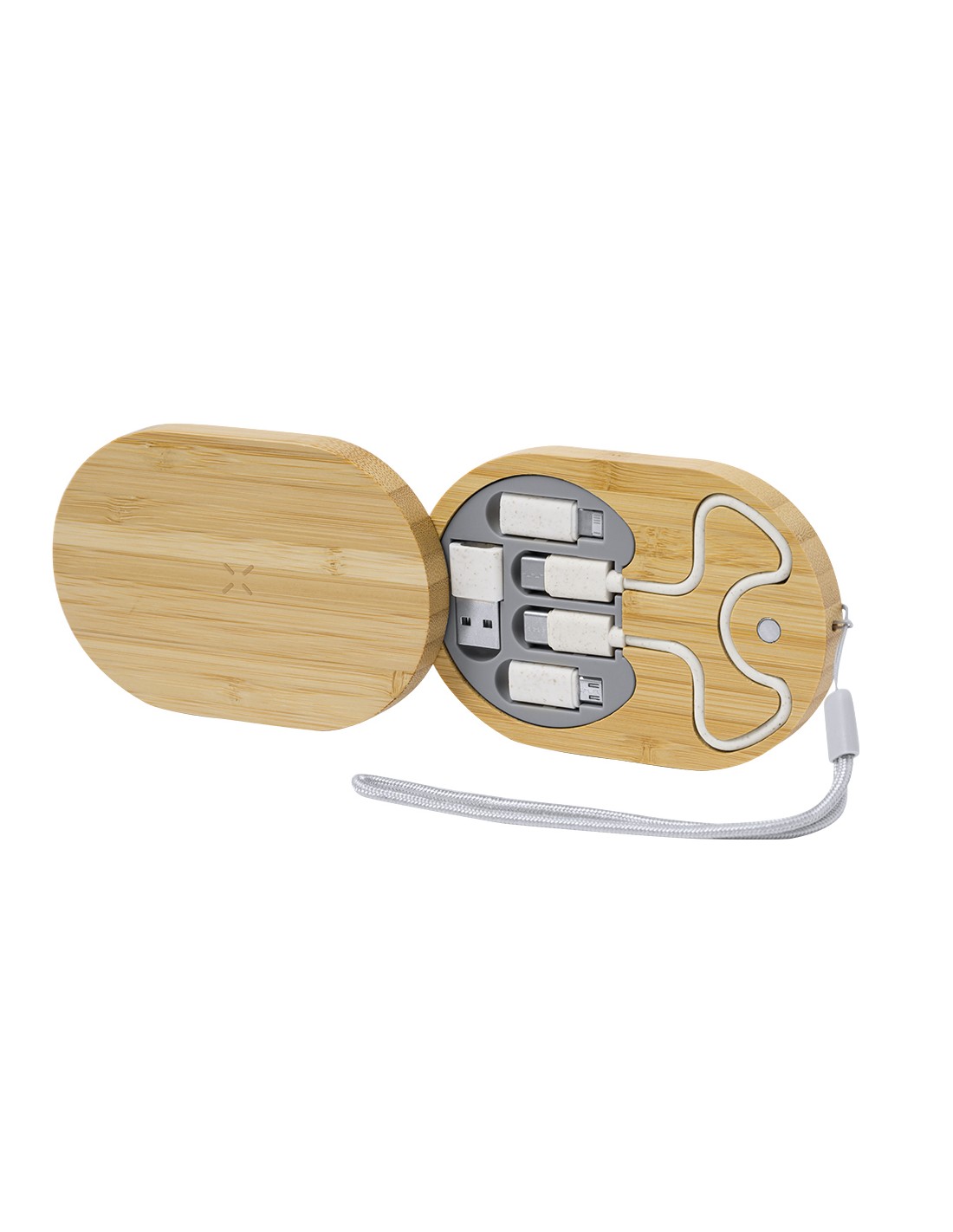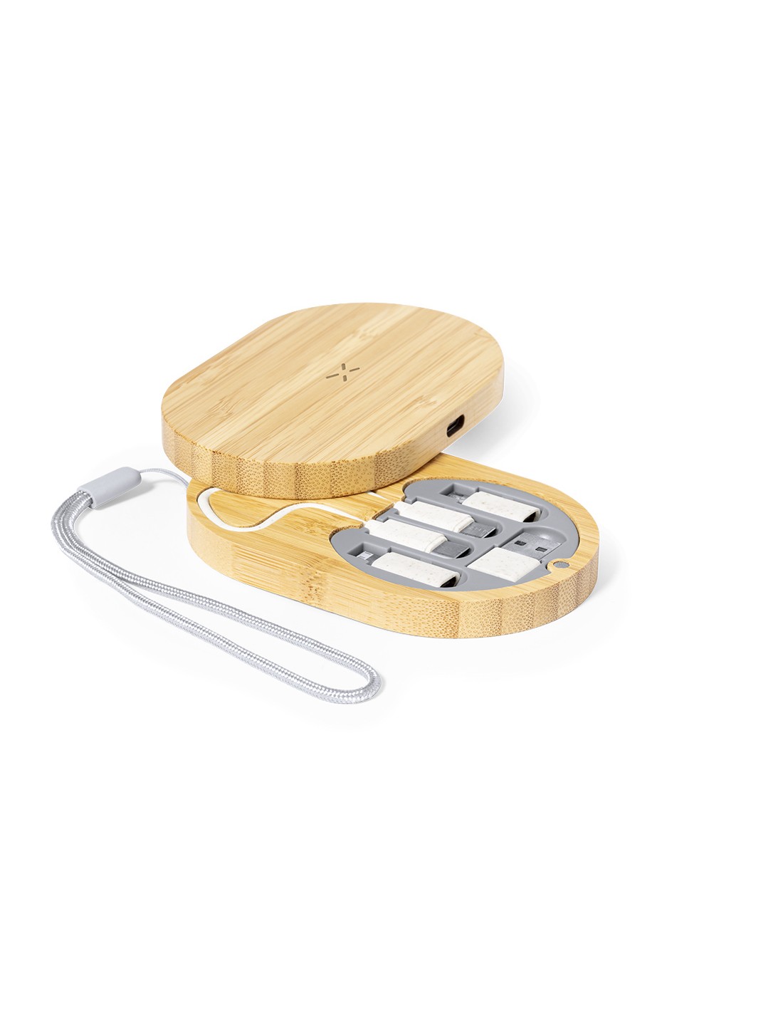 Completo conjunto de cargador inalámbrico 15W y cables cargadores. Fabricado en bambú pulido, en un original diseño de estuche con cargador inalámbrico integrado en la tapa y una base troquelada, que incluye un completo set de cables y adaptadores. Cargador compatible con dispositivos equipados con tecnología Qi. Set cables de carga con capacidad de transferencia de datos y múltiples conexiones: Micro USB, Tipo C y Lightning. 5V DC 3A. Presentado en caja diseño kraft.Materiales como el bambú fomentan la utilización de materias primas naturales, reduciendo las emisiones contaminantes. Proviene de una planta de gran resistencia y versatilidad, con crecimiento y regeneración rápidos, siendo una excelente alternativa al uso de madera tradicional.Fabricado conforme a los estándares RoHS y en cumplimiento con los siguientes requisitos de seguridad:Sistema de protección contra sobrecalentamiento.Sistema de protección contra sobrecarga.Sistema de bloqueo para evitar cortocircuitos.