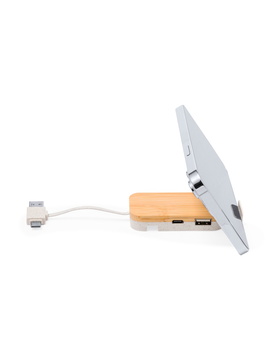 Puerto USB 2.0 con soporte para móvil extraíble integrado en la base. Parte superior del dispositivo fabricada en bambú, con base en caña de trigo. Con conexión dual USB/Tipo C y 3 puertos: 1 puerto Tipo C y 2 puertos USB. Presentado en caja individual de diseño kraft.La caña de trigo fomenta la utilización de materias primas naturales, reduciendo así las emisiones contaminantes.Materiales como el bambú fomentan la utilización de materias primas naturales, reduciendo las emisiones contaminantes. Proviene de una planta de gran resistencia y versatilidad, con crecimiento y regeneración rápidos, siendo una excelente alternativa al uso de madera tradicional.Fabricado conforme a estándares RoHS, con sistema de bloqueo para evitar cortocircuitos.