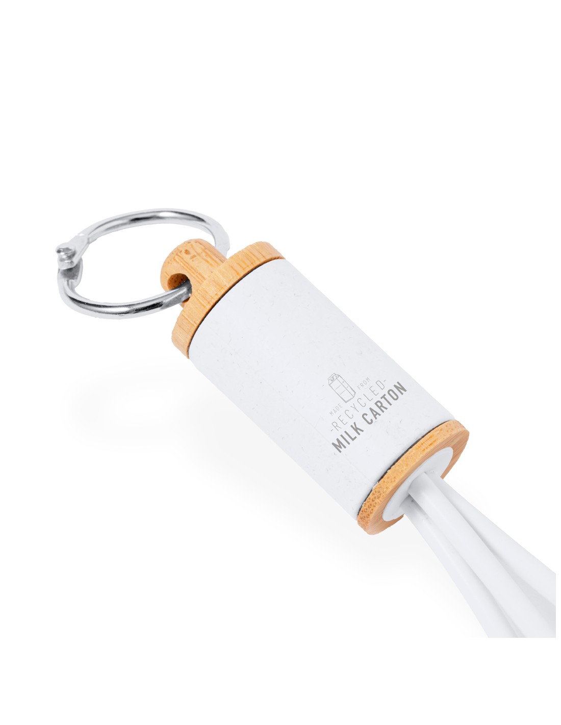 Cable cargador fabricado en combinación de bambú y material reciclado a partir de cartones de leche. Incluye conexión dual USB/Tipo C + conexiones Micro USB, Tipo C y Lightning. Con original anilla de transporte y logotipo cartones de leche reciclados. Presentado en caja individual de diseño kraft, con papel protector incluido. 5V DC 2.4A.Los cartones de leche se componen en su mayor parte de cartón y aluminio. Durante su proceso de reciclado, se separan los distintos materiales del envase para su reutilización y nuevo uso, contribuyendo así a recorrer el camino infinito de la economía circular. Este material se caracteriza por su alto grado de reciclabilidad, así como por su ligereza y resistencia.Materiales como el bambú fomentan la utilización de materias primas naturales, reduciendo las emisiones contaminantes. Proviene de una planta de gran resistencia y versatilidad, con crecimiento y regeneración rápidos, siendo una excelente alternativa al uso de madera tradicional.Fabricado conforme a estándares RoHS, con sistema de bloqueo para evitar cortocircuitos.