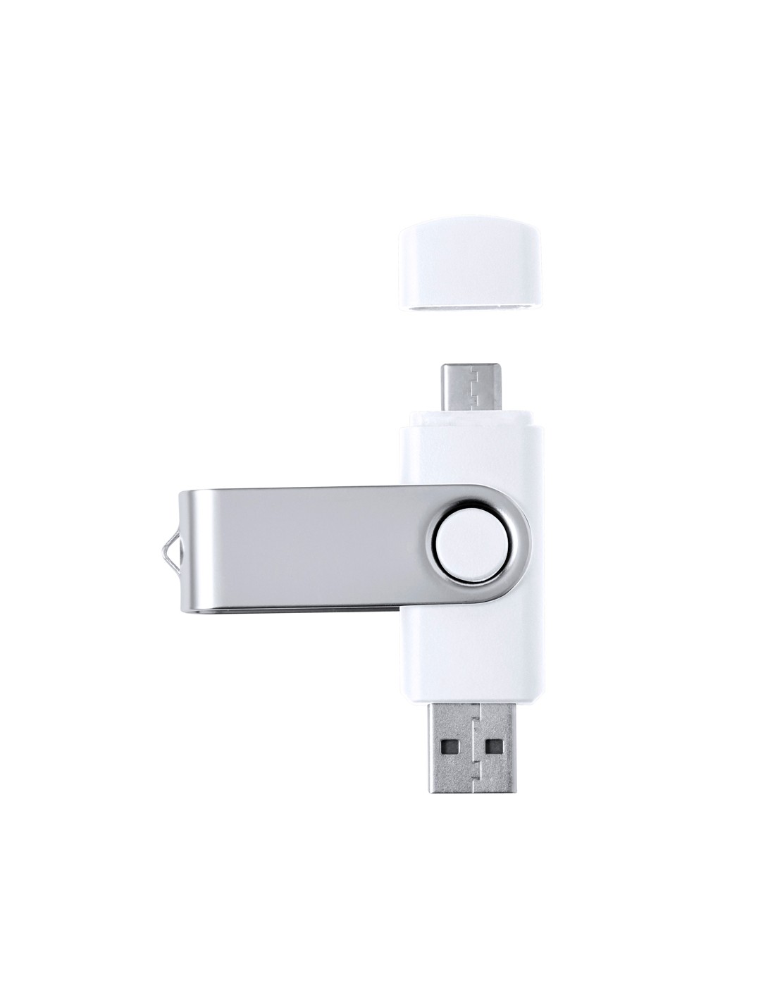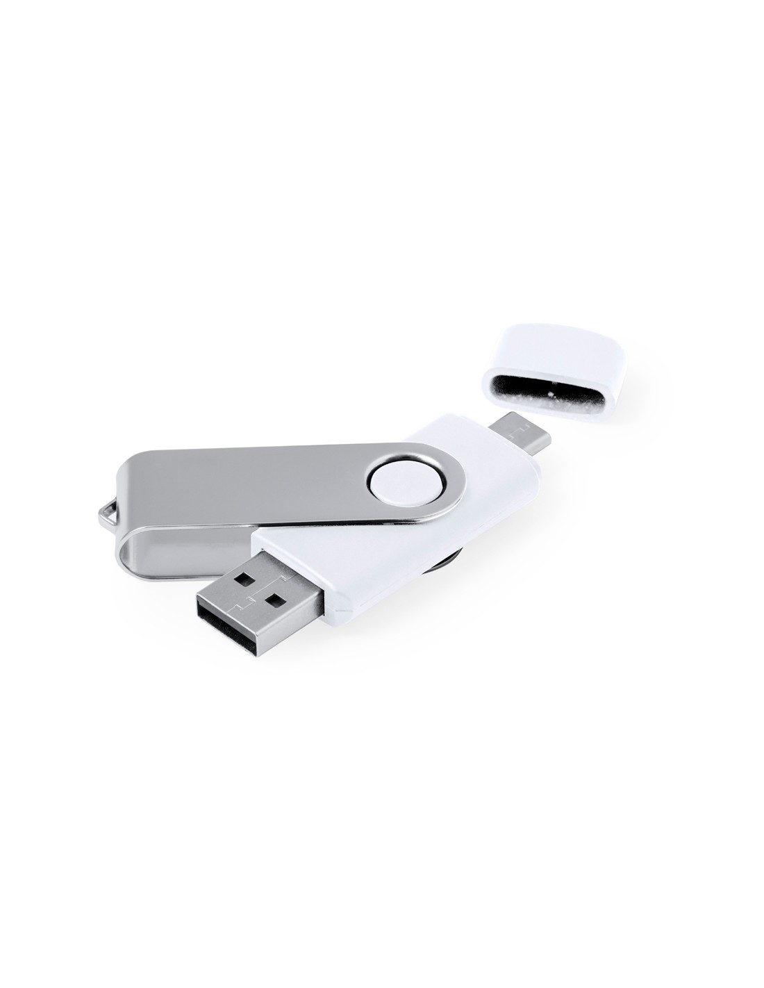 Memoria USB 3.0 de 16GB de capacidad. Con clip metálico y cuerpo de suave acabado en color blanco. Conexiones USB y Tipo C. Presentada en estuche individual.
